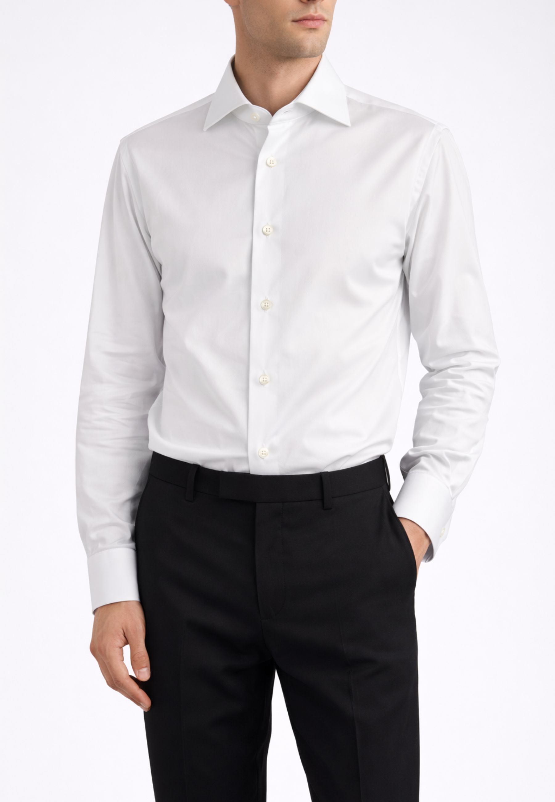 Il modello presenta un design classico e raffinato con colletto tradizionale, chiusura frontale con bottoni e polsini strutturati. La linea pulita e la costruzione curata valorizzano la silhouette maschile mantenendo uno stile elegante e contemporaneo.