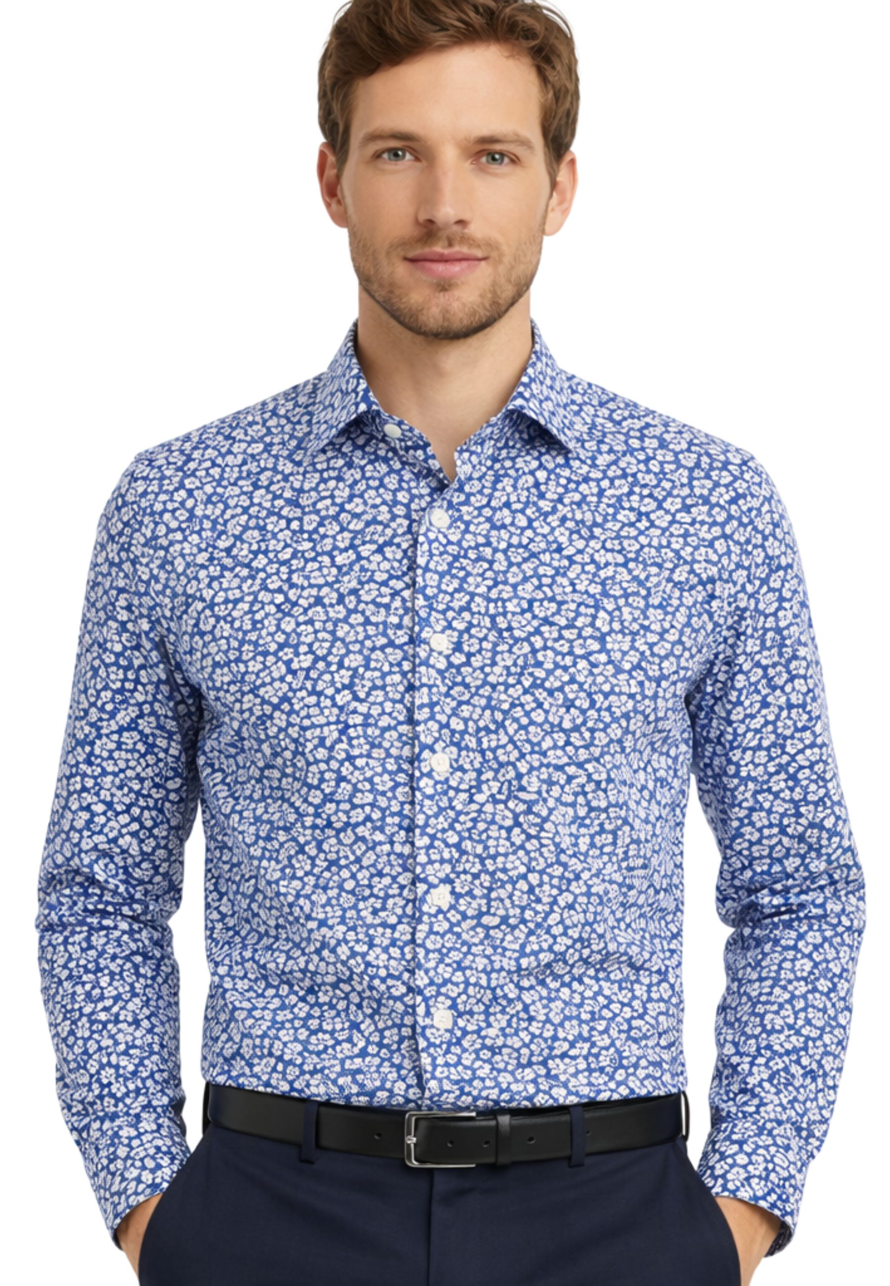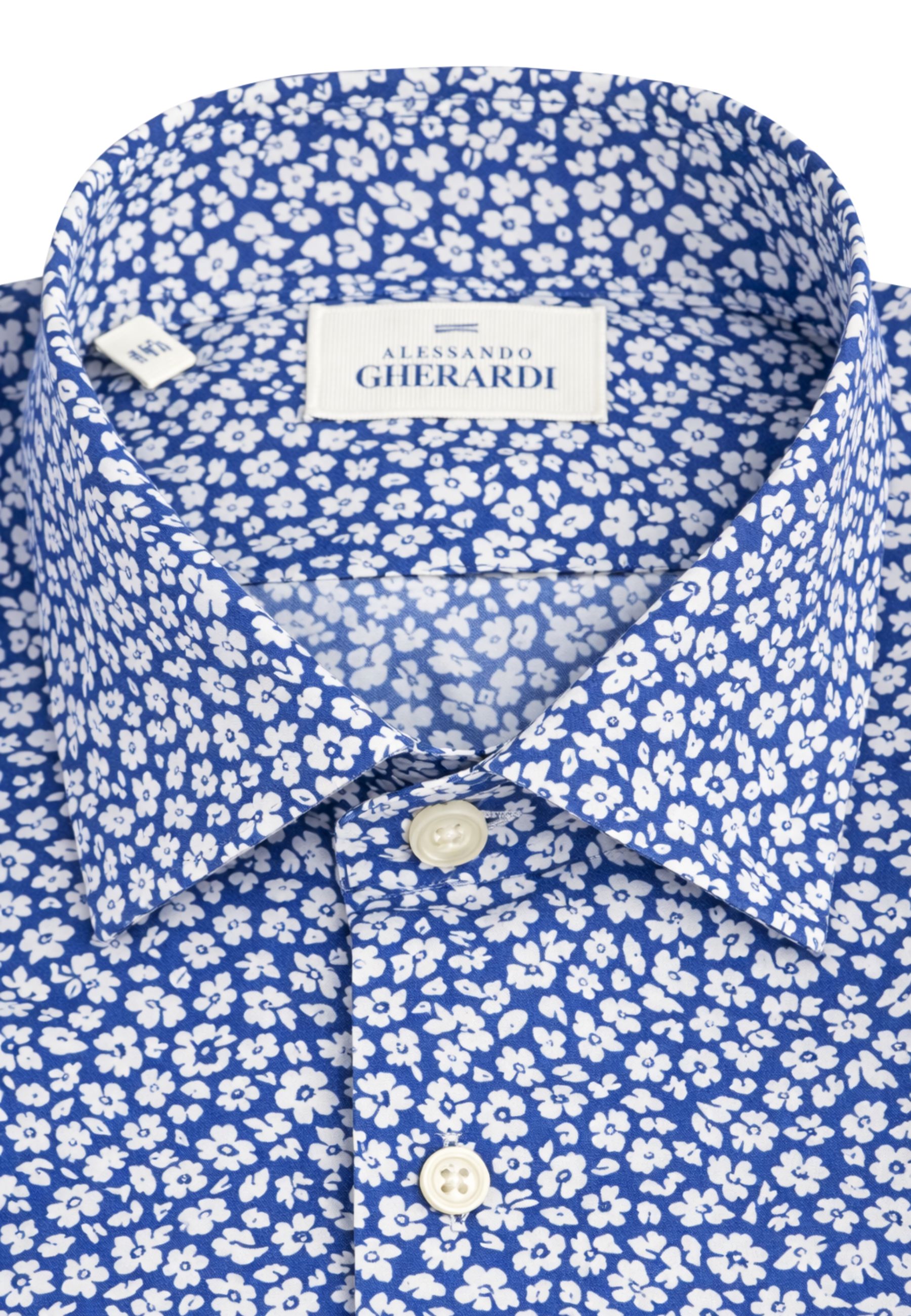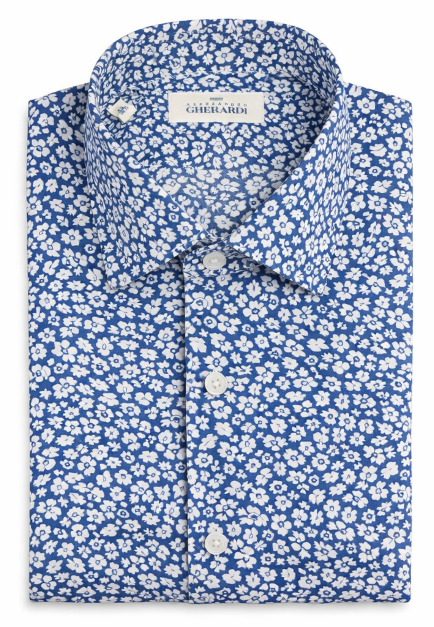 Elegante e distintiva, questa camicia firmata Alessandro Gherardi interpreta il gusto sartoriale italiano con una raffinata fantasia floreale su fondo blu. Il design ricercato e la qualità dei materiali la rendono un capo ideale per arricchire il guardaroba maschile con un tocco di personalità.