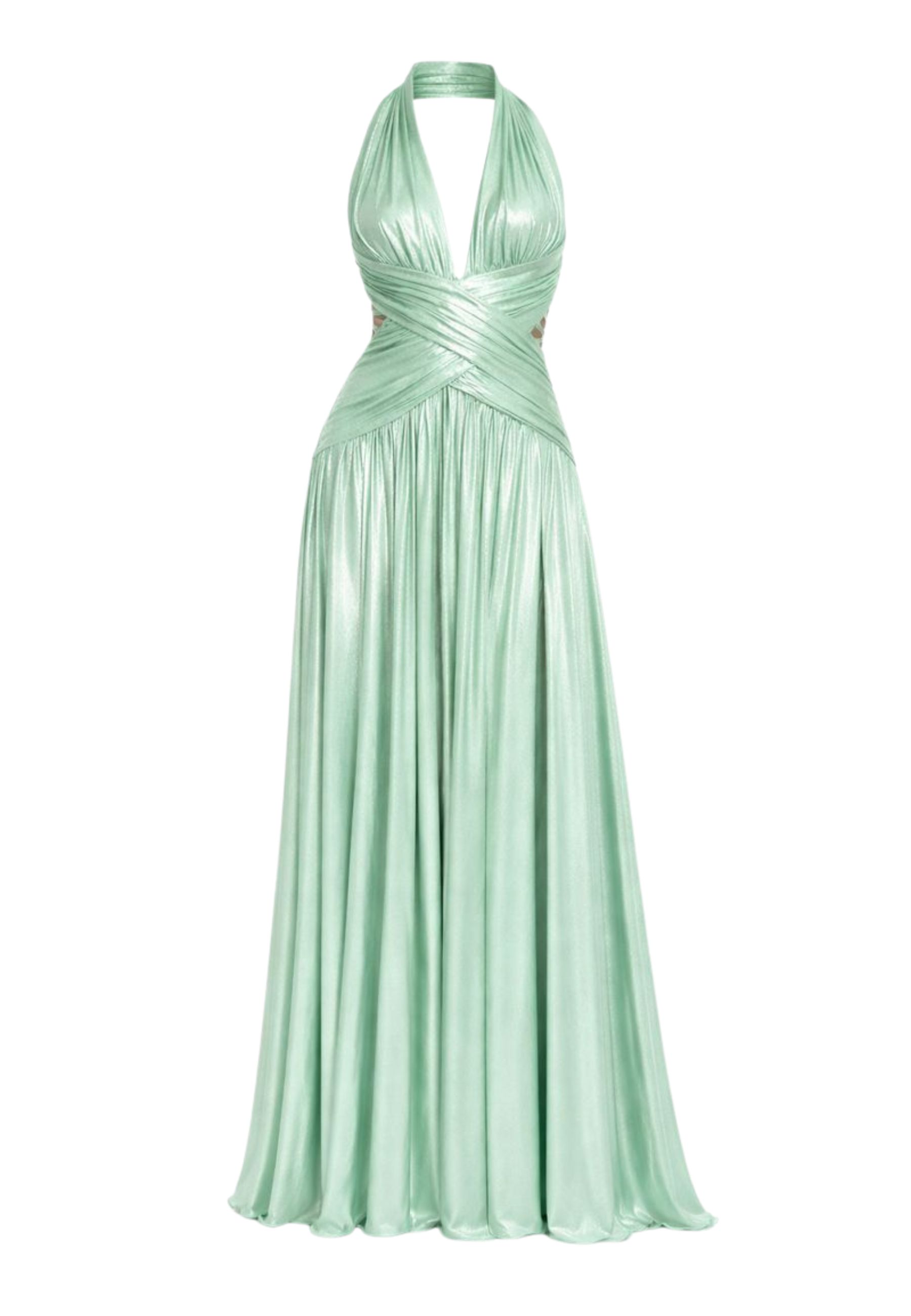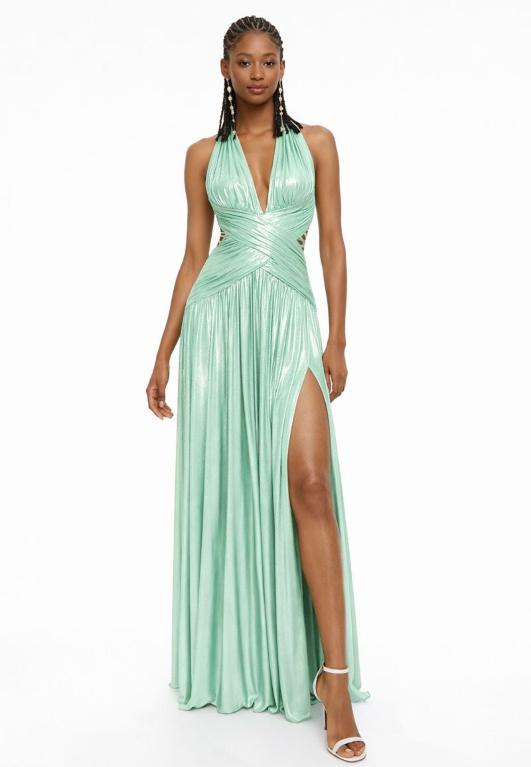 Abito lungo elegante caratterizzato da un design raffinato e femminile, realizzato in tessuto metallizzato plissé dalleffetto luminoso e fluido. Il modello presenta un scollo profondo a V con allacciatura halter che valorizza il décolleté, mentre la costruzione incrociata in vita definisce la silhouette con equilibrio ed eleganza.