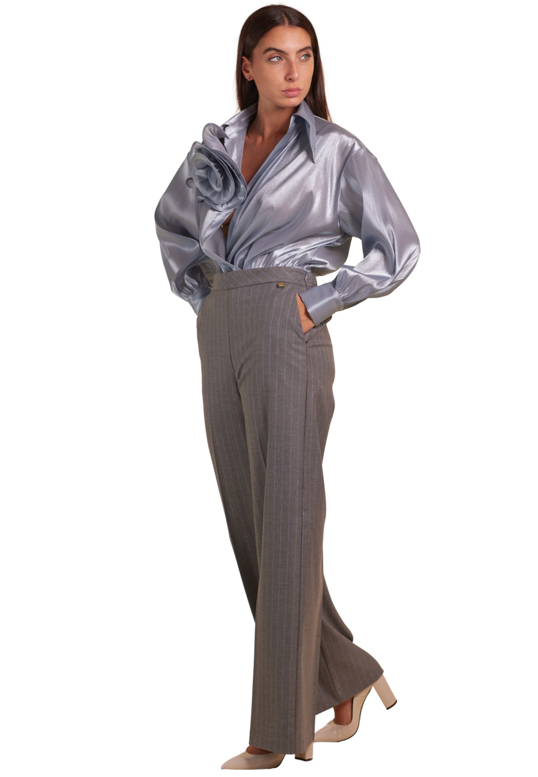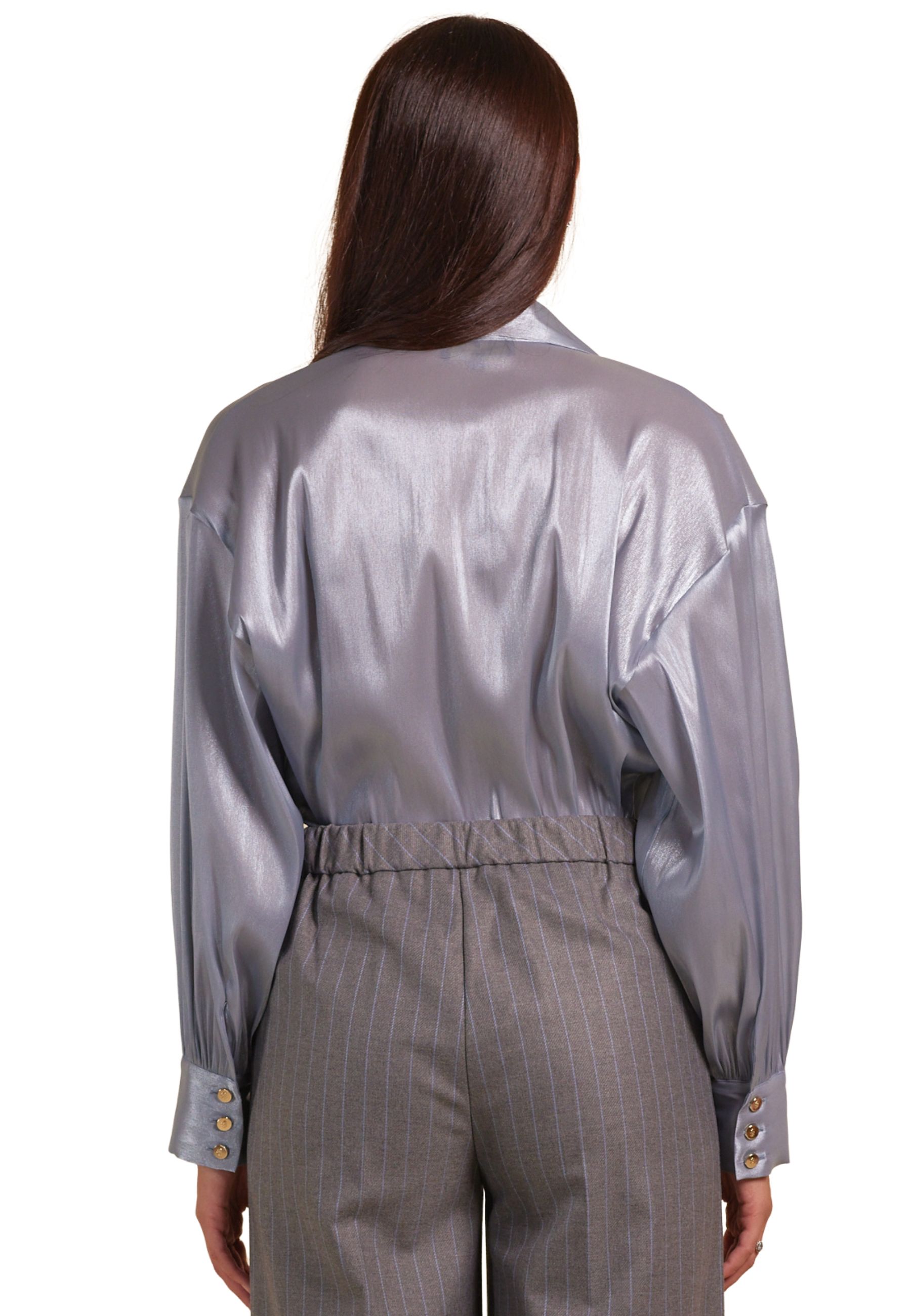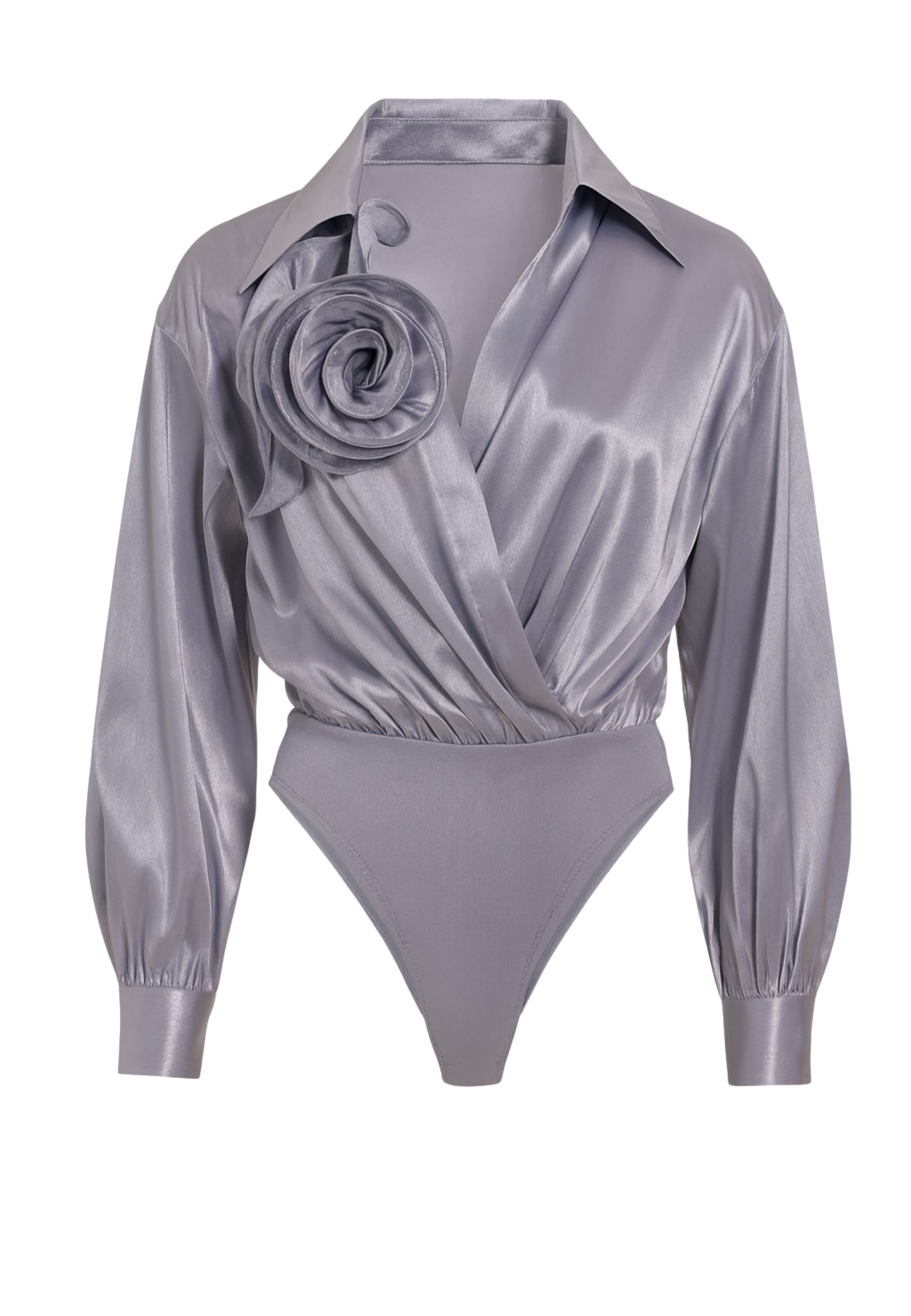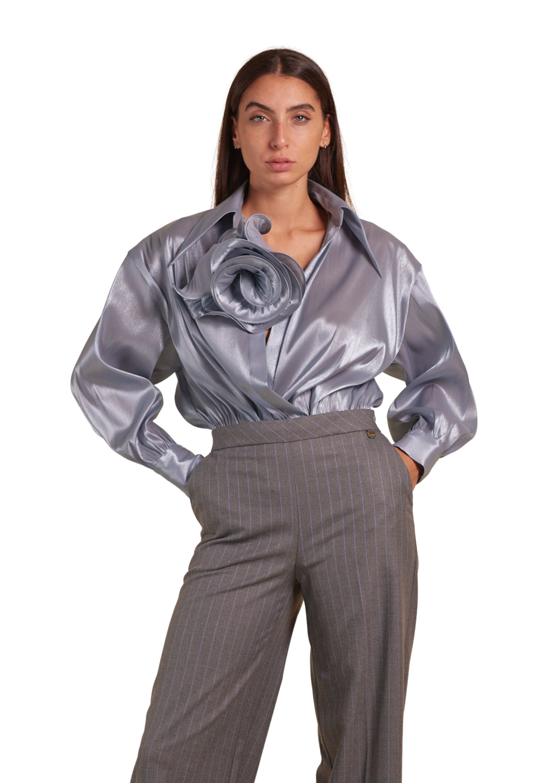 Eleganza e femminilità si incontrano in questa camicia body incrociata firmata Babylon. Realizzata in tessuto satinato dalla finitura lucida, si distingue per il design raffinato con scollo a V incrociato e la maxi spilla a forma di fiore applicata sul davanti, dettaglio iconico e sofisticato.