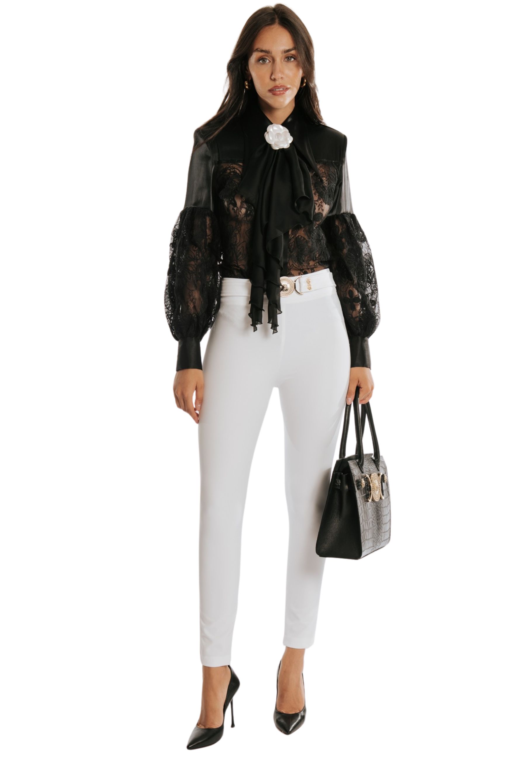 Un capo esclusivo che unisce romanticismo e raffinatezza. Questa camicia in pizzo trasparente e raso lucente è impreziosita da dettagli sofisticati: la fusciacca in raso con maxi fiocco sul davanti, decorata da una camelia applicata, dona un tocco iconico e femminile. I bottoni metallici dorati arricchiscono ulteriormente il design, mentre le maniche ampie in pizzo con polsini strutturati in raso creano un elegante gioco di trasparenze.