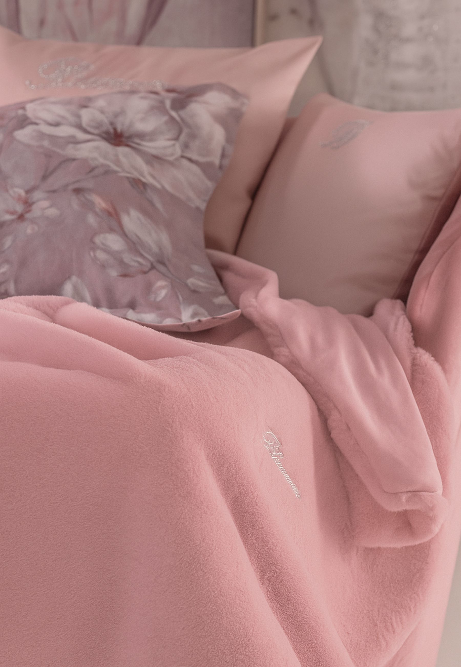 Lussuoso copriletto matrimoniale Blumarine New Blanca realizzato in morbida ecopelliccia nella raffinata tonalità cipria, impreziosito dal logo Blumarine in cristalli Swarovski® applicato su nastro gros-grain. Il retro in velluto tinta unita esalta leleganza e la morbidezza del capo, donando un comfort avvolgente e uno stile ricercato alla camera da letto.