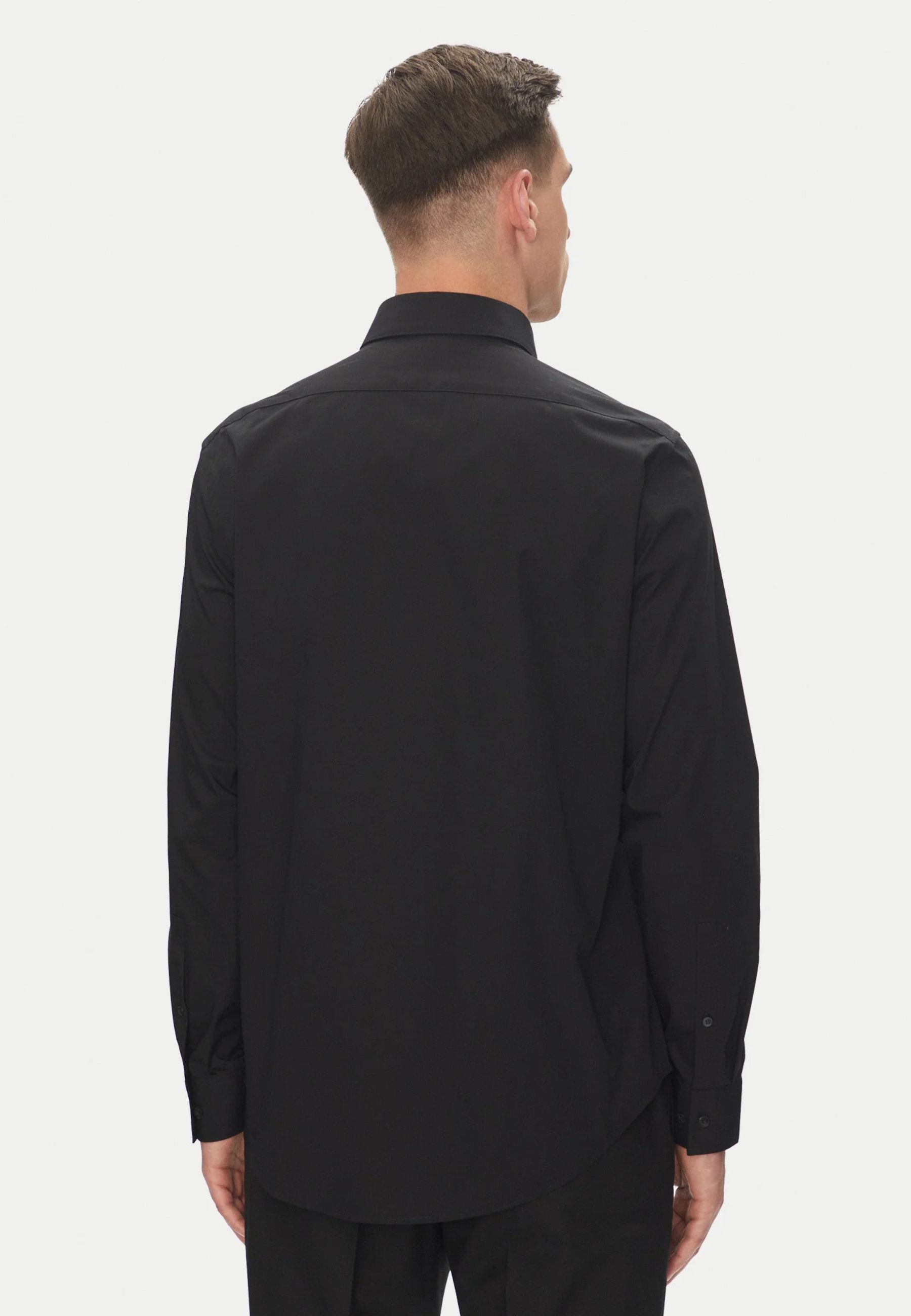 Camicia nera da uomo Calvin Klein della linea Essential, dal design pulito e contemporaneo. Realizzata in cotone stretch di alta qualità, offre una vestibilità regular fit che garantisce comfort e libertà di movimento per tutta la giornata. Il modello è caratterizzato da un colletto classico, chiusura frontale con bottoni tono su tono, maniche lunghe con polsini regolabili e un retro liscio senza pince, per un look minimal e sofisticato.