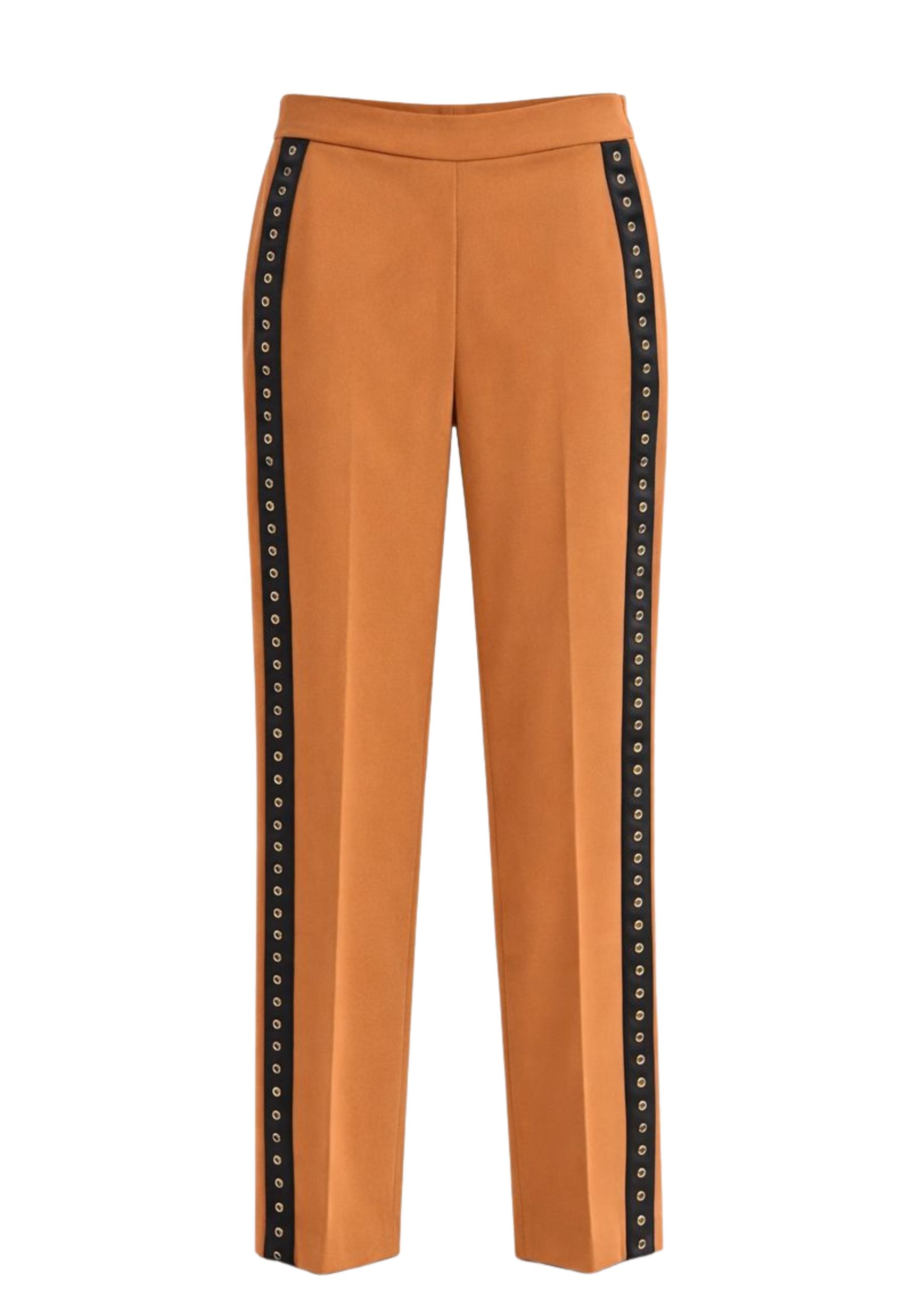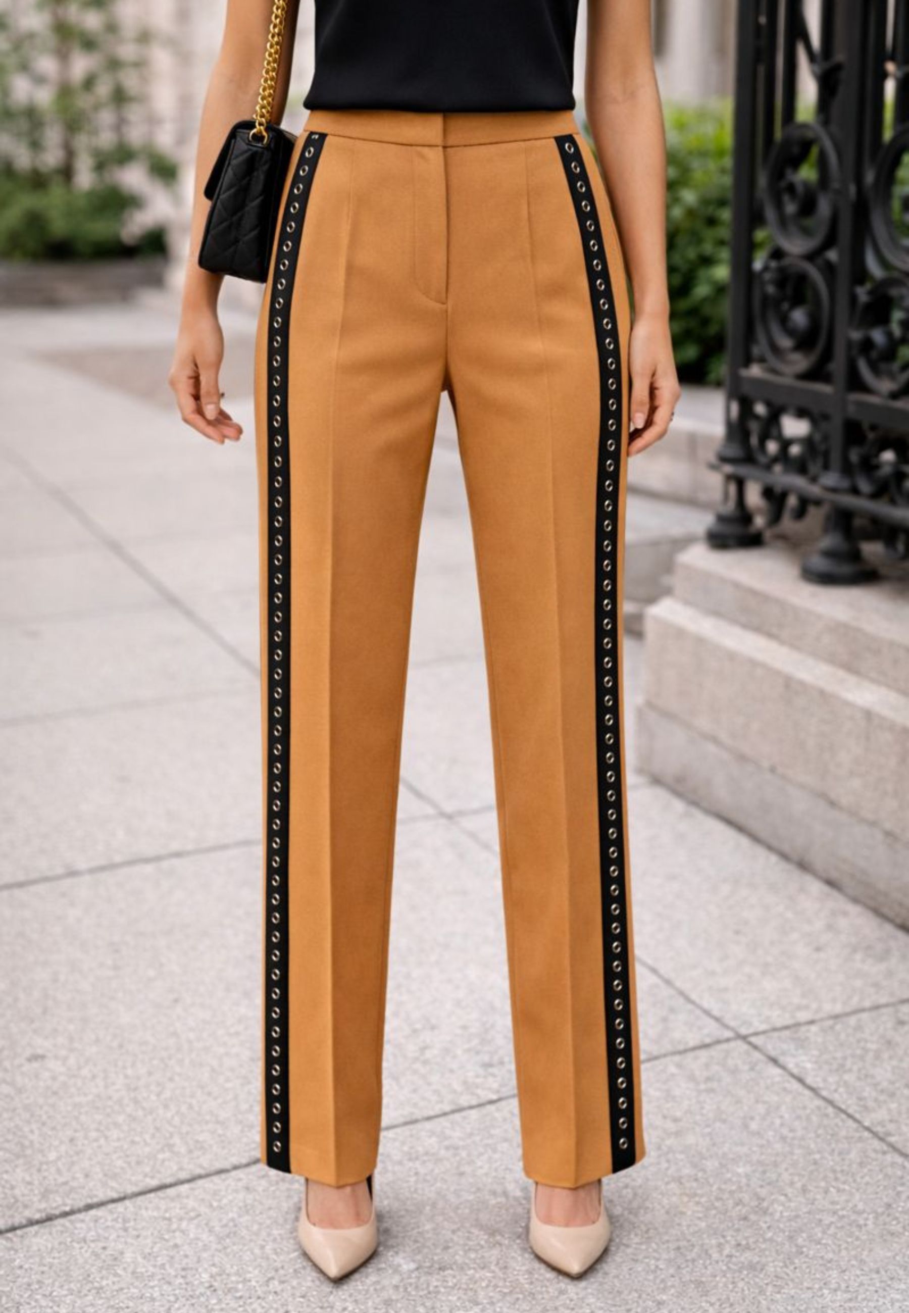 La gamba dritta è impreziosita da bande laterali a contrasto arricchite da occhielli metallici, dettaglio distintivo che dona carattere e richiama uno stile urban-chic. La piega centrale frontale slancia la silhouette, rendendo il capo adatto sia a look eleganti che a outfit più grintosi.