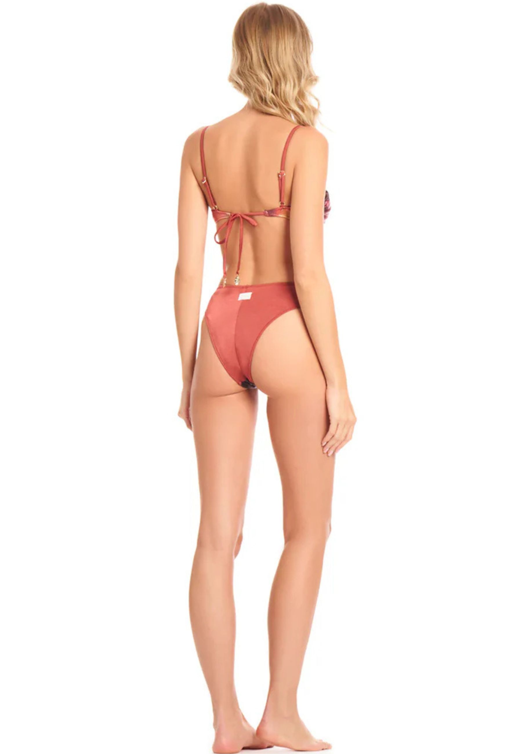 Bikini donna due pezzi dal design ricercato, realizzato in lycra placcata con raffinato effetto sfumato multicolor che dona luminosità e carattere al capo. Il top con bretelle sottili regolabili è dotato di coppe estraibili, pensate per offrire comfort e una vestibilità personalizzabile. Lo slip a media copertura garantisce equilibrio tra femminilità e praticità, valorizzando la silhouette con una linea pulita ed essenziale. Un modello distintivo, ideale per un beachwear elegante e contemporaneo.