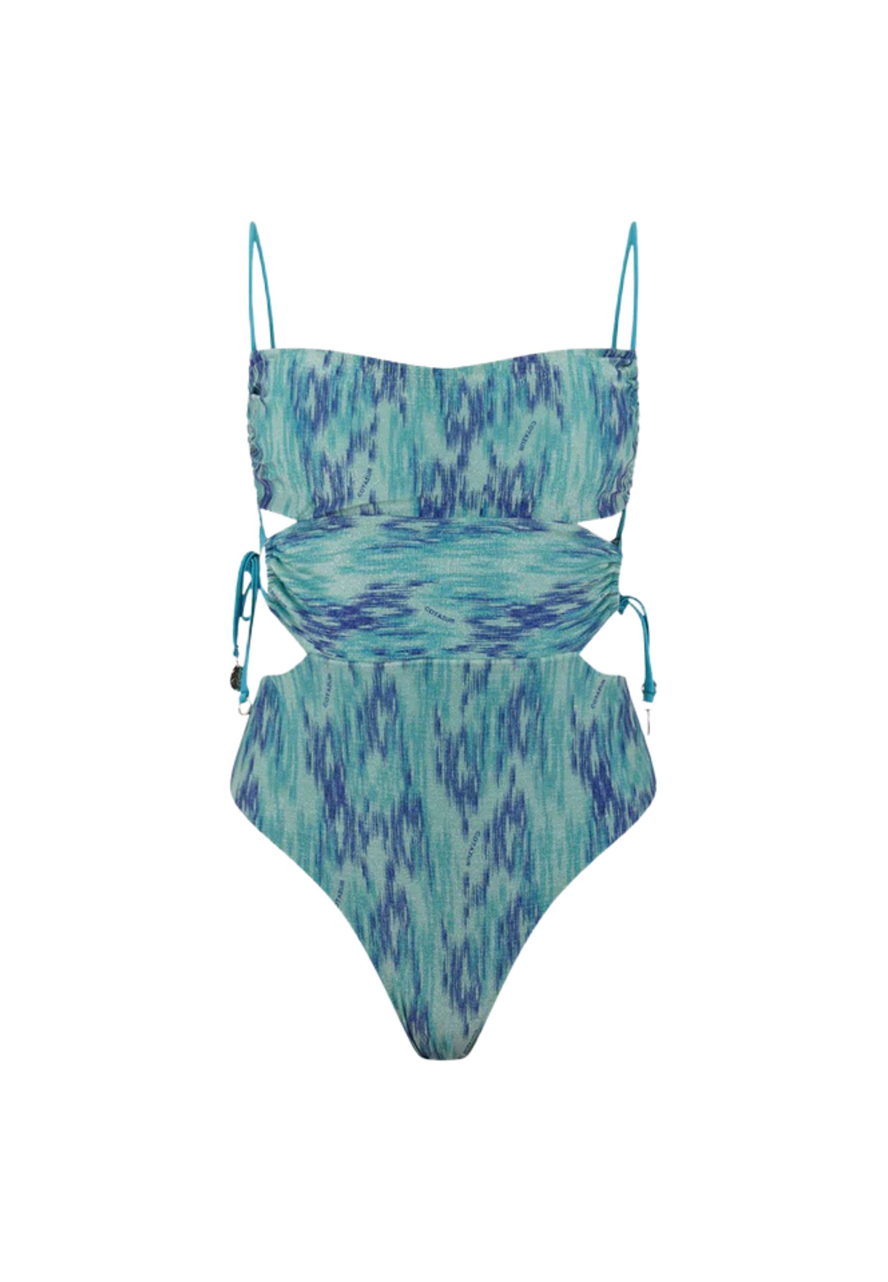 Costume intero dal design moderno e femminile, realizzato in tessuto elasticizzato con stampa astratta nei toni del turchese e del verde. Il modello presenta spalline sottili regolabili e un elegante cut-out laterale con laccetti, dettaglio che valorizza il punto vita e dona dinamismo alla silhouette. La linea sgambata slancia la figura, mentre la struttura del busto garantisce comfort e sostegno. Un capo distintivo, pensato per un beachwear contemporaneo e di carattere.
