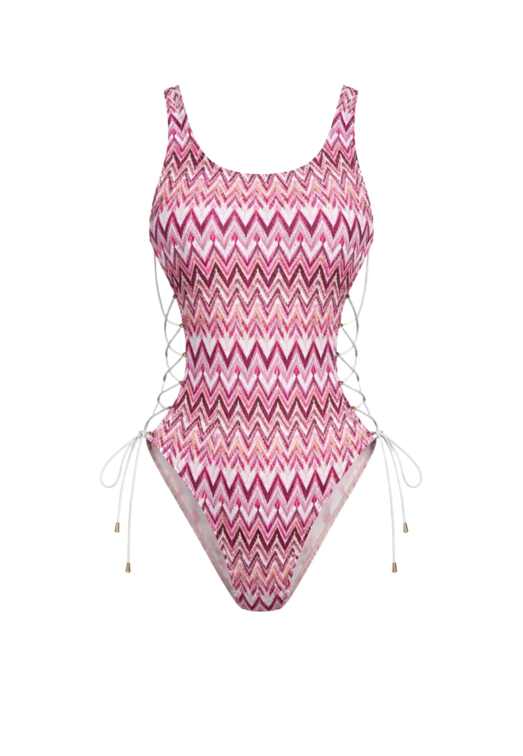 Costume intero donna dal design deciso e contemporaneo, realizzato in lycra stampata con motivo zig-zag multicolor che valorizza la silhouette e dona carattere al capo. Il modello presenta una linea essenziale sul davanti, mentre i laccetti laterali regolabili con occhielli e terminali metallici permettono di modulare la vestibilità, enfatizzando il punto vita. La sgambatura slancia la figura, garantendo al contempo comfort e libertà di movimento. Un costume pensato per un beachwear sofisticato e distintivo.