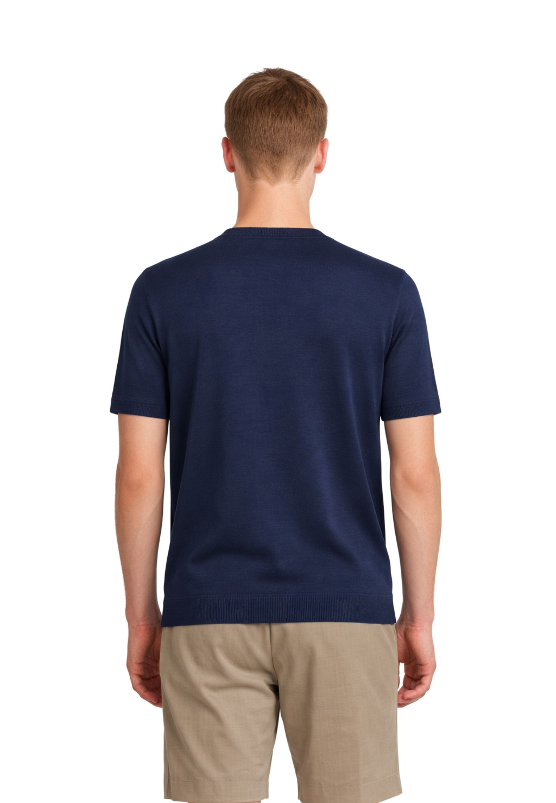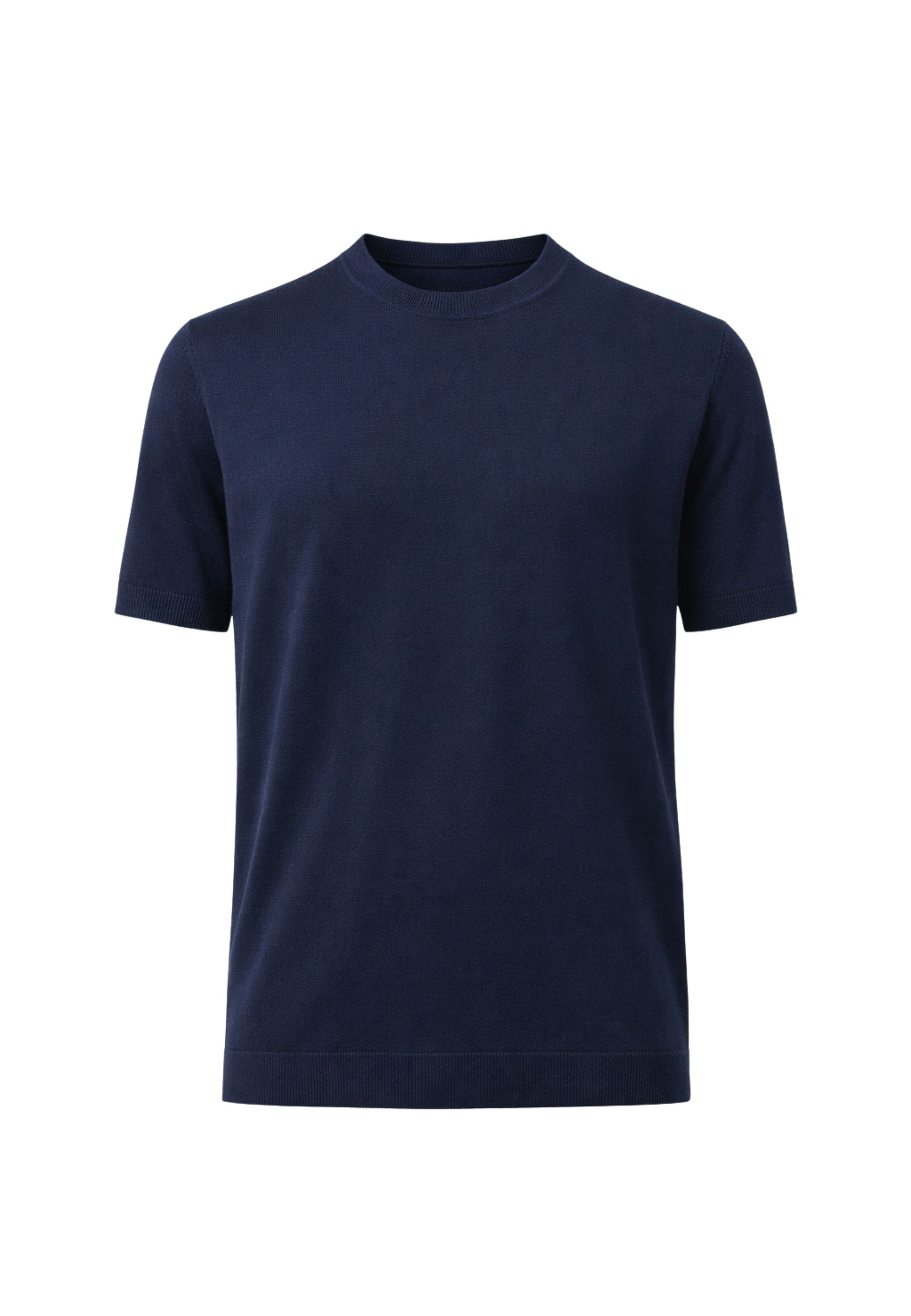 Il modello presenta girocollo classico, maniche corte e finiture a costine su collo, fondo e maniche, che valorizzano la struttura del capo e assicurano una vestibilità confortevole. La texture del filato dona un aspetto pulito e sofisticato, ideale sia per look casual sia per abbinamenti più curati.