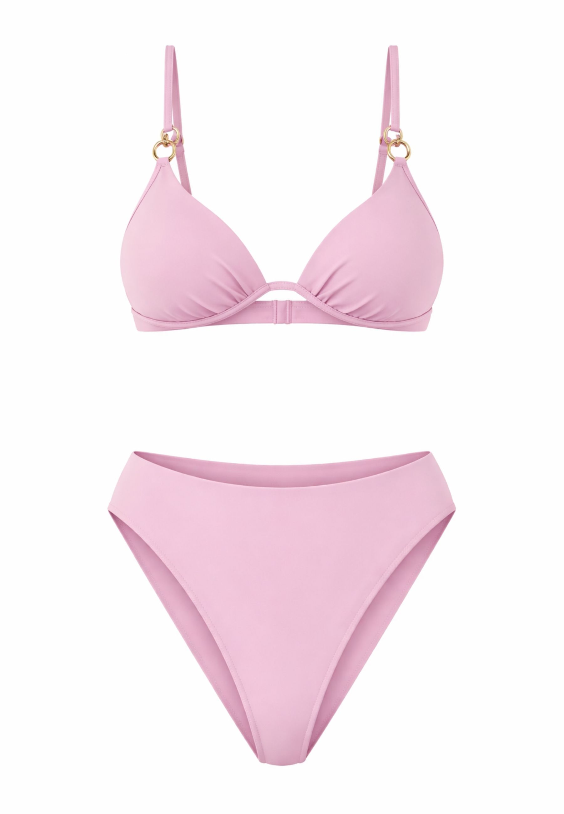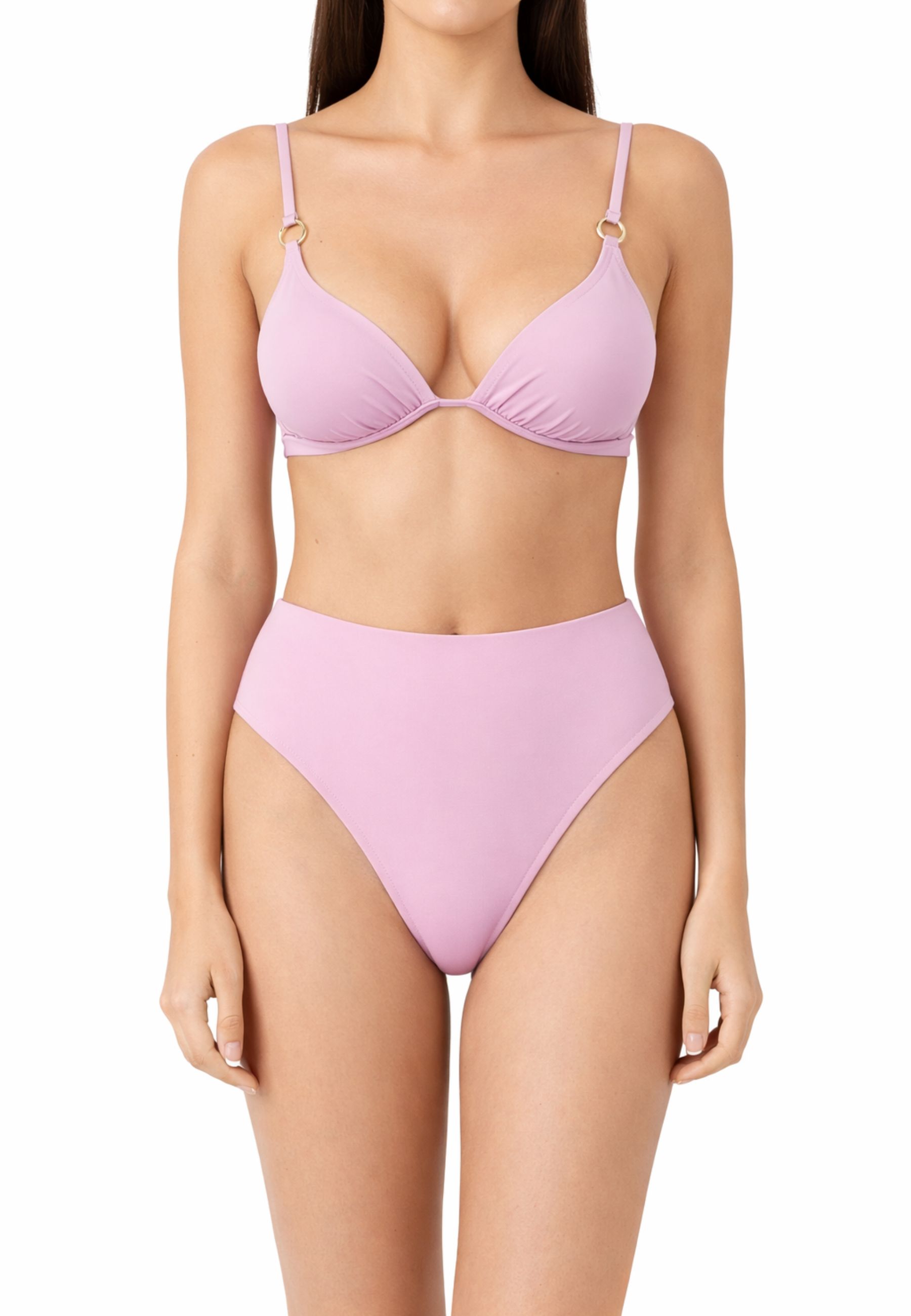 Bikini da donna Margherita Mazzei, caratterizzato da uno stile essenziale e raffinato. Il set è composto da top triangolo con coppe morbide e arricciatura centrale, spalline sottili regolabili con dettagli metallici decorativi, e slip a vita alta dalla linea pulita, pensato per offrire una vestibilità confortevole e una copertura equilibrata.