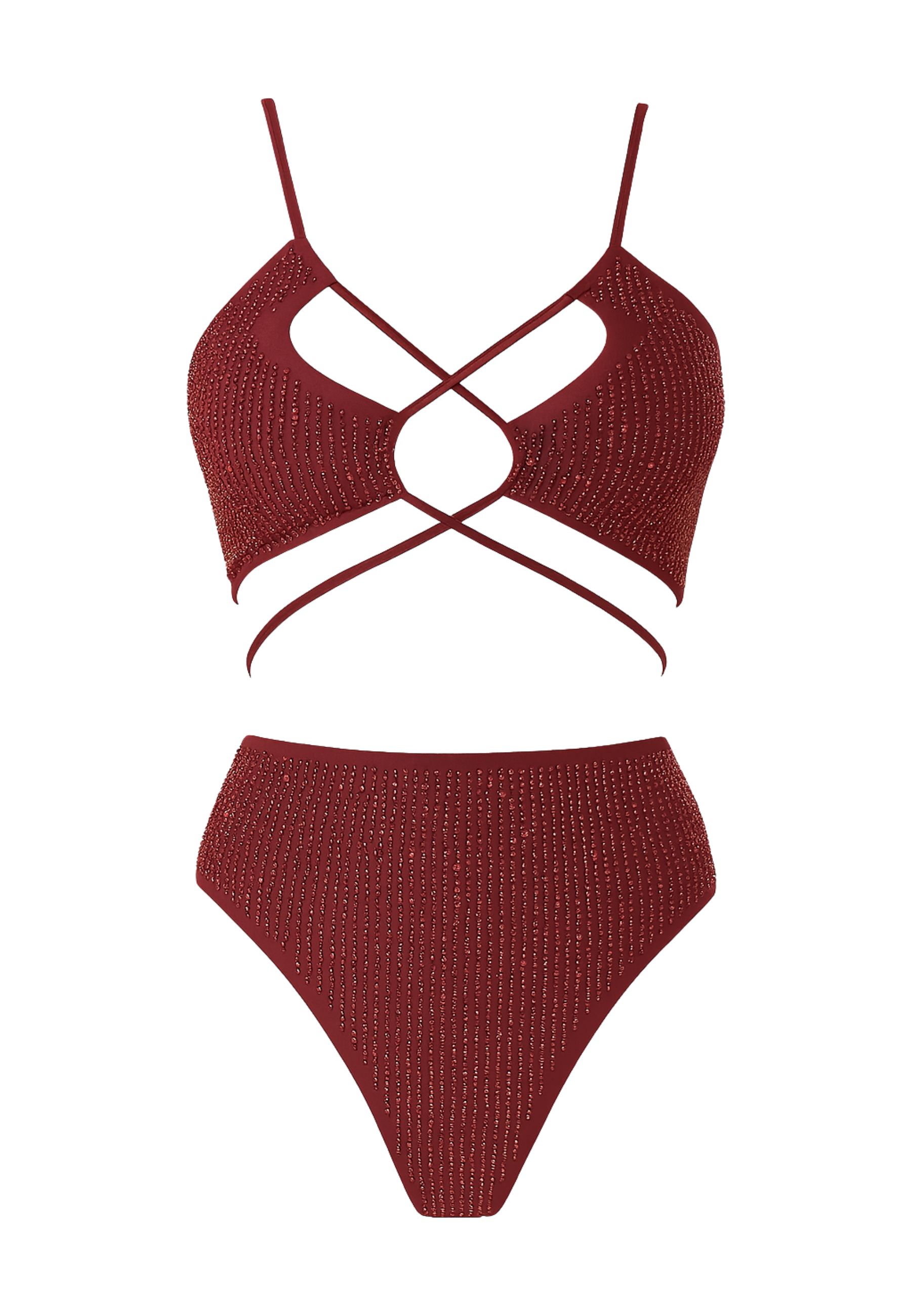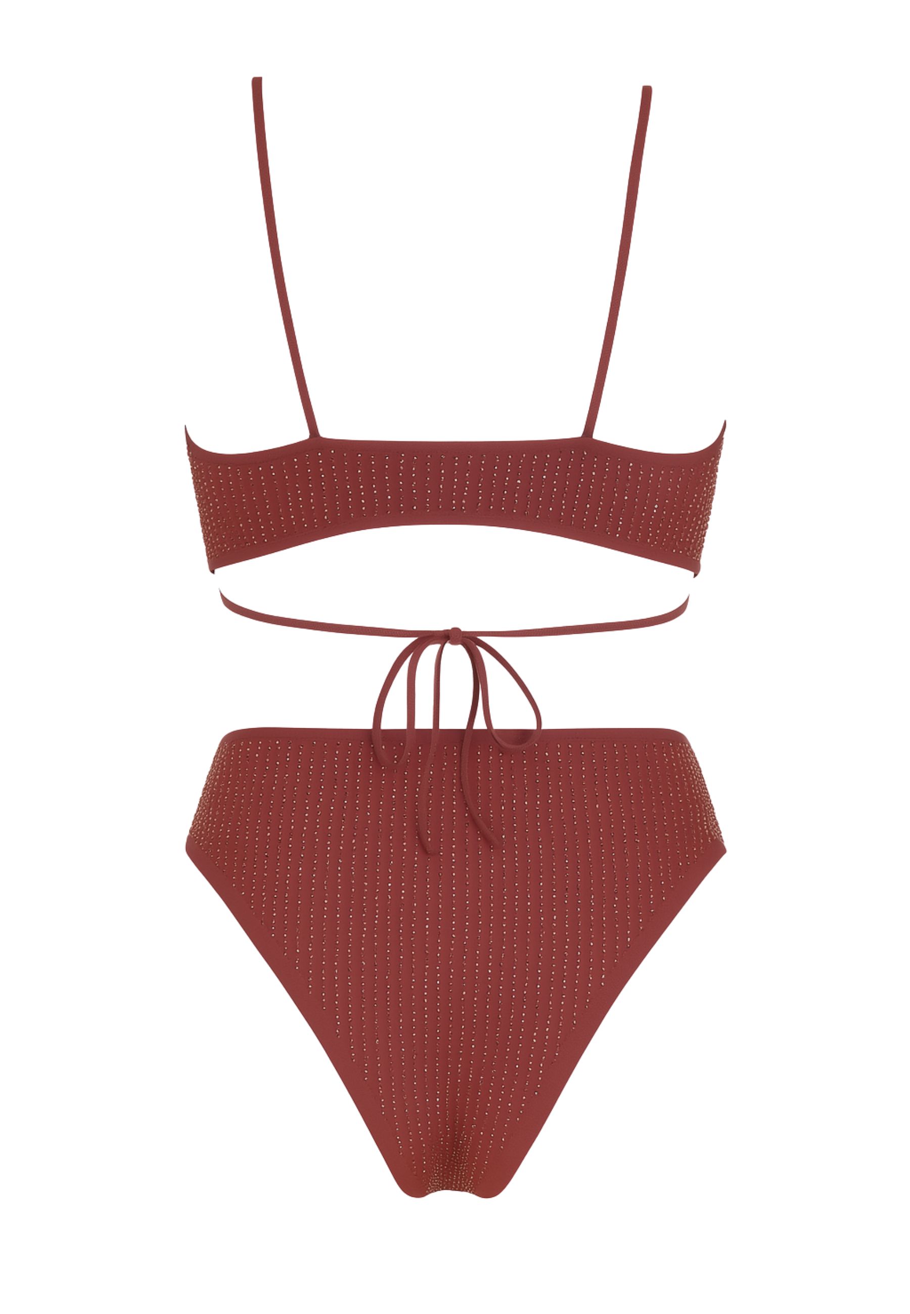 Elegante e sensuale, questo costume due pezzi firmato Margherita Mazzei è un perfetto connubio tra glamour e stile. Realizzato in tessuto elasticizzato bordeaux, si distingue per lapplicazione di micro strass che creano un raffinato effetto luminoso su tutta la superficie.
