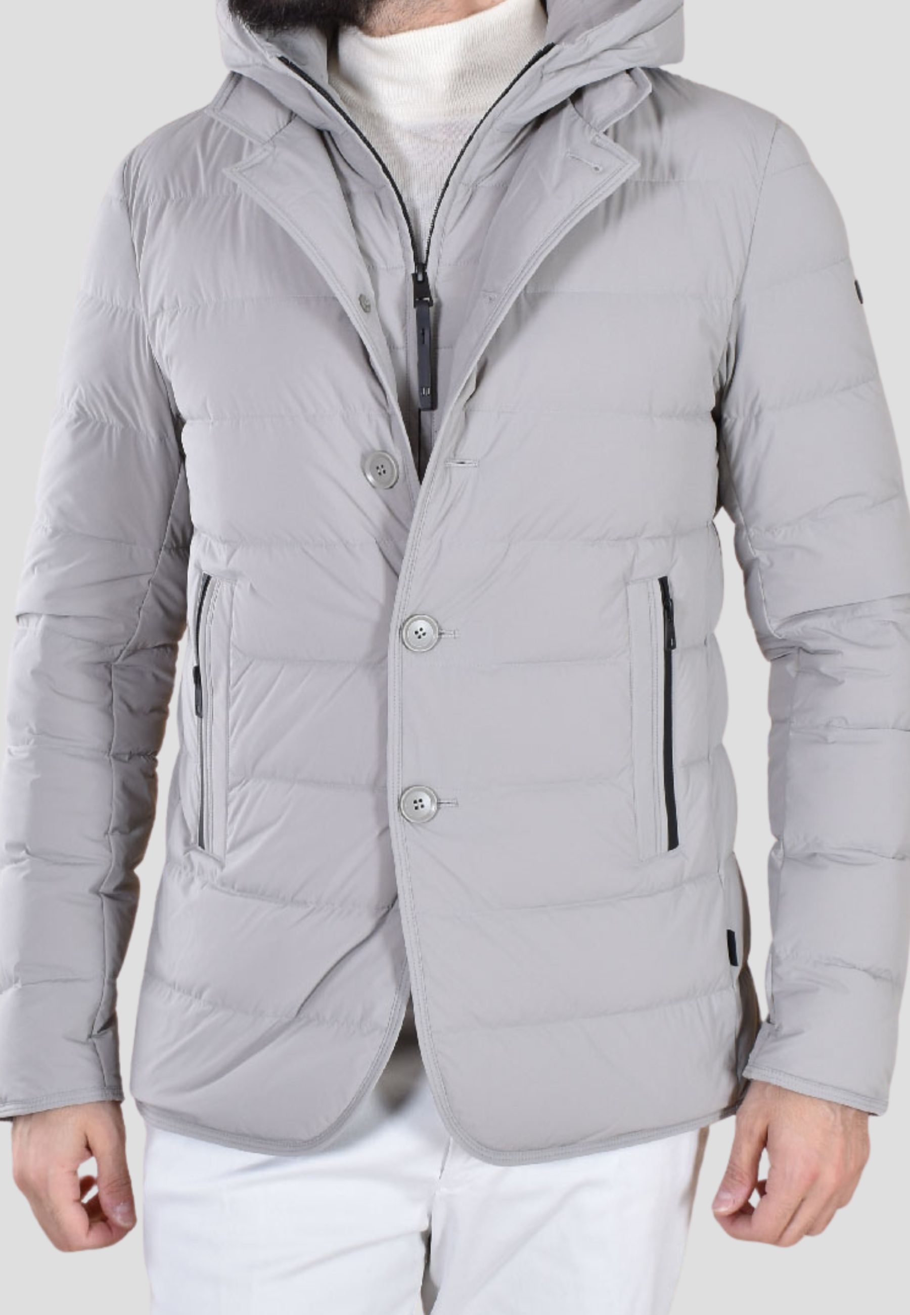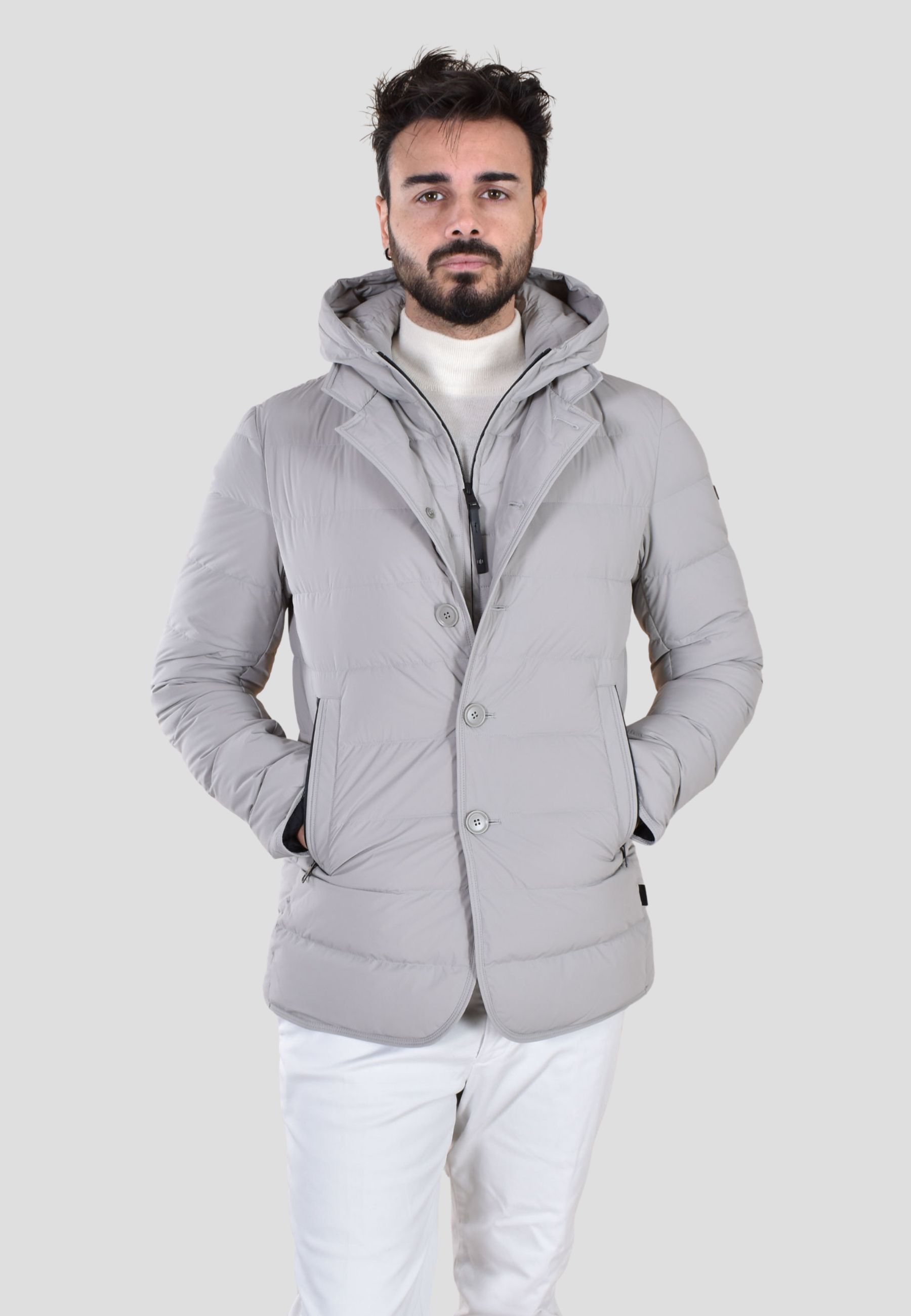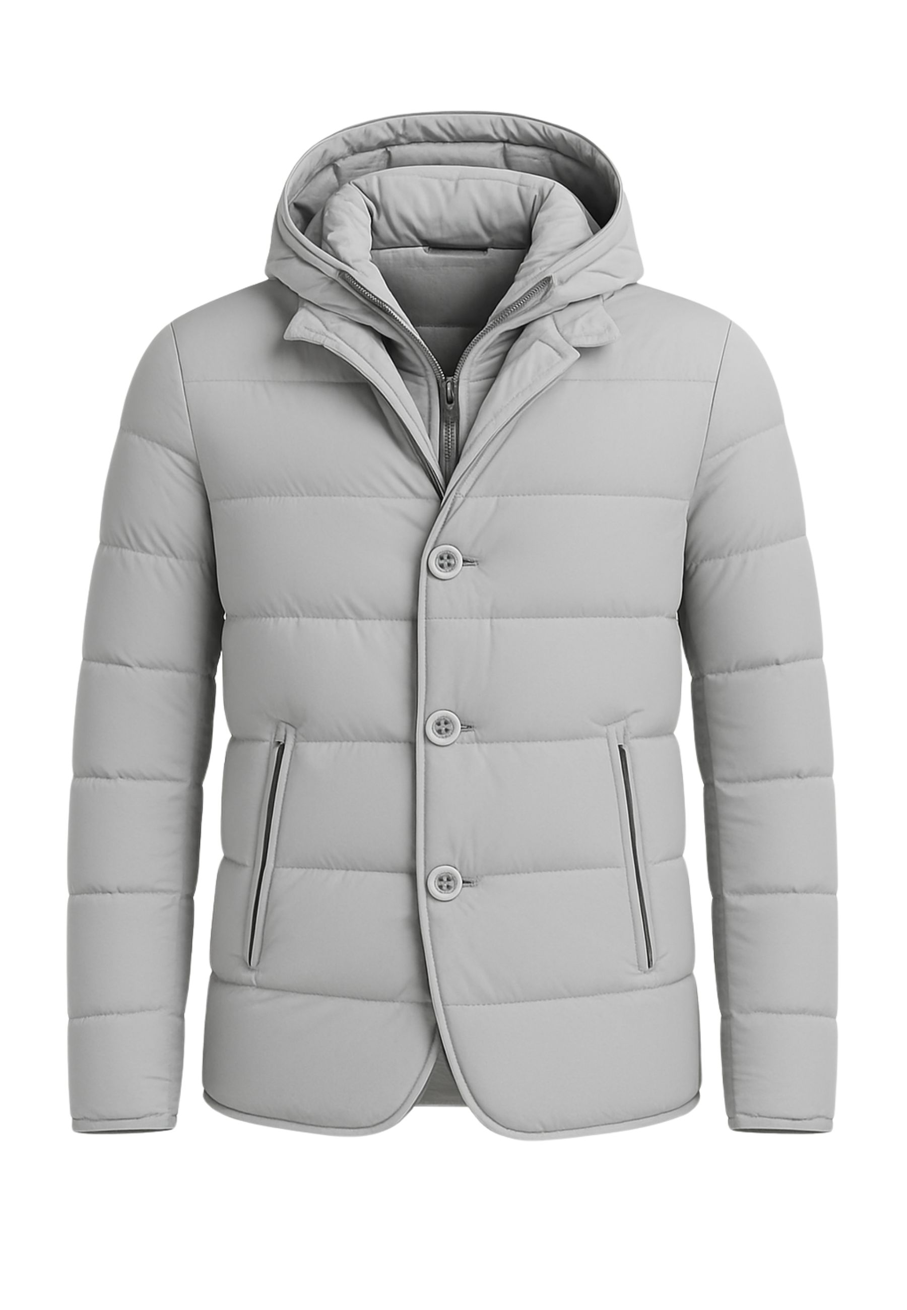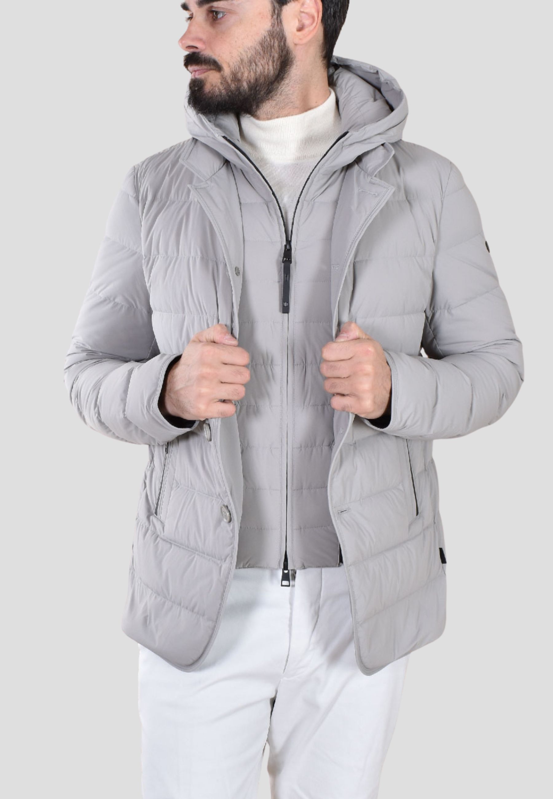 - Dettagli: Cappuccio removibile regolabile, trapuntatura orizzontale, tasche laterali con zip, fondo stondato stile giacca