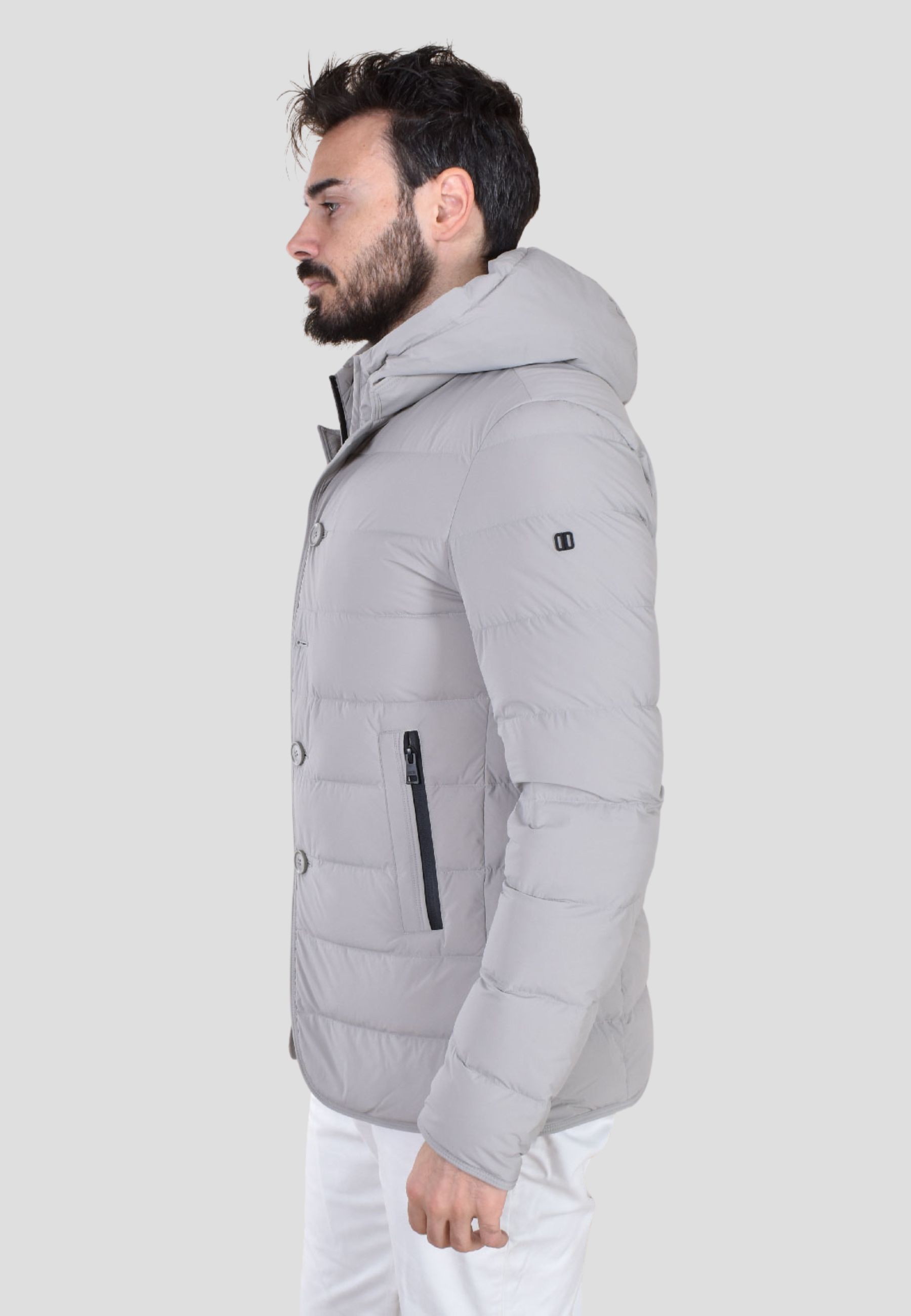 Piumino corto dal look sartoriale firmato DUNO, caratterizzato da una linea moderna che unisce lo stile elegante della giacca monopetto alla funzionalità del piumino tecnico. Realizzato con trapuntatura orizzontale, presenta chiusura frontale con zip coperta da bottoni, tasche laterali inserite con zip e cappuccio regolabile e removibile. Il design è completato da un fondo stondato che richiama il taglio delle giacche classiche.