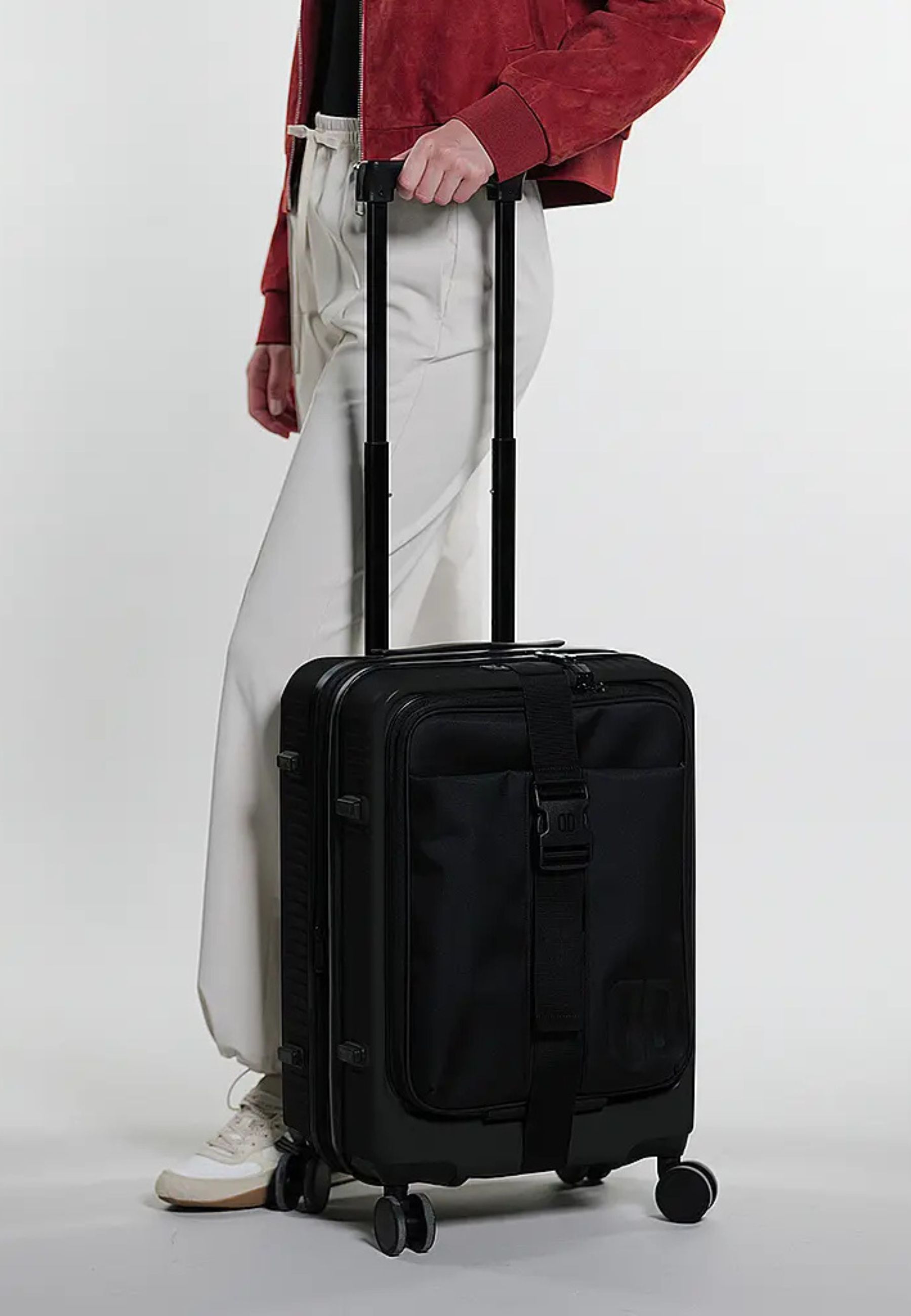 La parte frontale integra una pratica tasca in softshell con chiusura a cerniera, facilmente accessibile per documenti, tablet o oggetti di uso frequente. La serratura con sistema TSA (Travel Sentry® Approved) consente ispezioni di sicurezza senza danneggiamenti, garantendo al contempo protezione del contenuto.