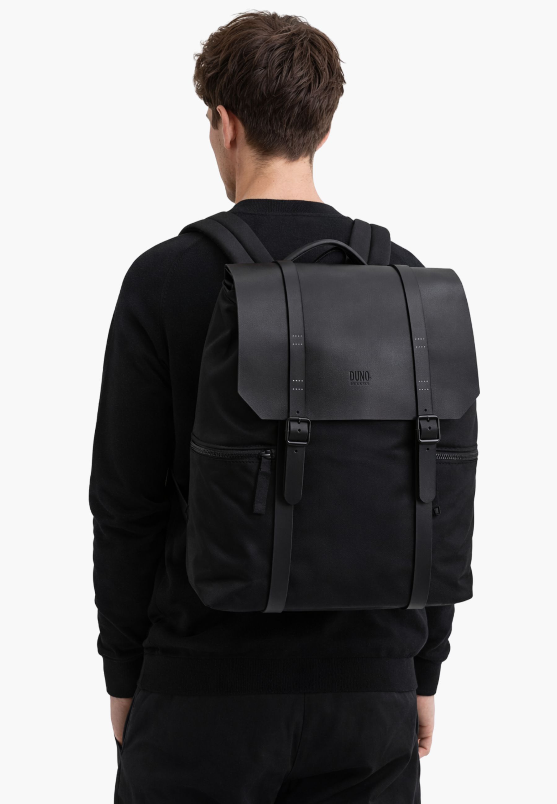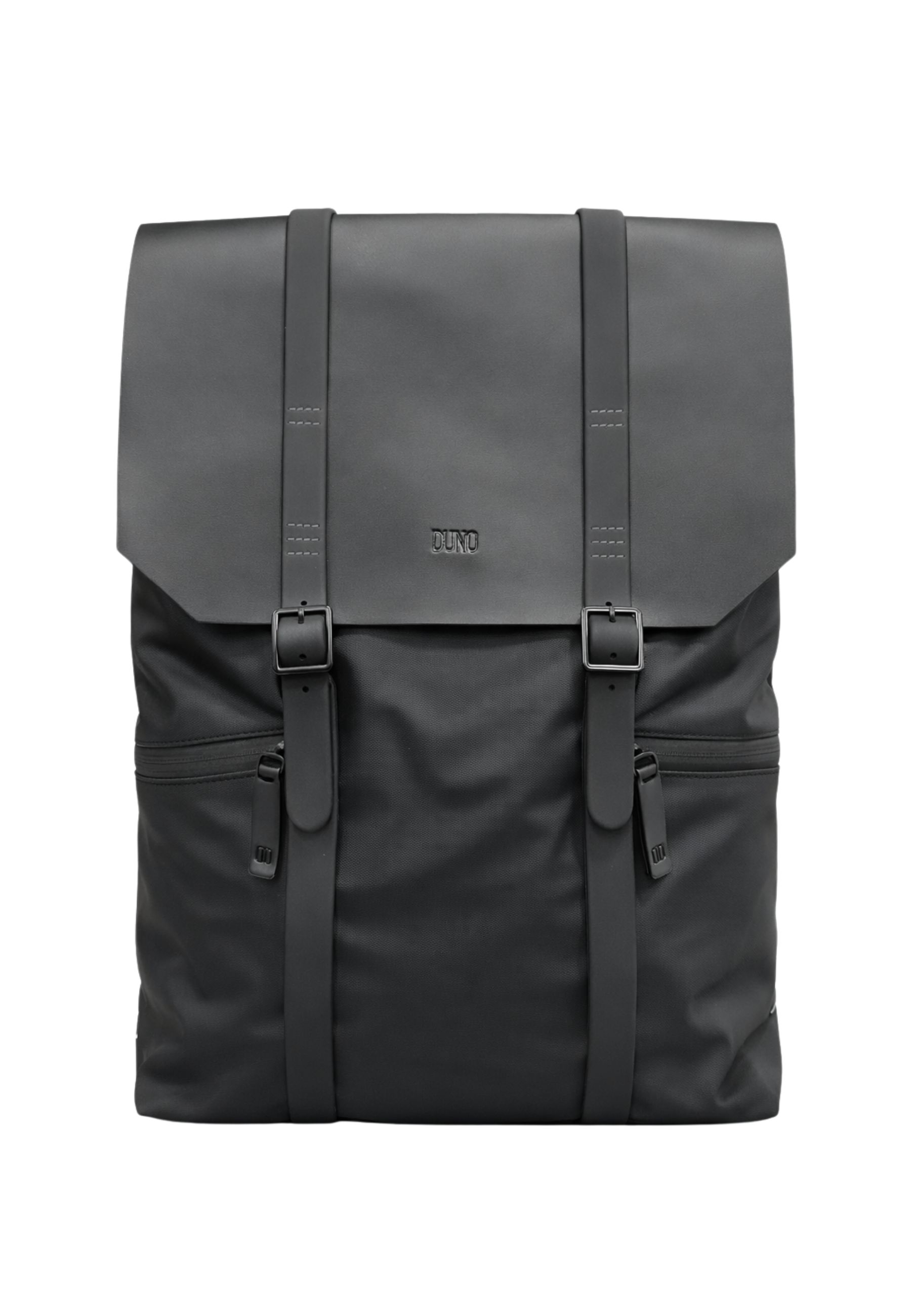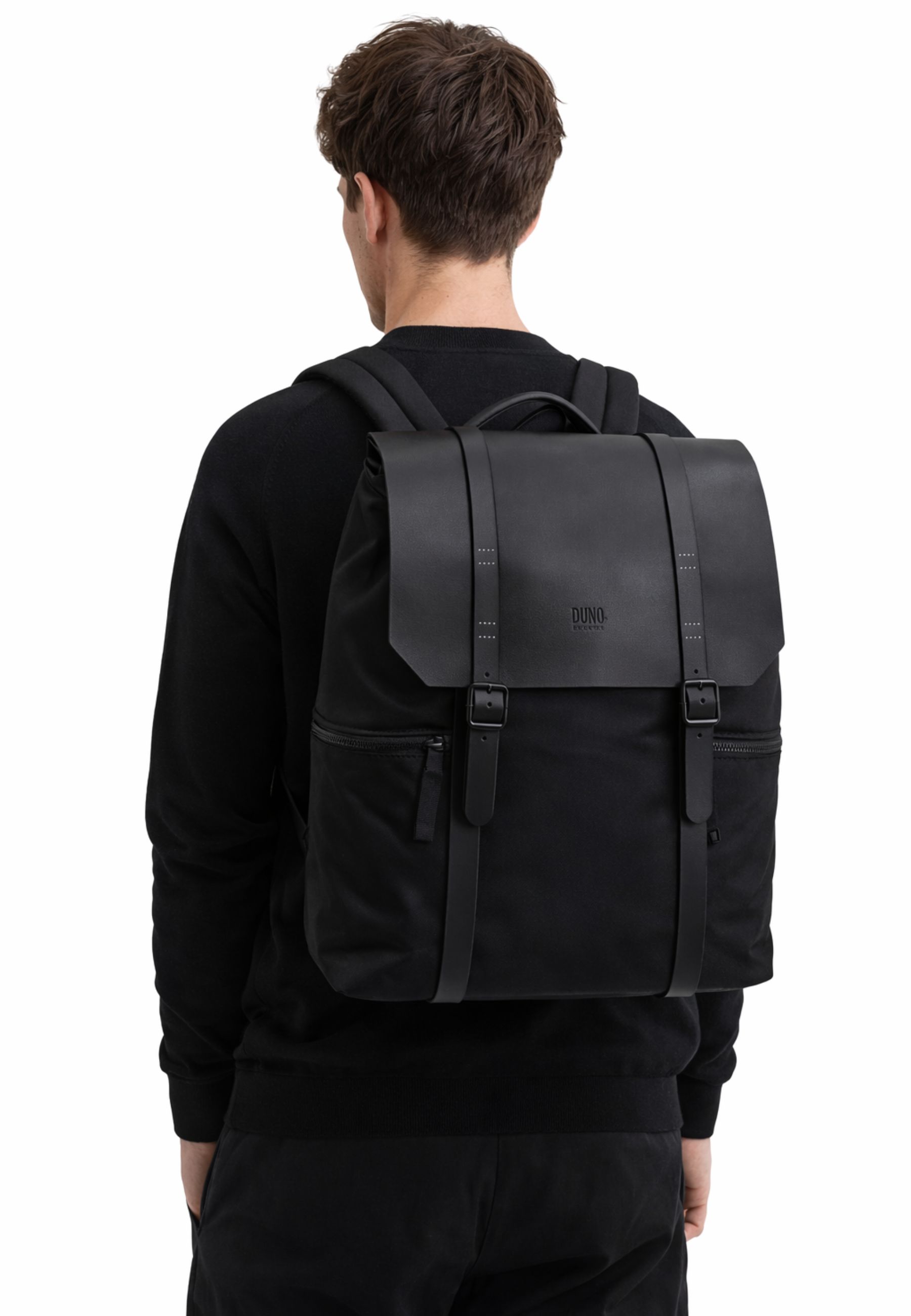 Zaino dal design essenziale e contemporaneo, ideale per utilizzo urbano e professionale. Linea strutturata con patta superiore e chiusura frontale con cinturino regolabile e fibbia in metallo nero opaco. Logo DUNO tono su tono applicato sulla patta.