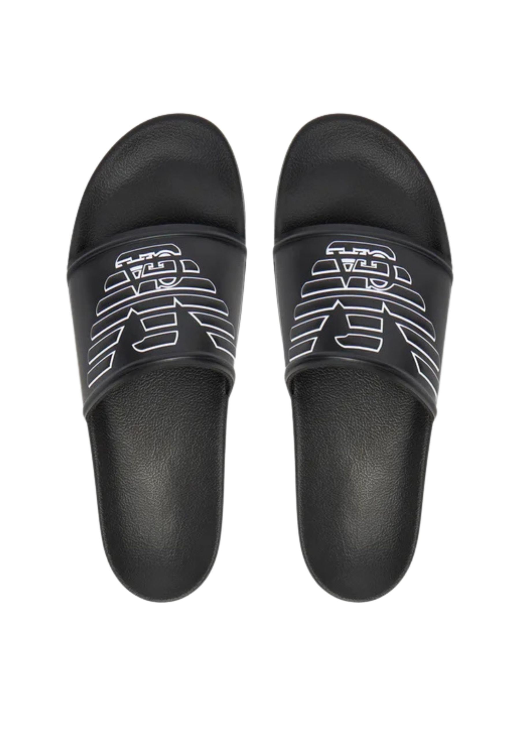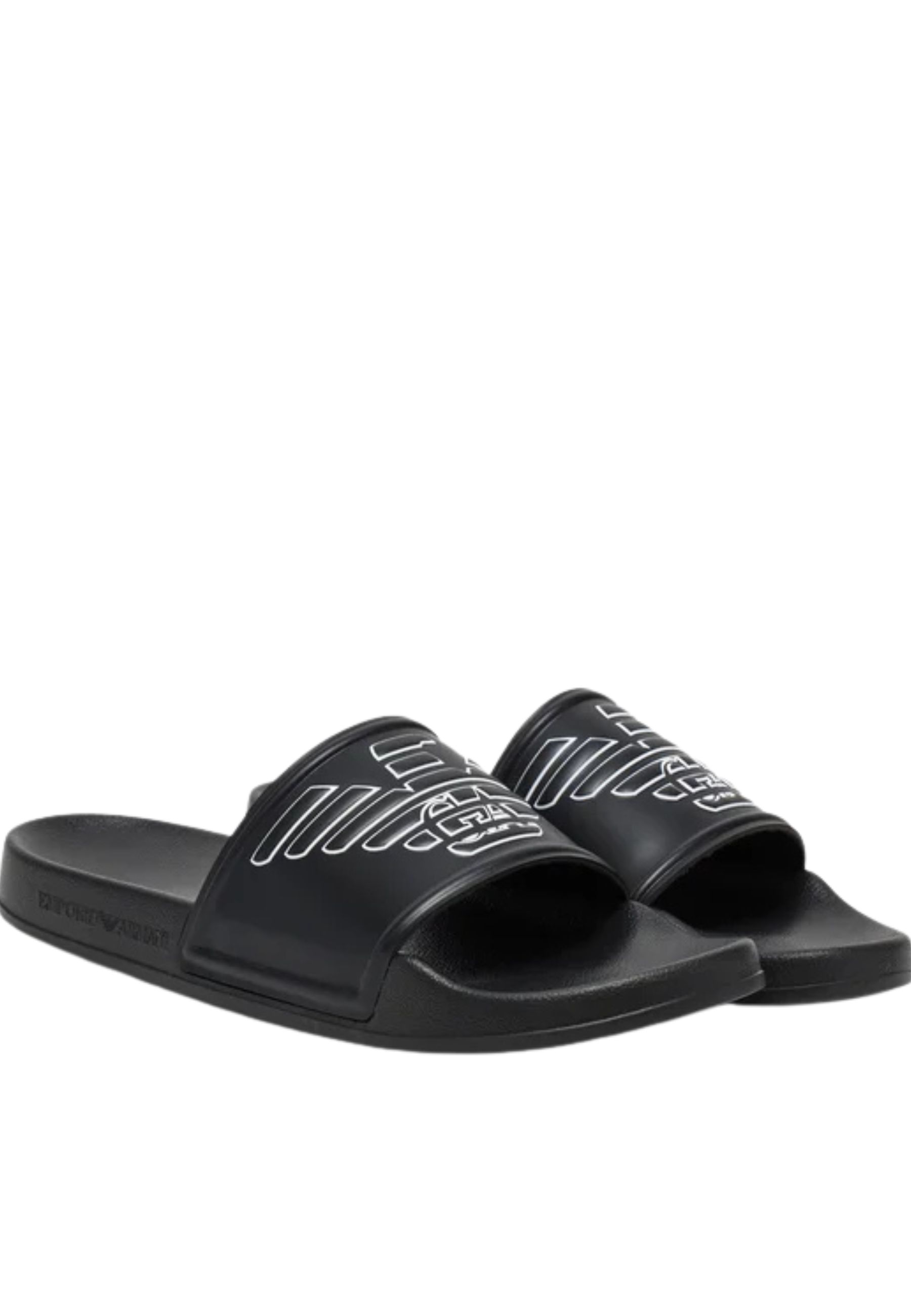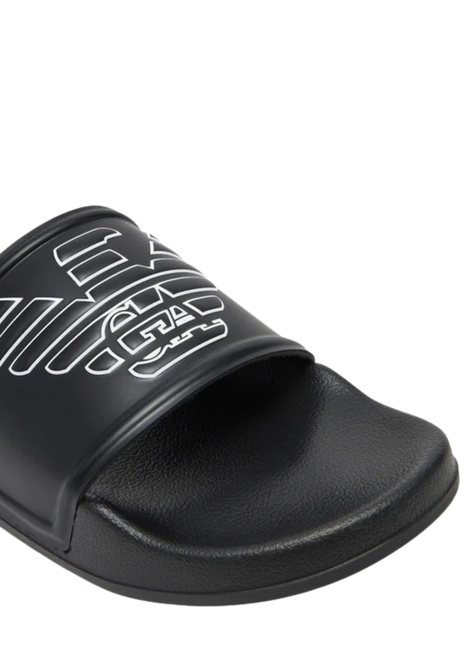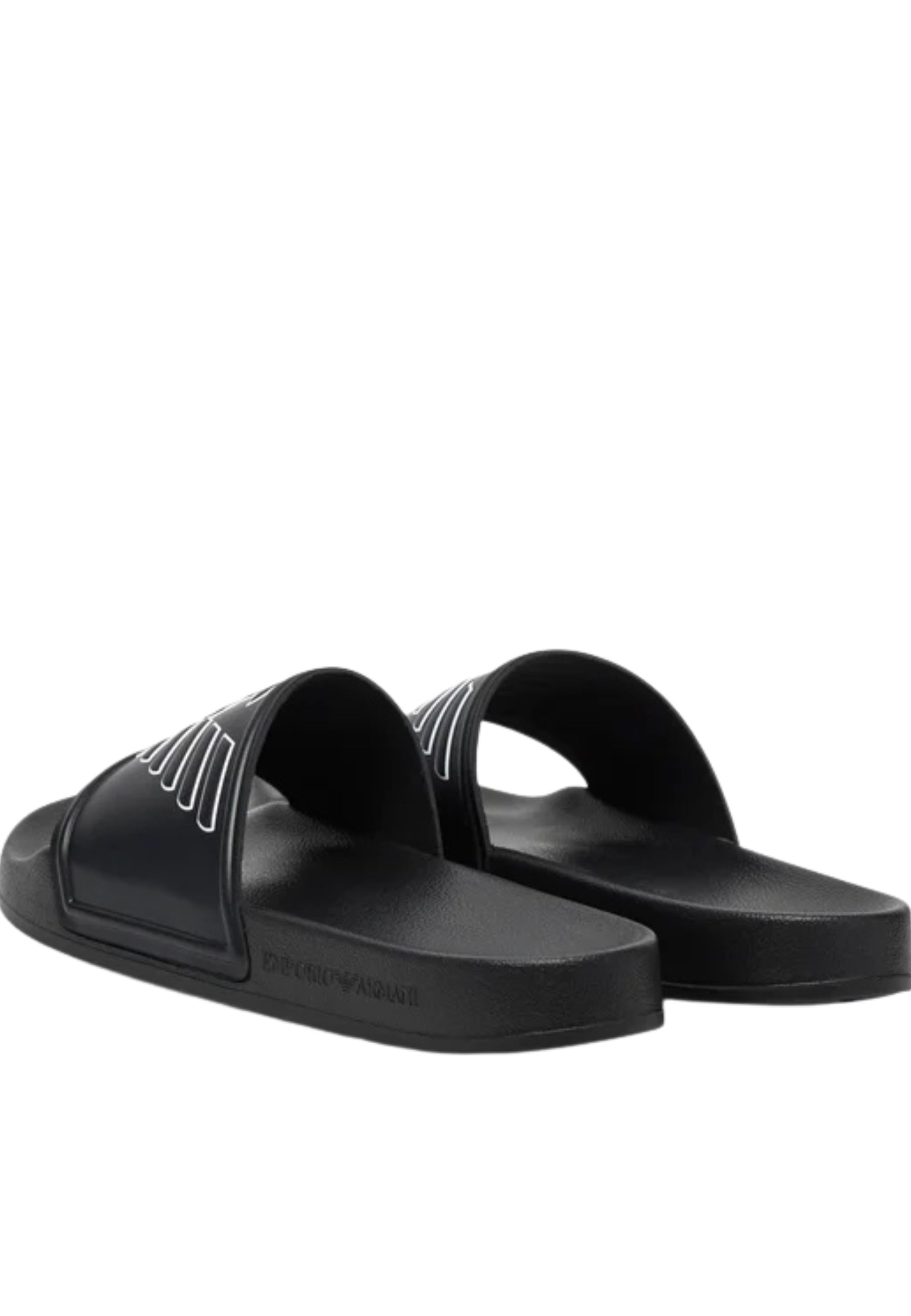 Sliders Emporio Armani realizzate in PVC, caratterizzate dalliconico maxi logo Eagle applicato sulla fascia superiore, elemento distintivo che conferisce al modello unestetica riconoscibile e contemporanea.