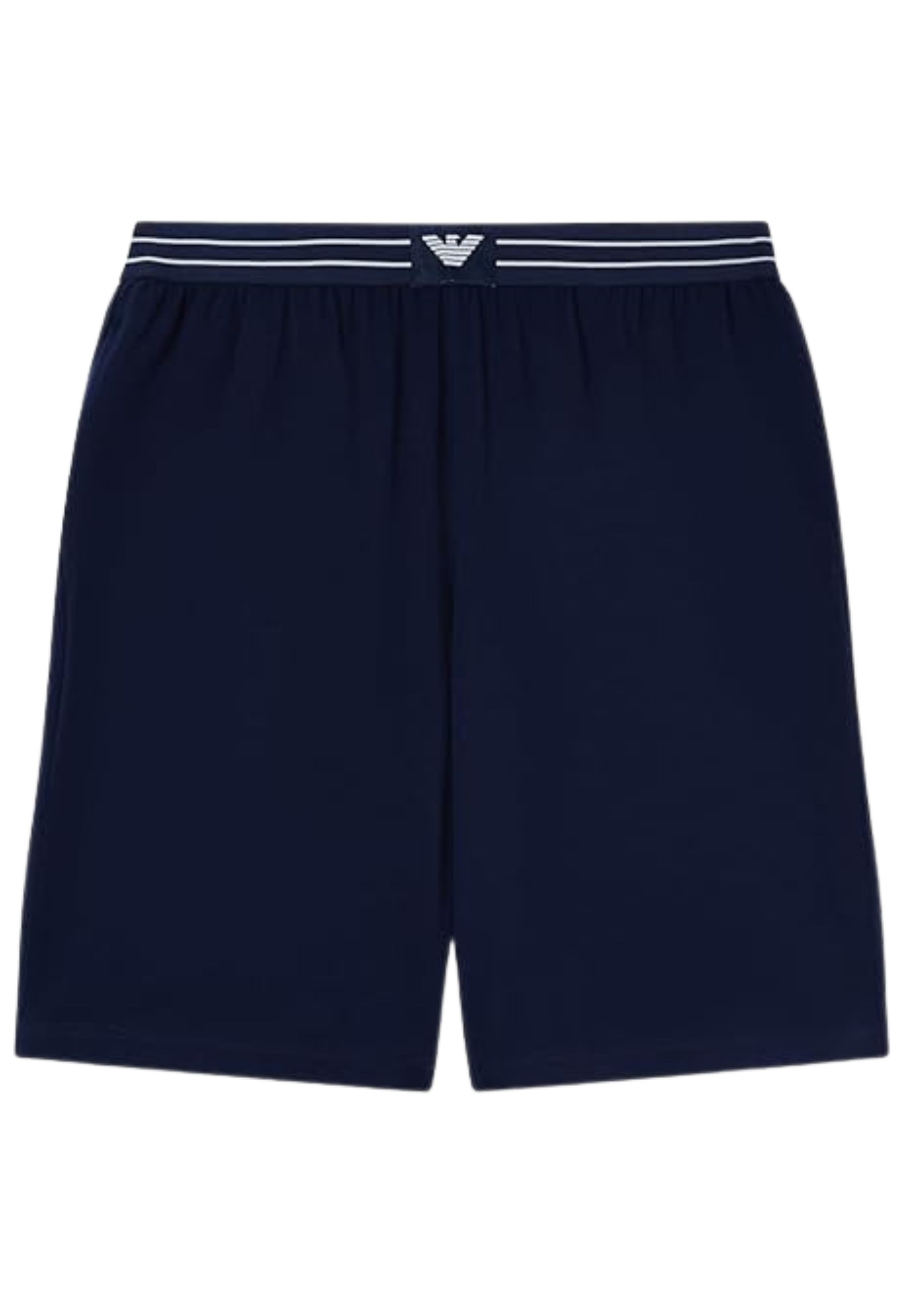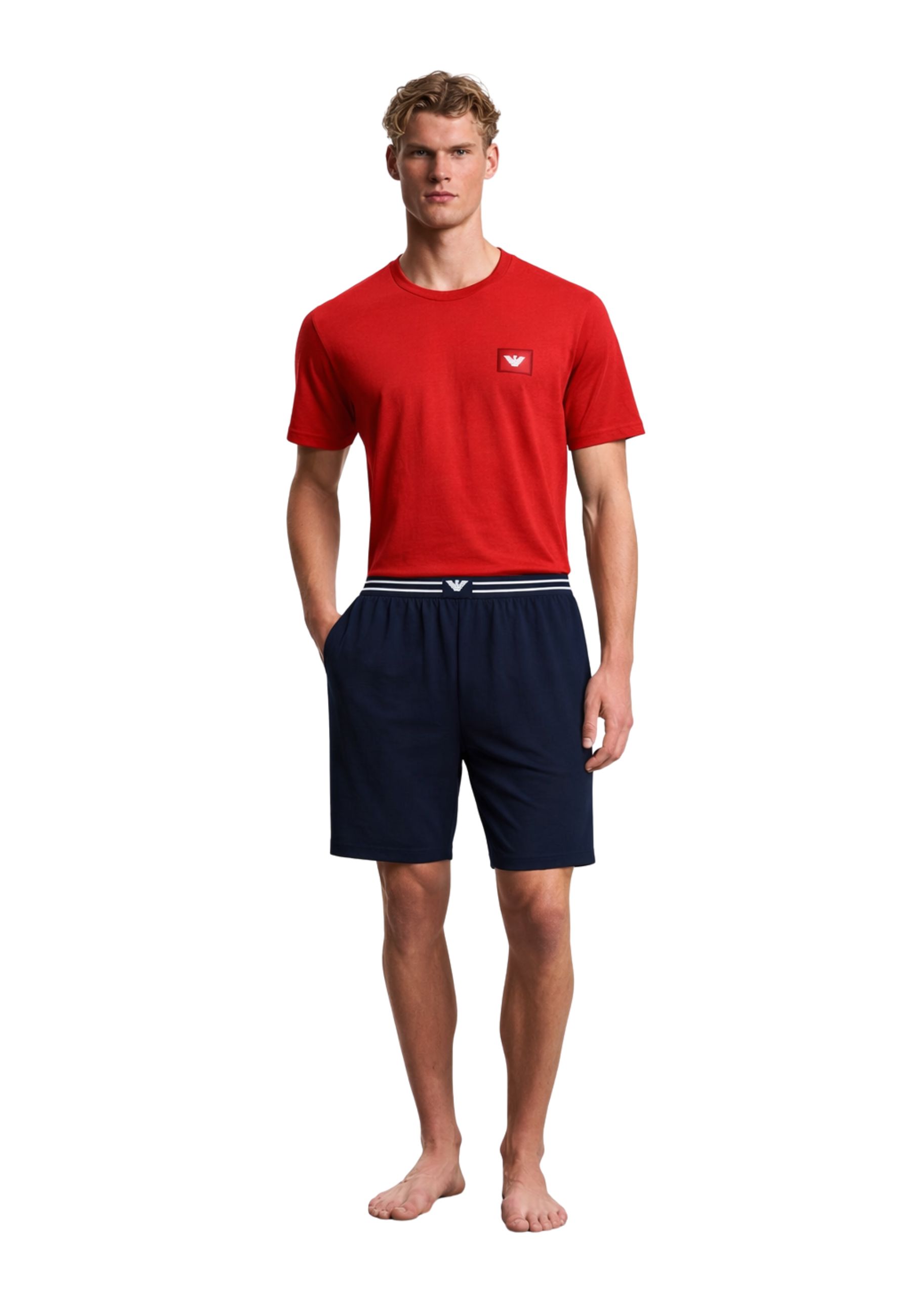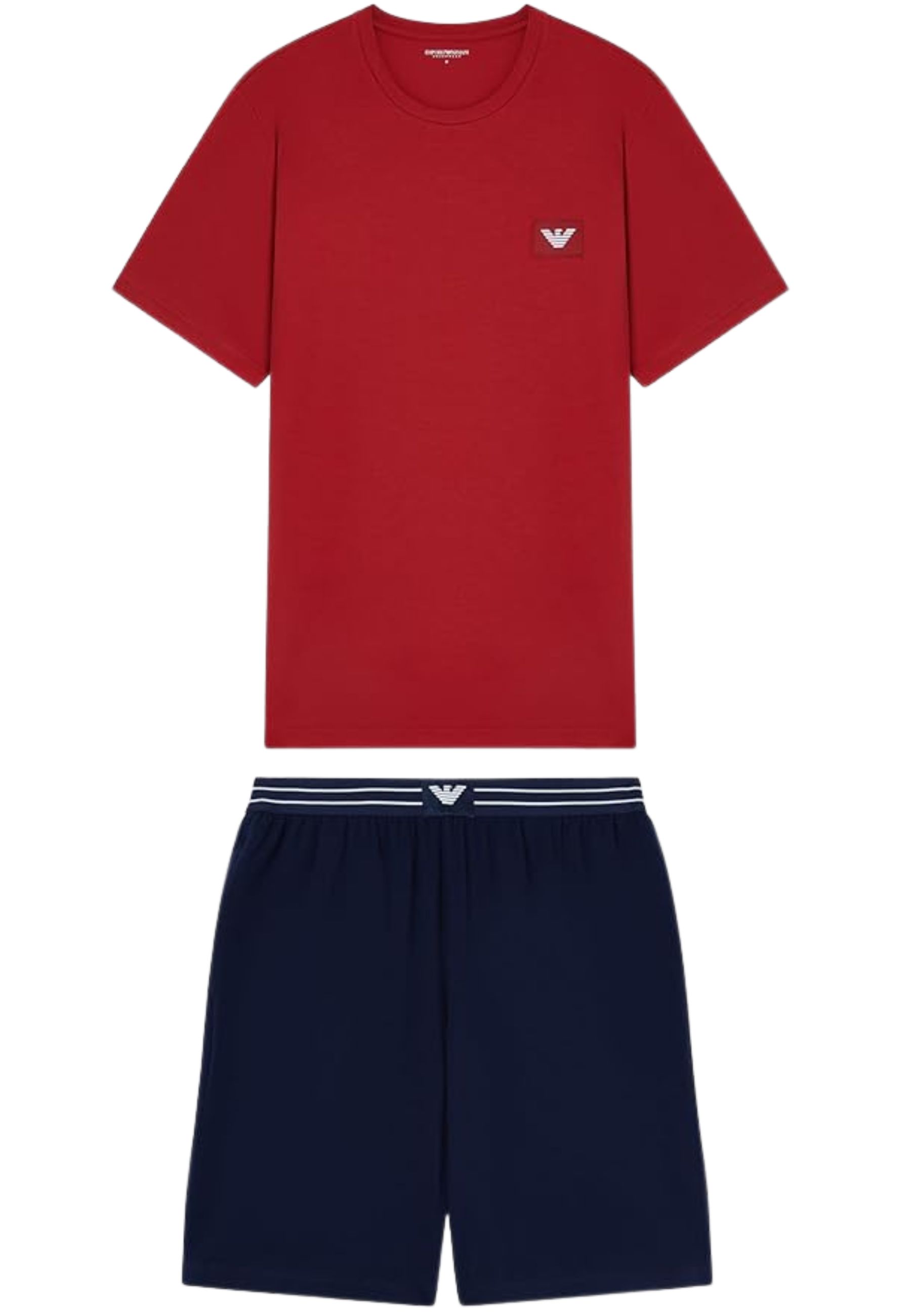 Pigiama uomo Emporio Armani realizzato in morbido jersey di cotone stretch, composto da T-shirt girocollo e bermuda con fascia elastica logata. Il design essenziale è valorizzato dal logo patch frontale, dettaglio distintivo del brand.