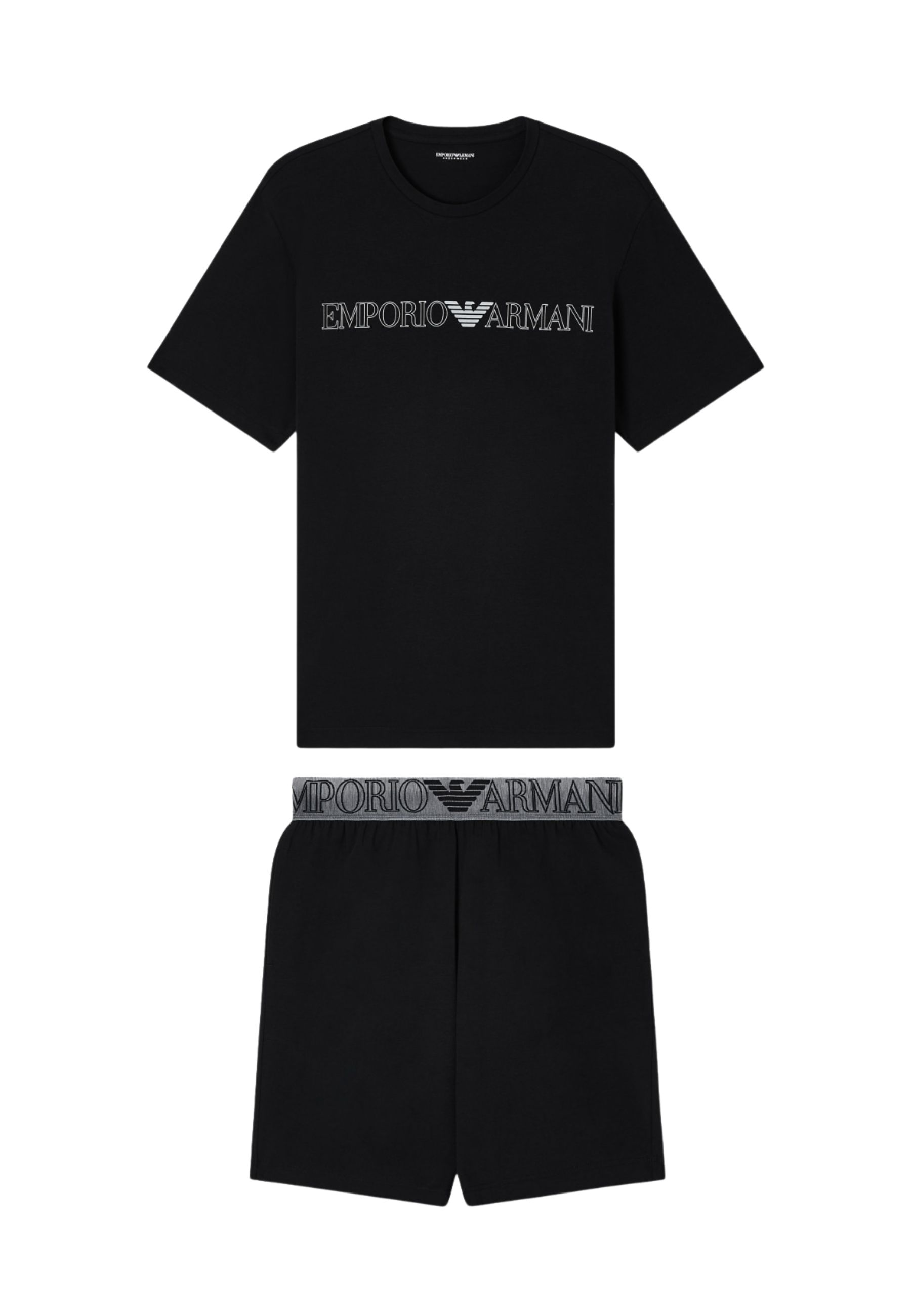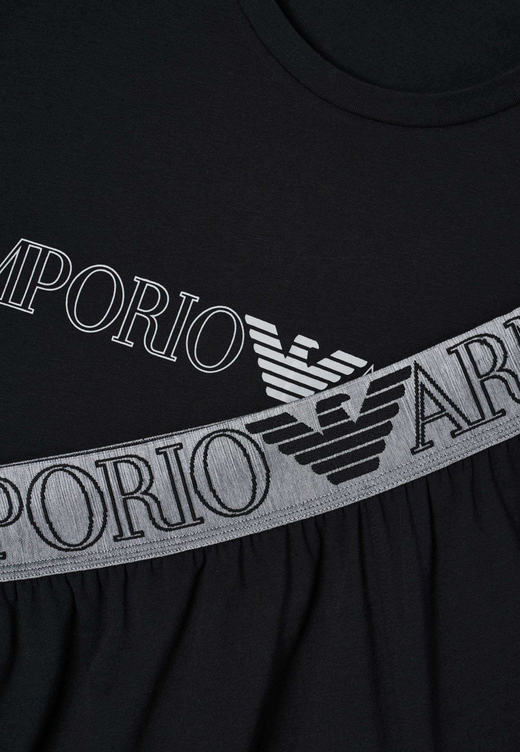Pigiama maschile realizzato in jersey stretch di cotone proveniente da agricoltura biologica, parte della linea ASV. Il completo è composto da T-shirt girocollo con stampa megalogo Emporio Armani sul petto e bermuda coordinati con vita elastica logata.