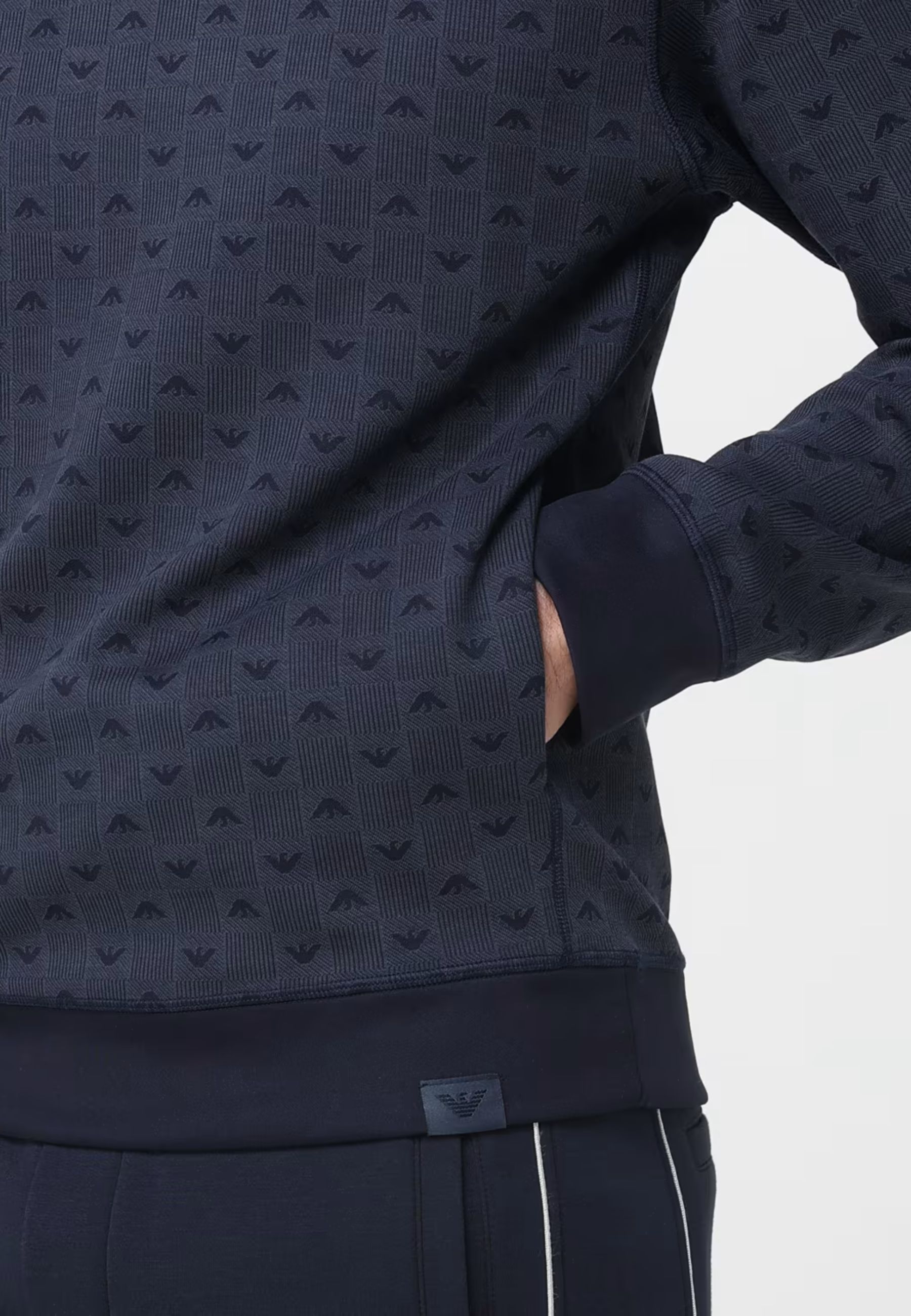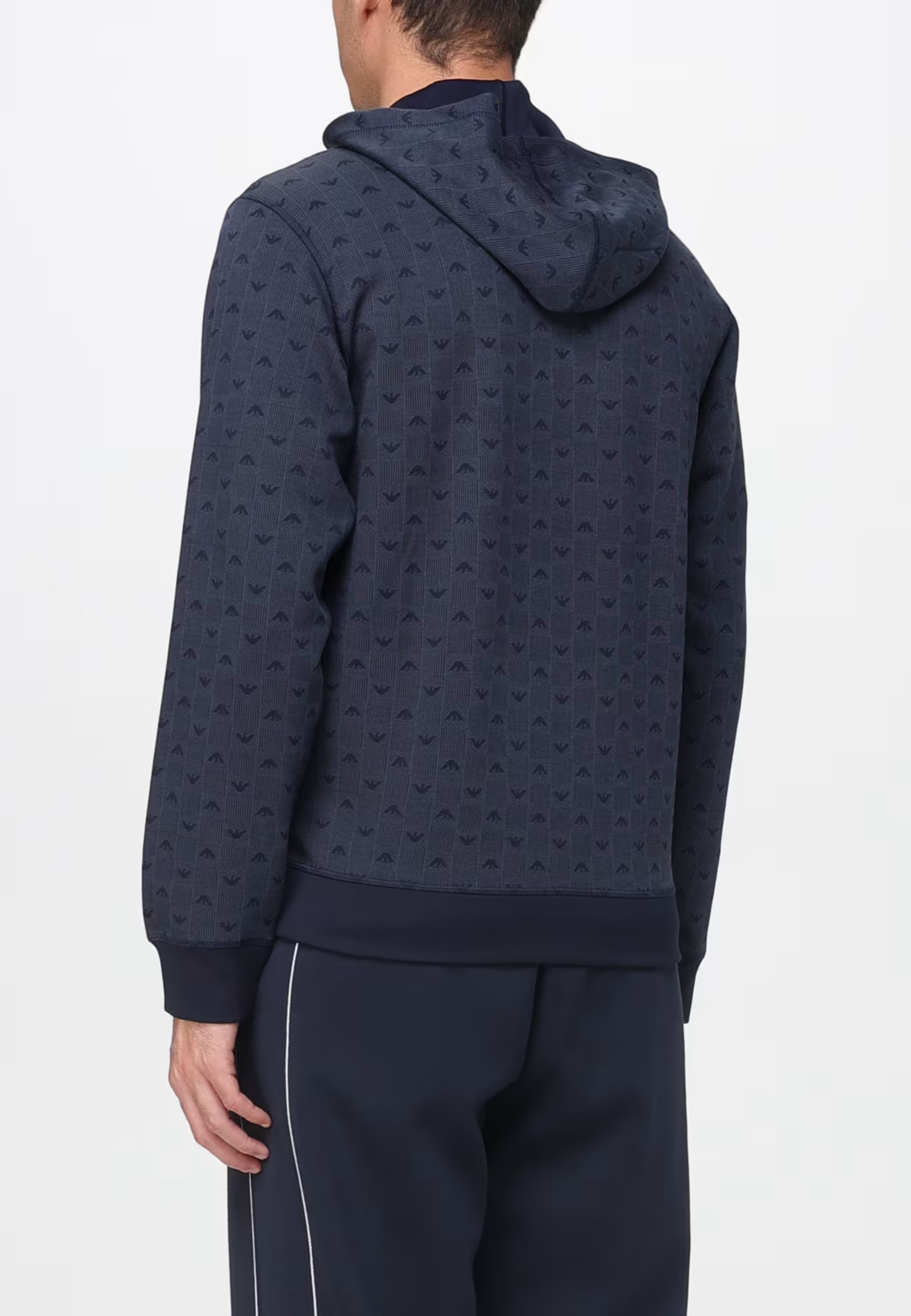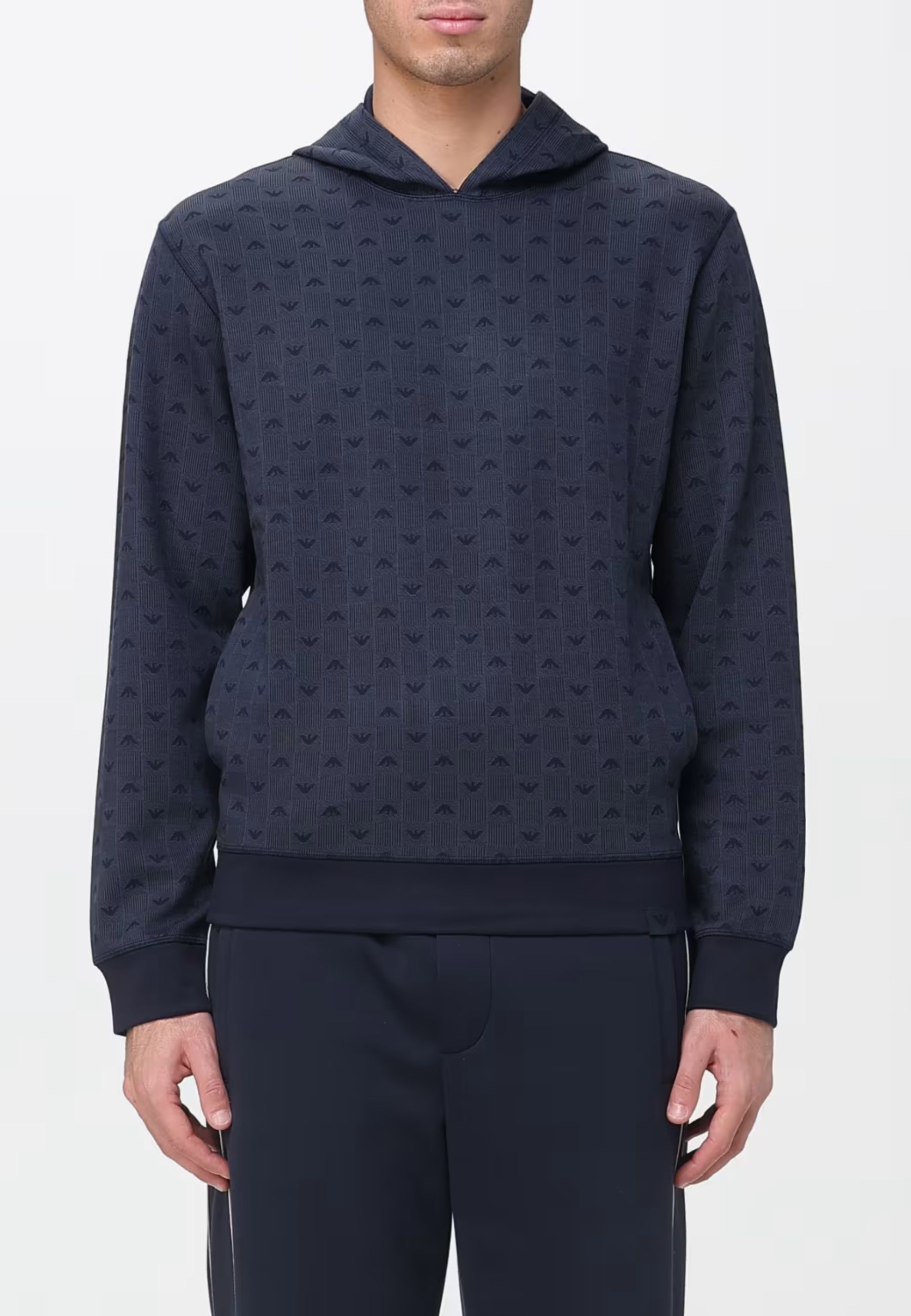 Felpa loungewear con cappuccio dalla linea pulita e contemporanea, firmata Emporio Armani. Realizzata in tessuto morbido ed elastico, è caratterizzata dal raffinato motivo a micro-logo tono su tono che esalta lo stile iconico della maison. La vestibilità regolare e i dettagli in maglia a costine su polsini e fondo garantiscono massimo comfort senza rinunciare alleleganza. Un capo versatile e sofisticato, ideale per il relax e i momenti leisure.