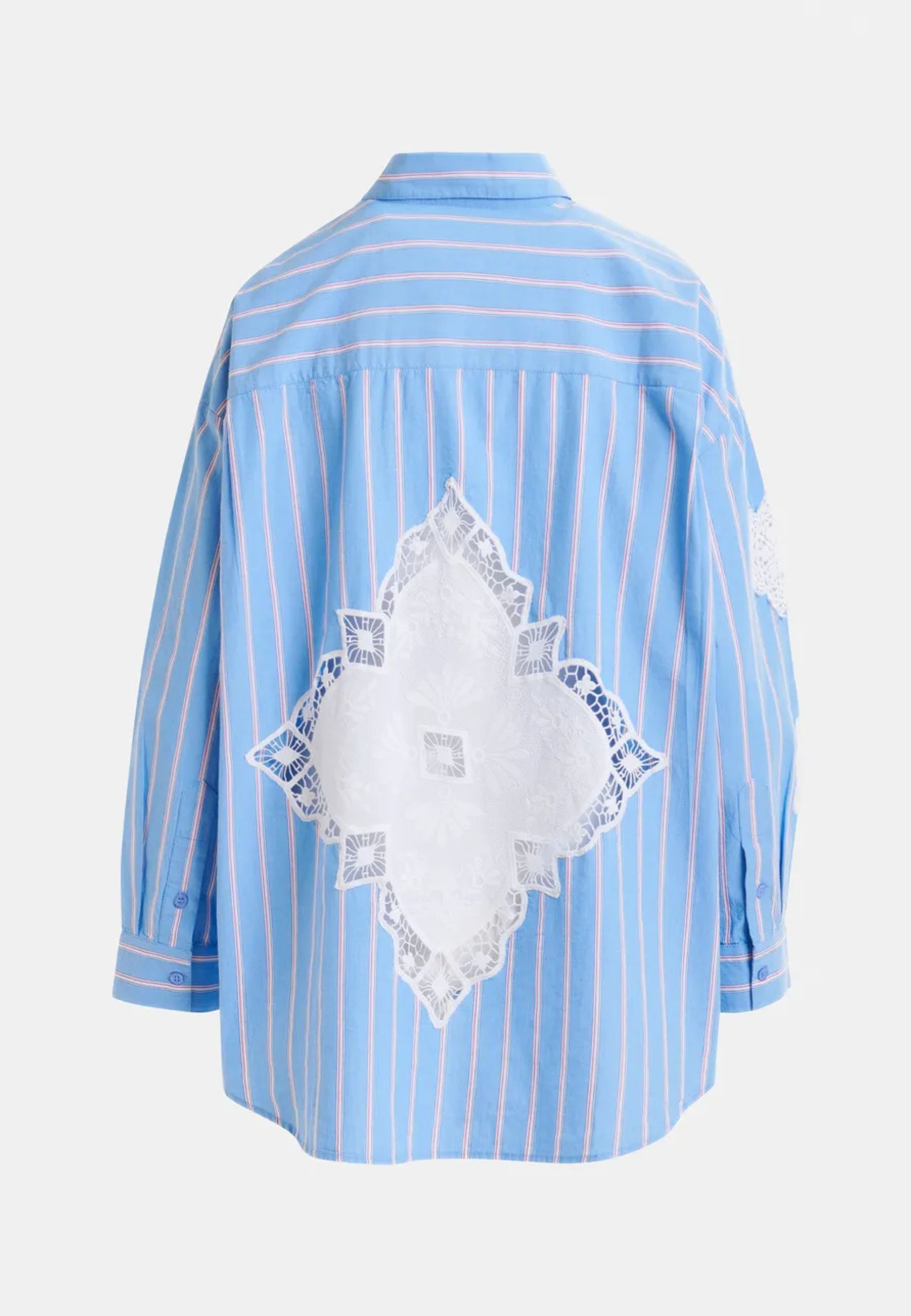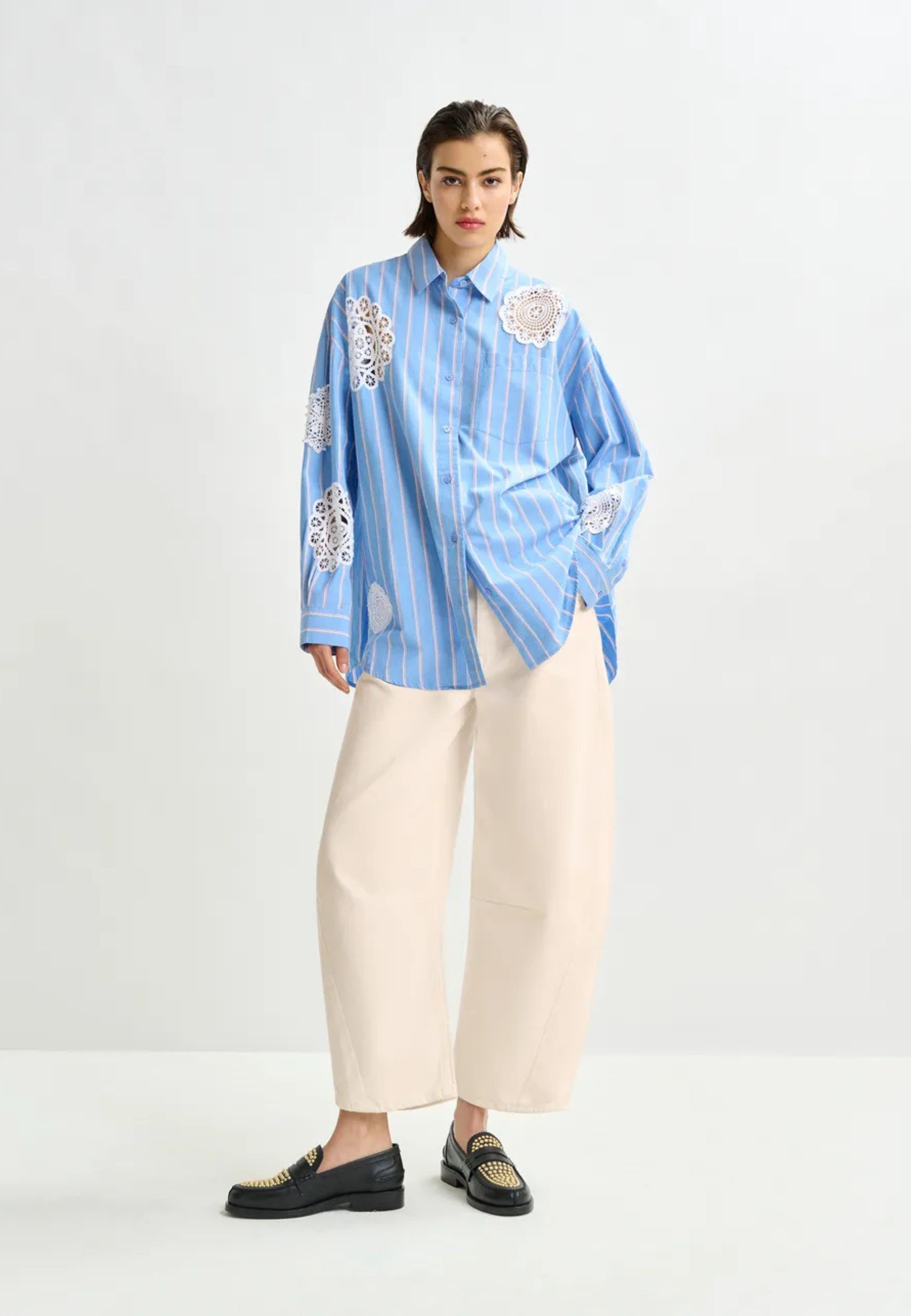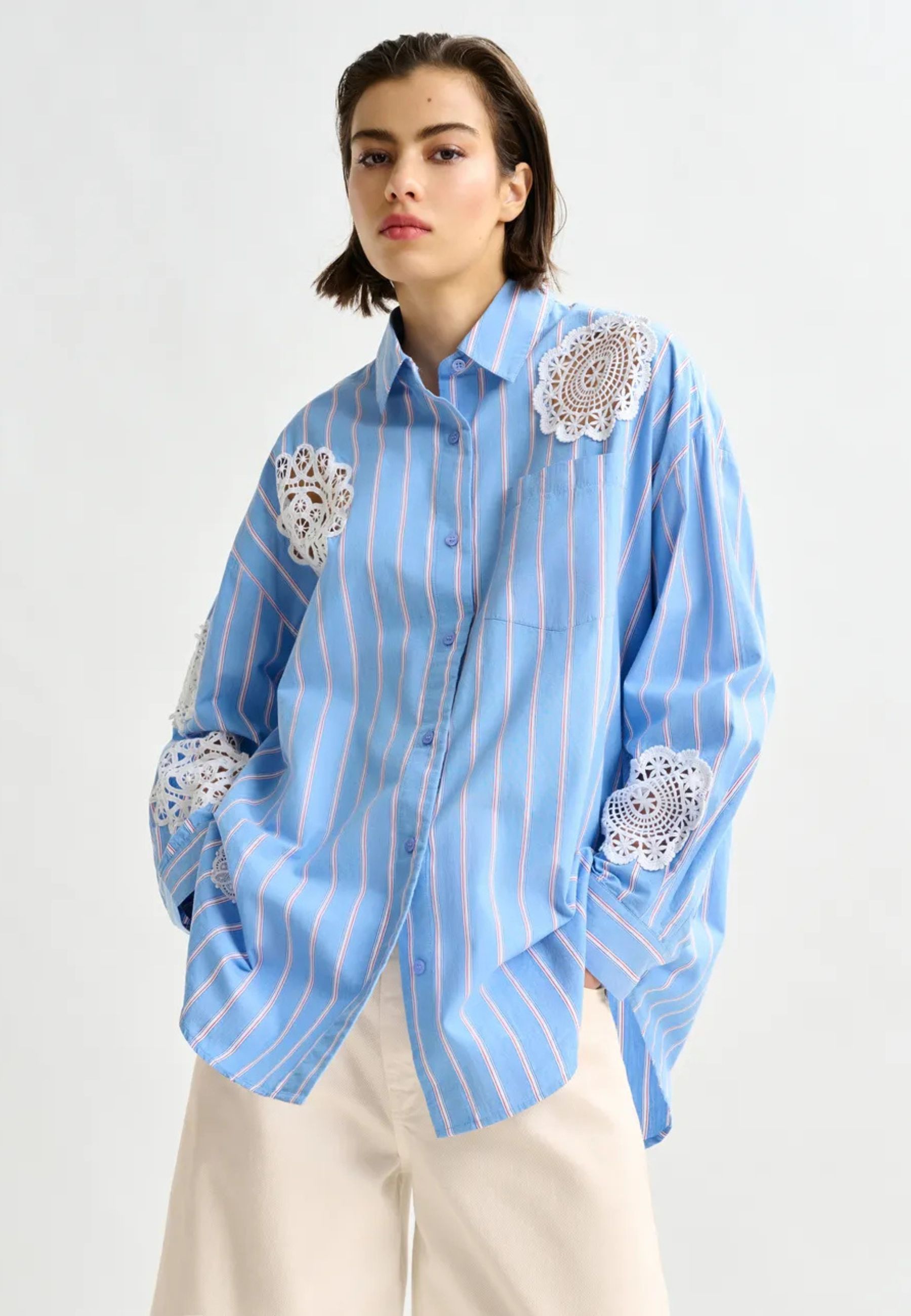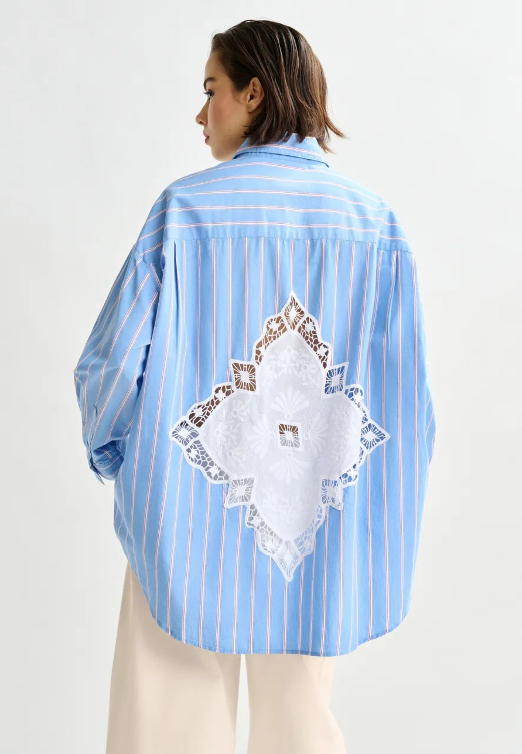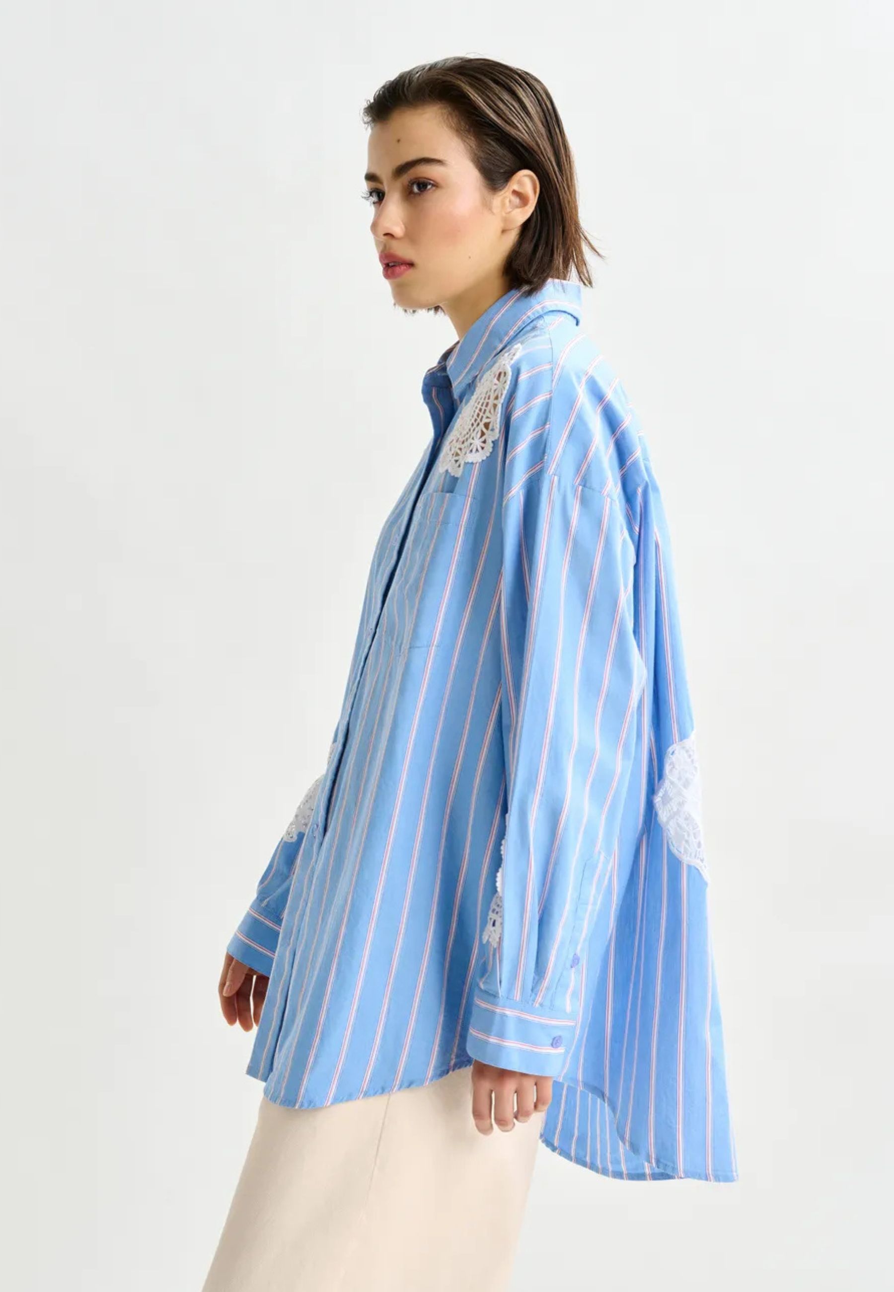 A caratterizzare il capo sono gli inserti in pizzo decorativo applicati su fronte, retro e maniche, che creano un raffinato contrasto con il tessuto a righe. Il fondo arrotondato con retro leggermente più lungo dona un taglio moderno e versatile, perfetto sia indossato morbido sia infilato nei pantaloni.