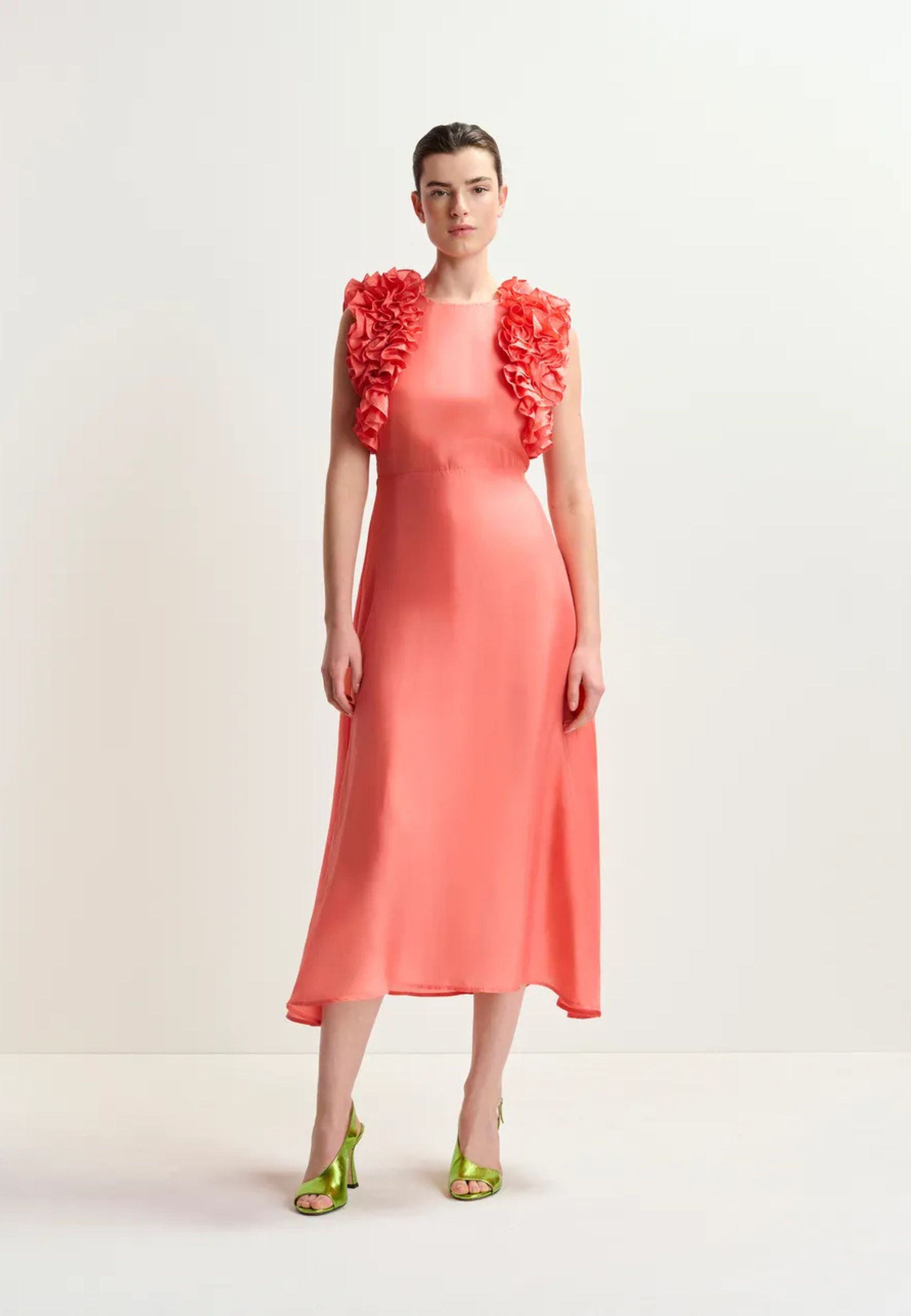 Un capo elegante e sofisticato, perfetto per le occasioni speciali. Realizzato in pura seta, questo abito midi presenta un corpino aderente che scende in una linea svasata, valorizzando la silhouette con leggerezza e fluidità. Le rouches applicate sulle spalle donano un tocco romantico e femminile, mentre la chiusura con zip nascosta sul retro garantisce una finitura impeccabile. Labito è parzialmente foderato per un maggiore comfort e una vestibilità impeccabile.