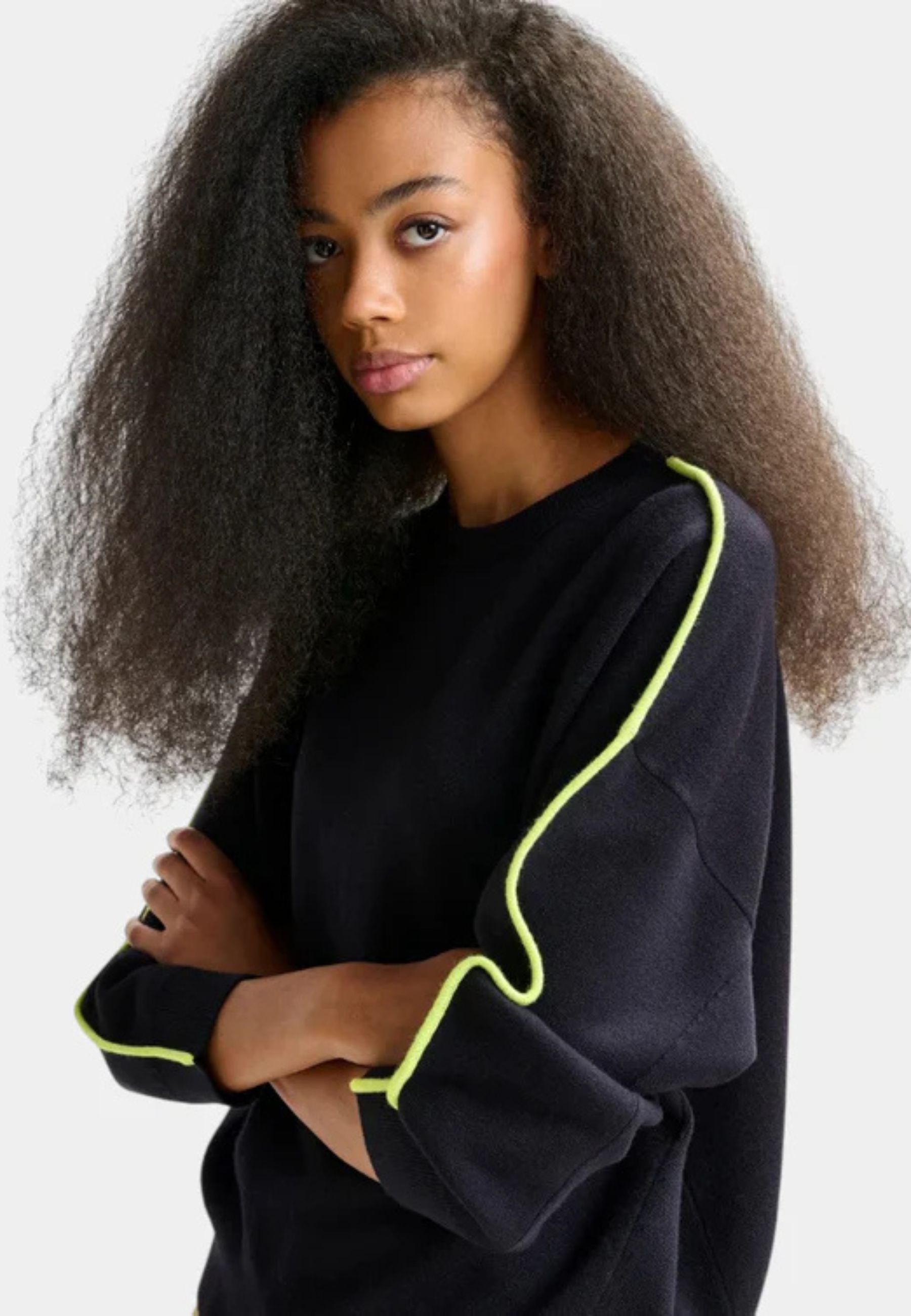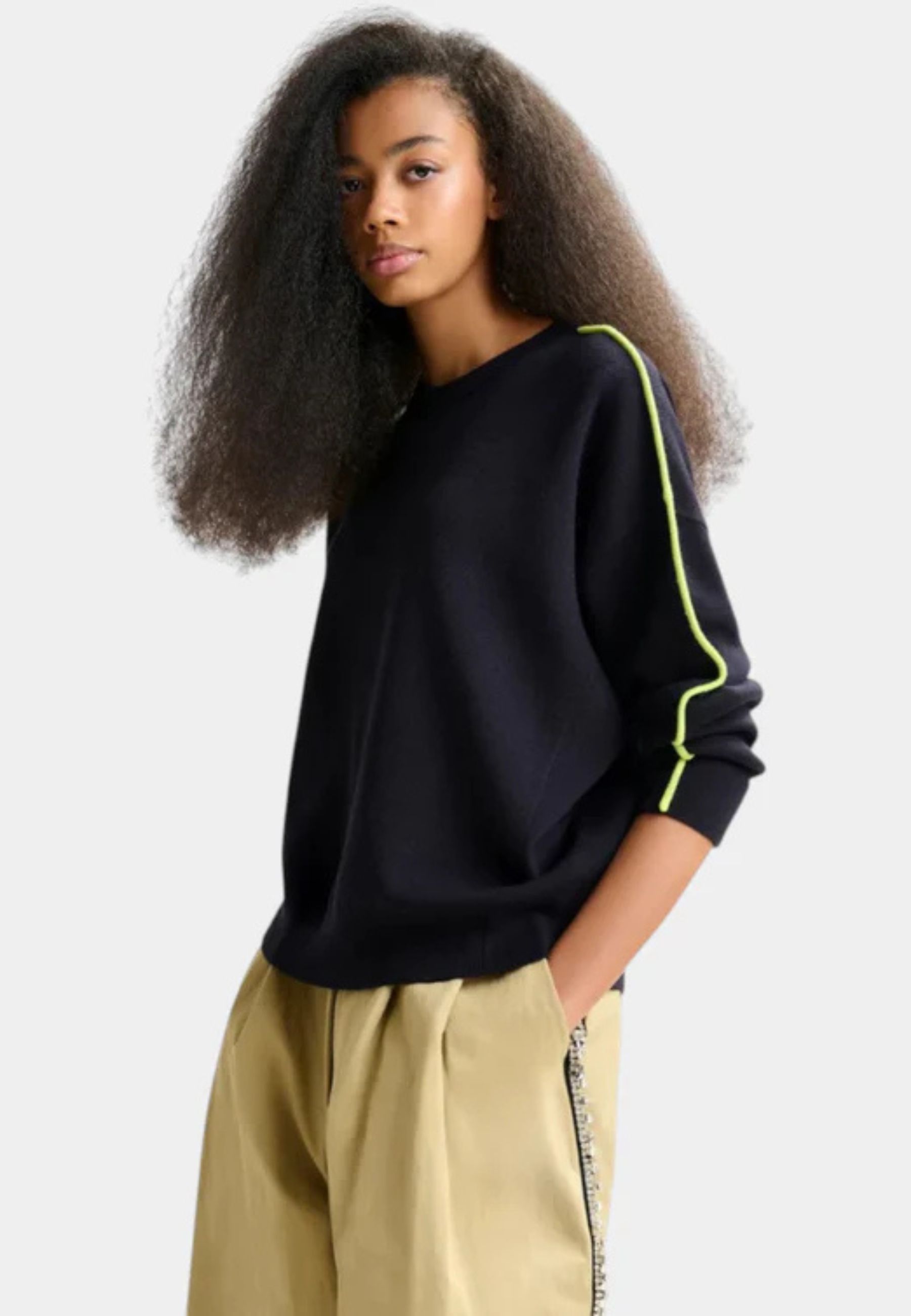 Il design è completato da una vita aderente con lavorazione a costine, studiata per valorizzare la figura e creare equilibrio con la parte superiore più ampia. Le cuciture laterali a contrasto verde aggiungono un dettaglio grafico discreto che arricchisce il minimalismo del capo.