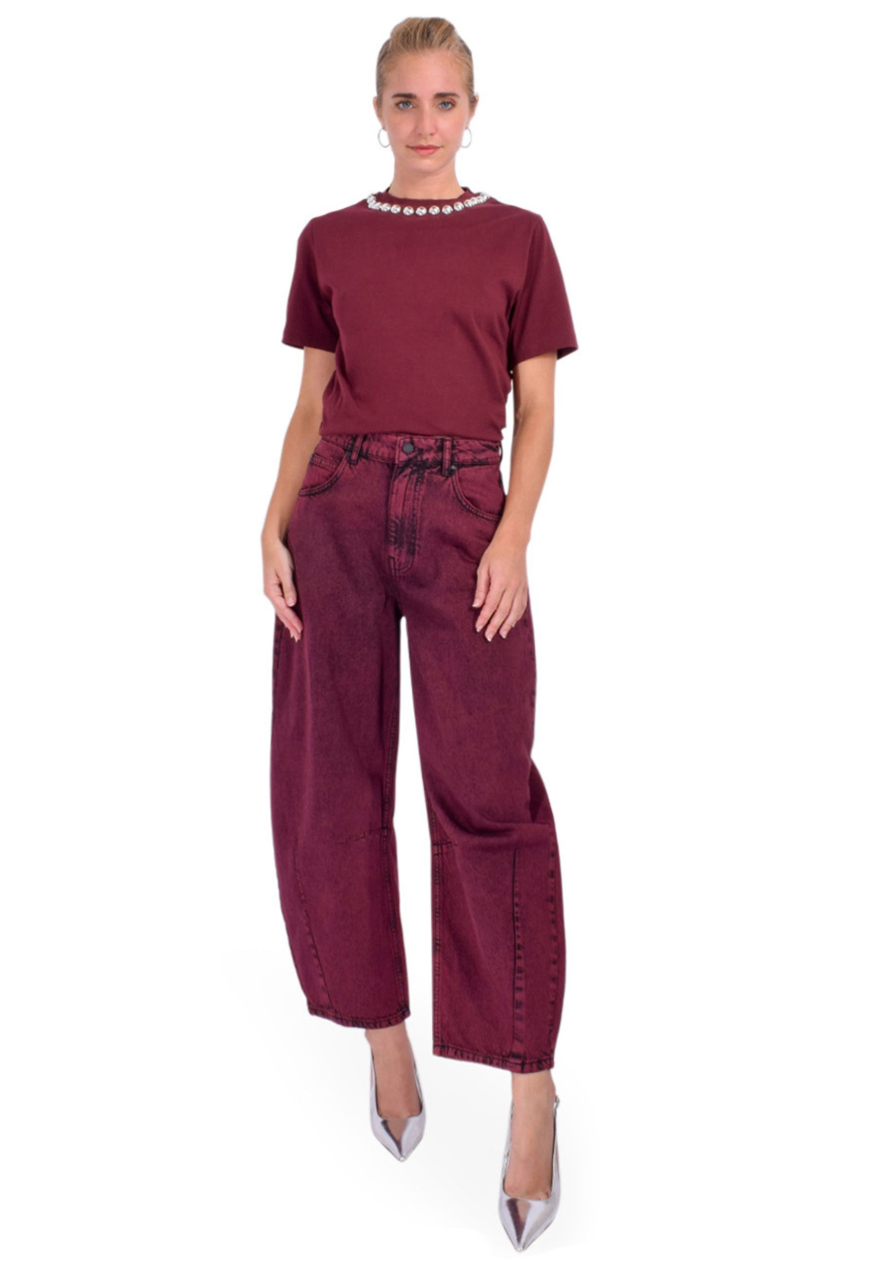 Questi jeans firmati Essentiel Antwerp reinterpretano il denim classico con una silhouette moderna e strutturata. Realizzati in denim di cotone organico, presentano una costruzione overdyed nel colore Margot Mauve, che dona profondità cromatica e un carattere distintivo al capo.