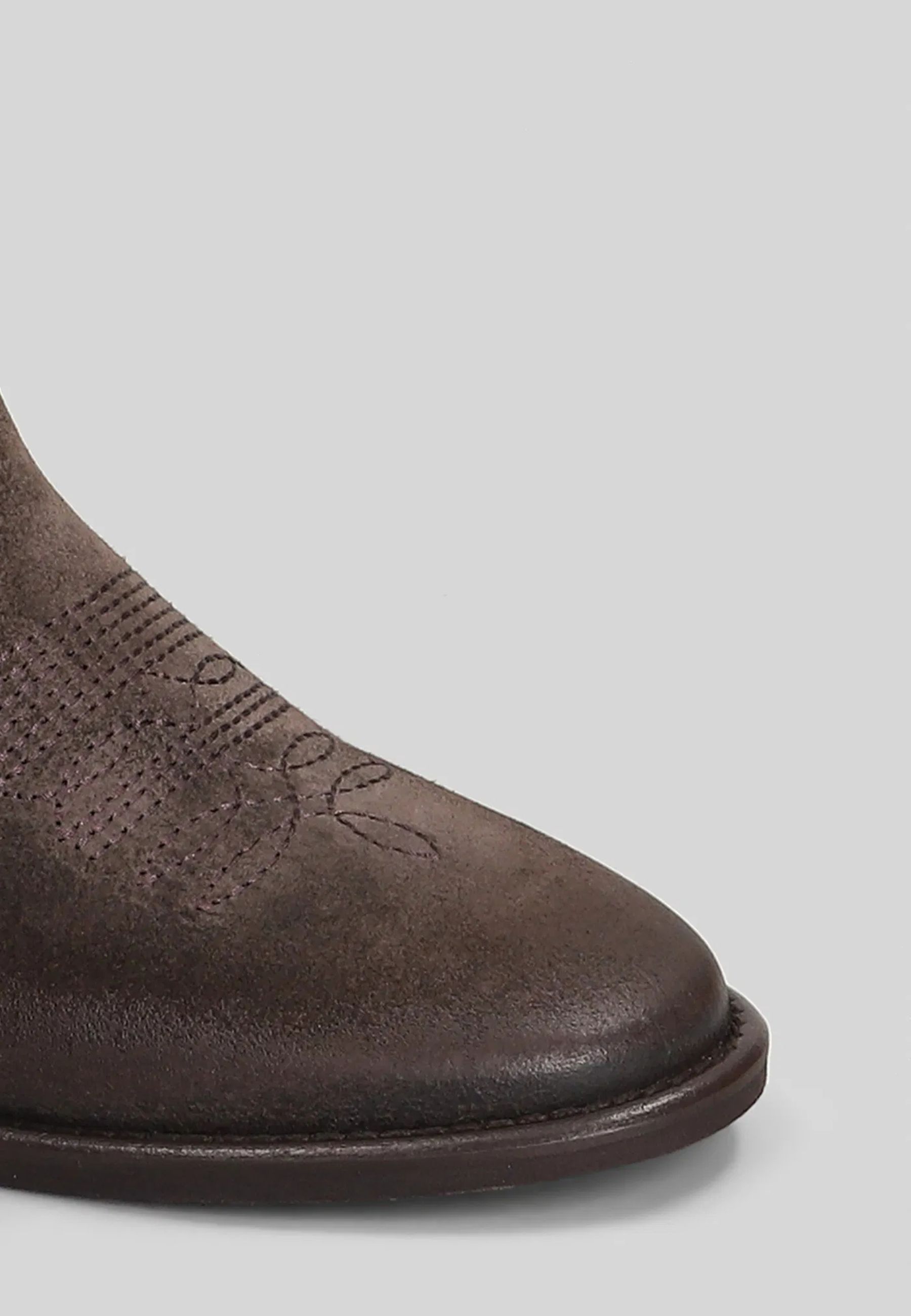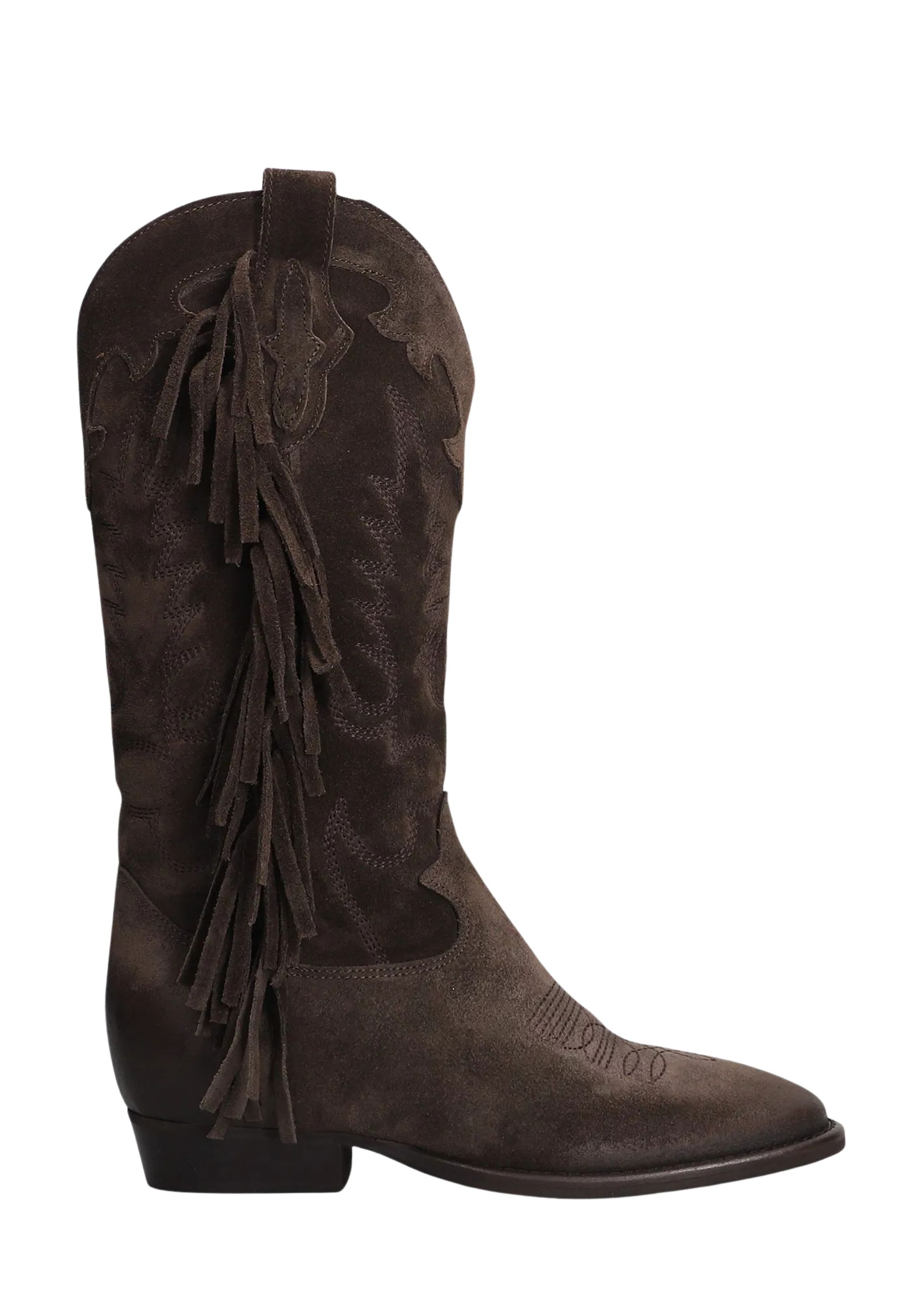 Gli stivali texani Oklahoma di Gisel Moirè reinterpretano lo stile western in chiave raffinata e contemporanea. Realizzati in 100% camoscio di alta qualità, si distinguono per la lavorazione ricamata all over e per le frange laterali, dettaglio iconico che dona movimento e carattere al design.