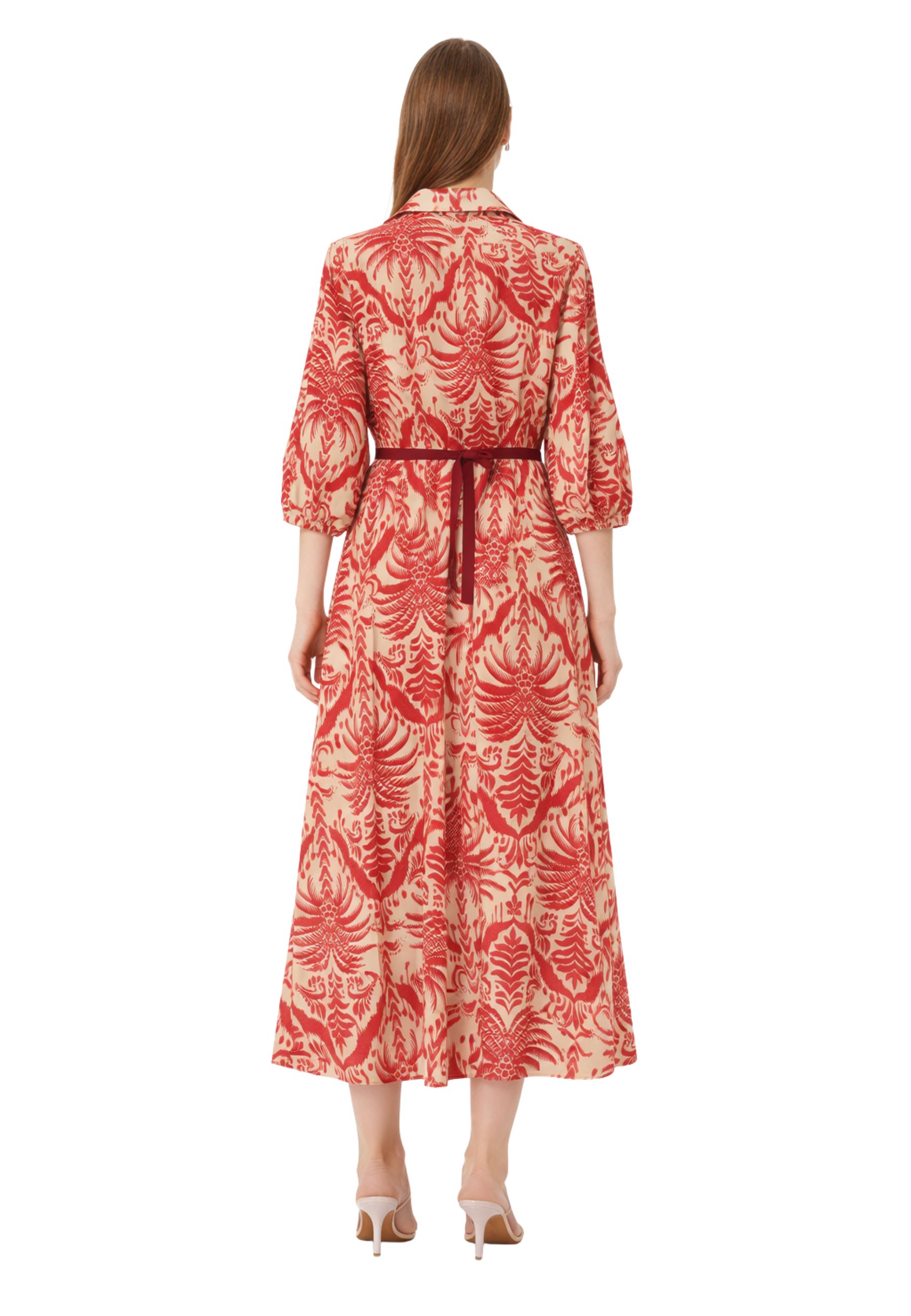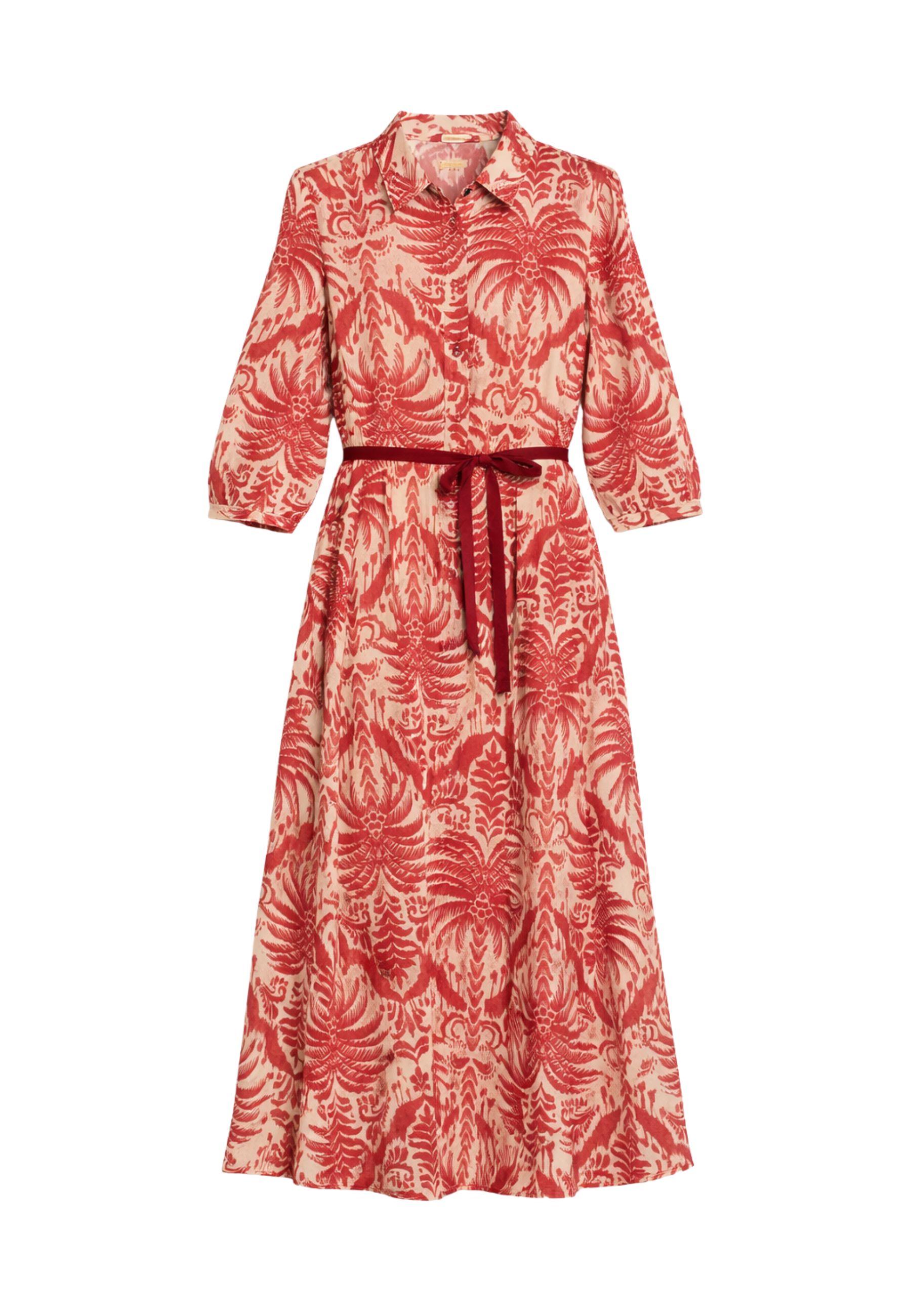 La linea chemisier svasata e scivolata valorizza la silhouette con naturalezza, mentre il colletto classico e la chiusura frontale con bottoni definiscono lestetica sartoriale del capo. Le maniche a tre quarti con arricciatura e bottone aggiungono un dettaglio femminile, mentre la vita elasticizzata sul retro e la cintura coordinata in tessuto permettono di regolare la vestibilità evidenziando il punto vita.