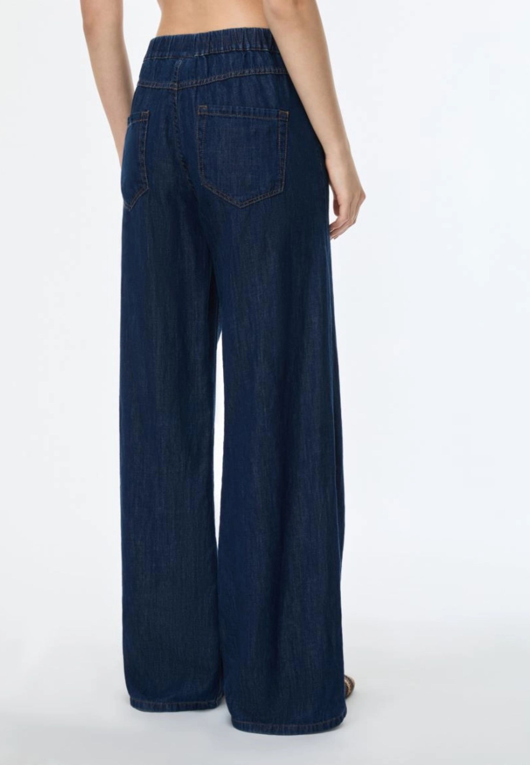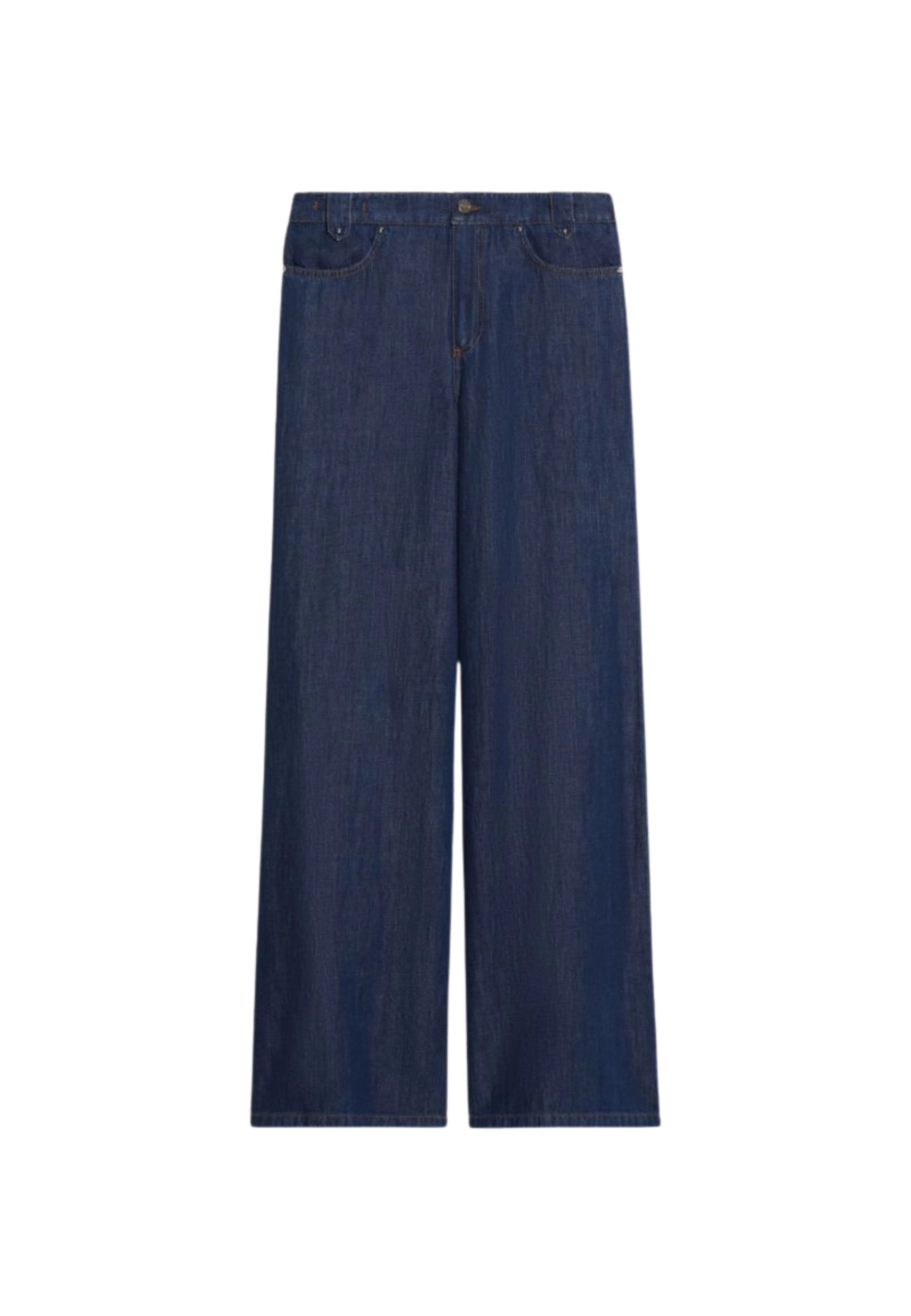 Realizzati in denim misto cotone e lino, offrono una texture fresca e naturale. Il modello presenta chiusura con bottone e zip nascosta, vita con elastico sul retro per una maggiore comodità e classiche tasche stondate sul davanti con tasche applicate sul retro. Le borchie applicate completano il design con un dettaglio discreto ma distintivo.