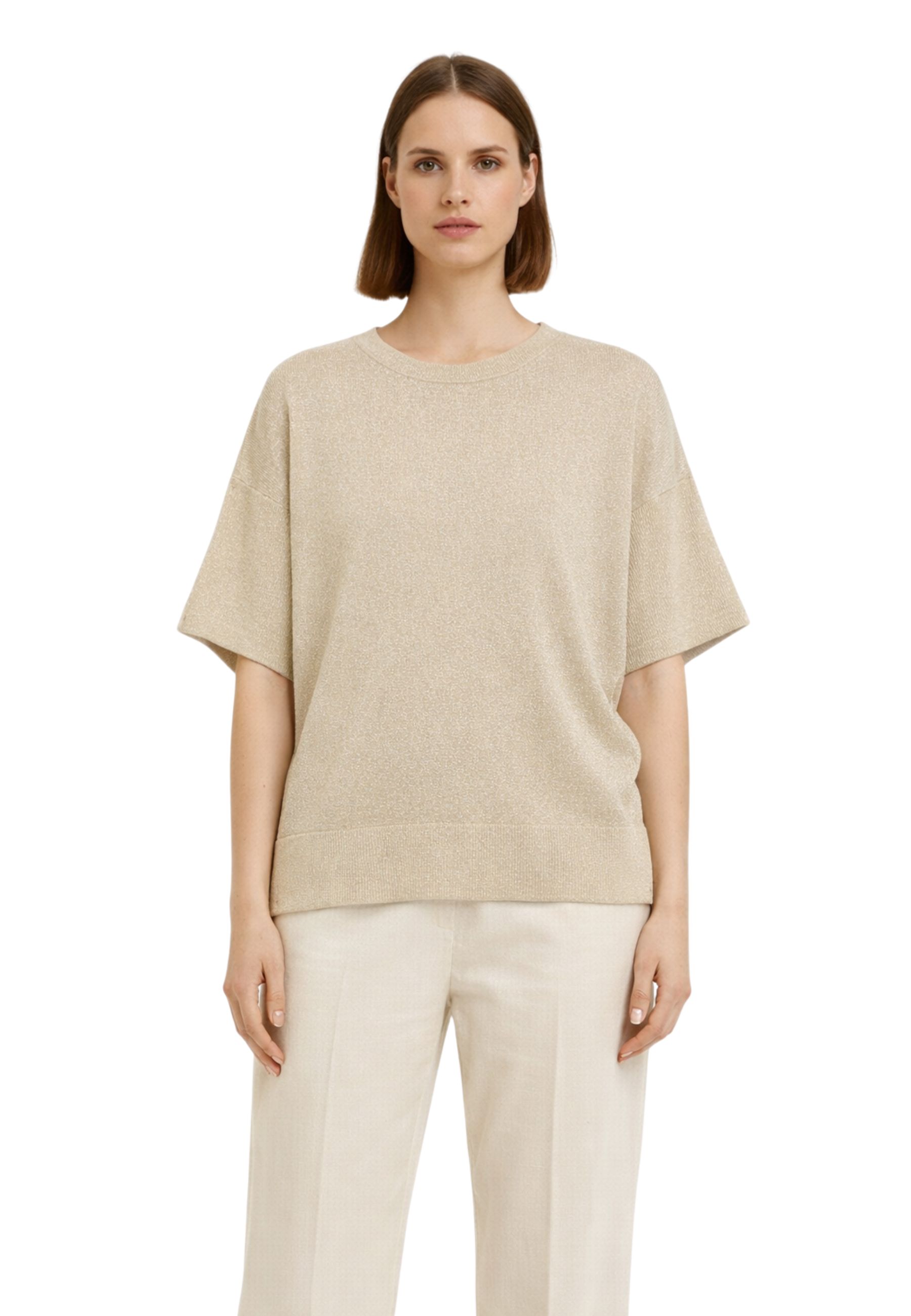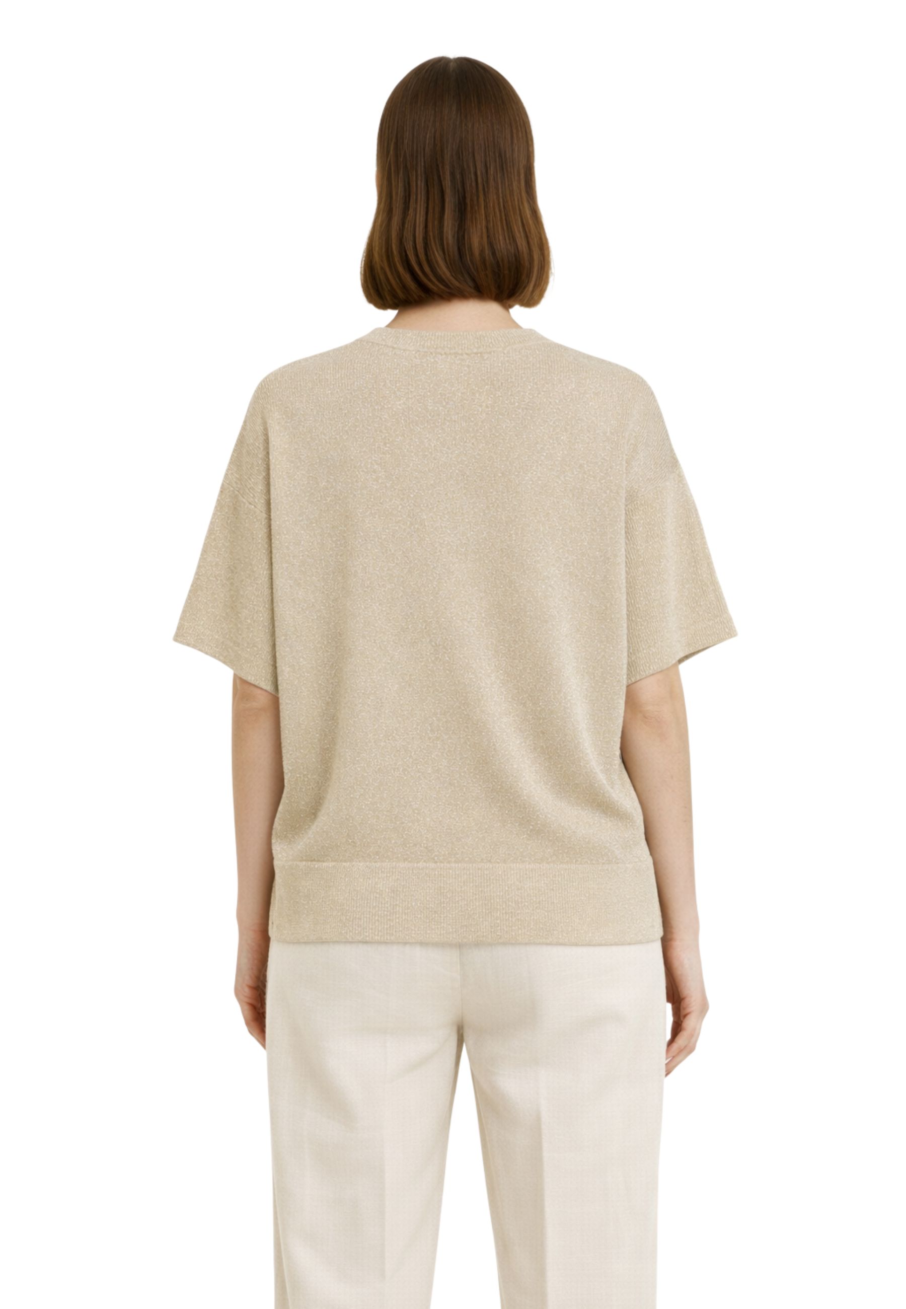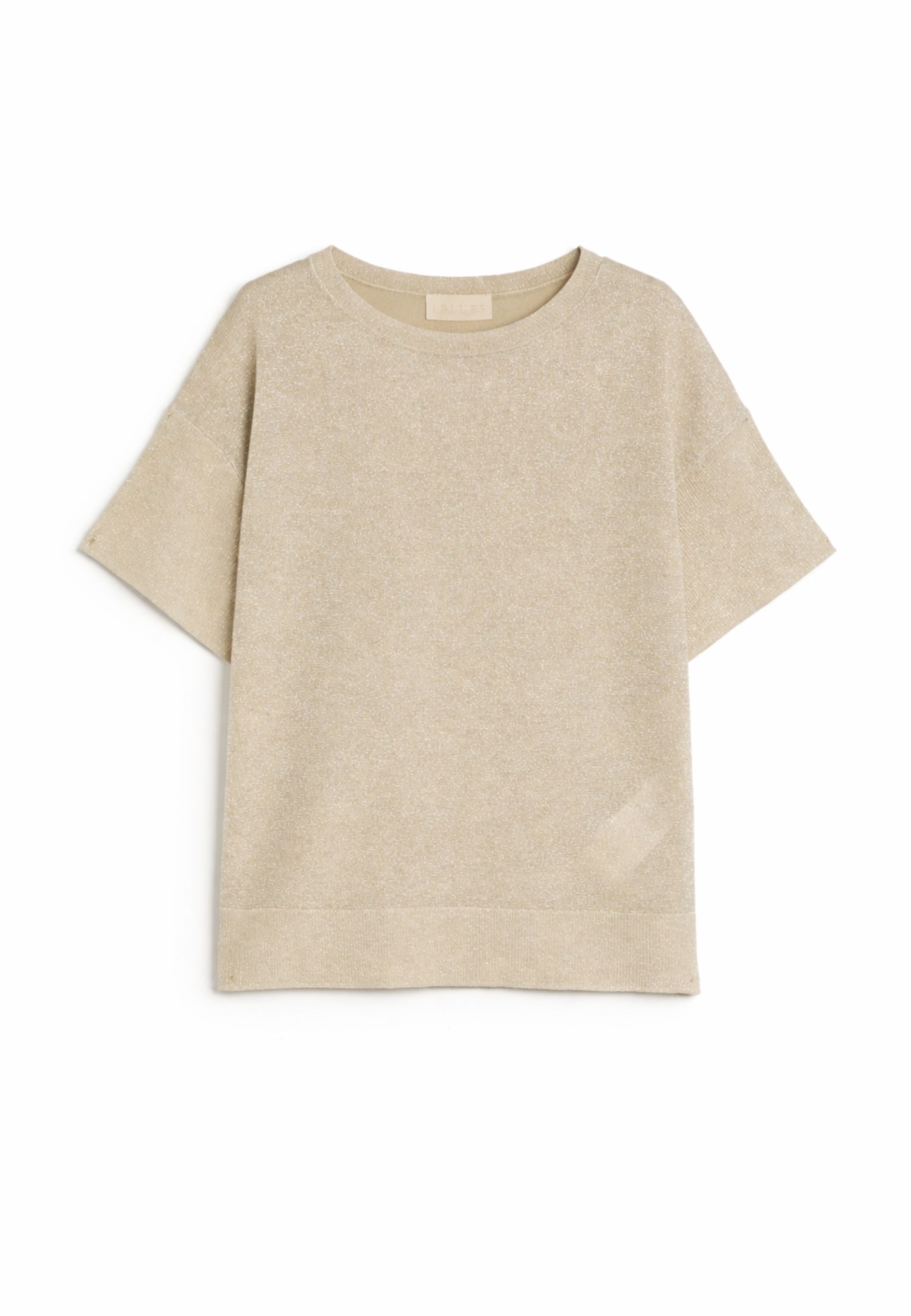 Maglia luminosa e raffinata realizzata in filato misto seta con lurex, perfetta per aggiungere un tocco elegante e contemporaneo al guardaroba quotidiano. La lavorazione con fibra metallizzata crea una delicata brillantezza che valorizza il capo mantenendo uno stile sofisticato.