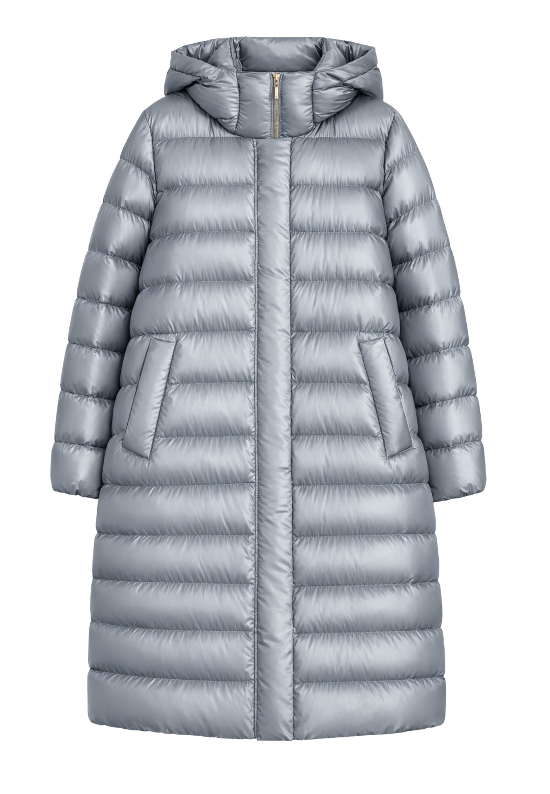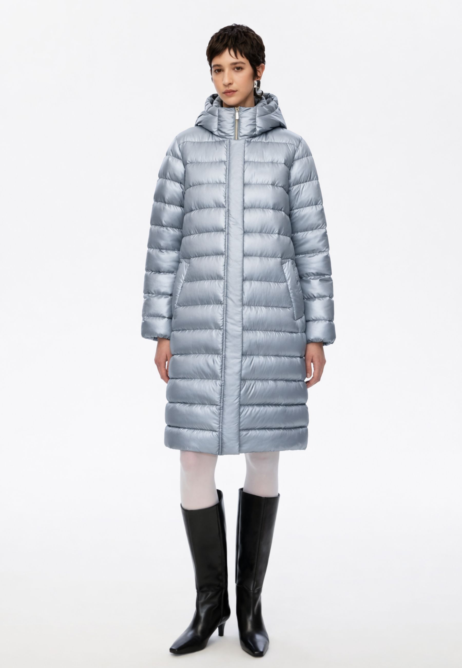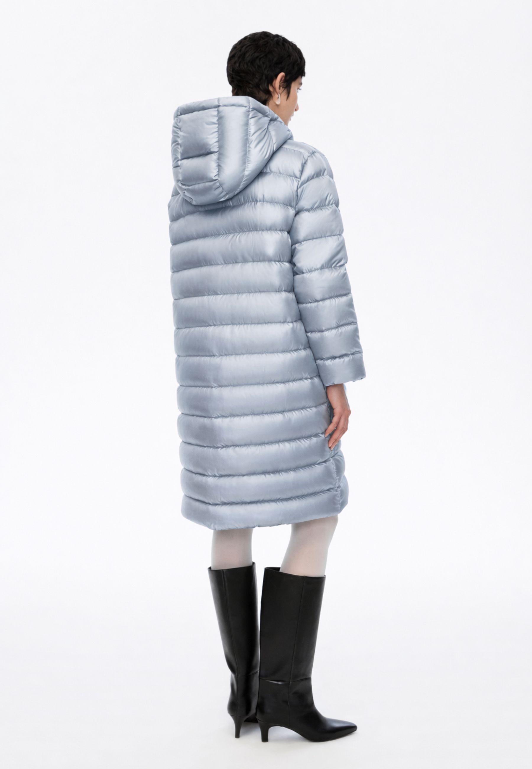 Il modello è caratterizzato da collo alto con cappuccio e maniche lunghe, ideali per offrire maggiore protezione dal freddo. La chiusura frontale con zip nascosta e bottoni a pressione mantiene il design pulito e raffinato, mentre le tasche a filetto con bottoni a pressione aggiungono funzionalità senza appesantire la linea.