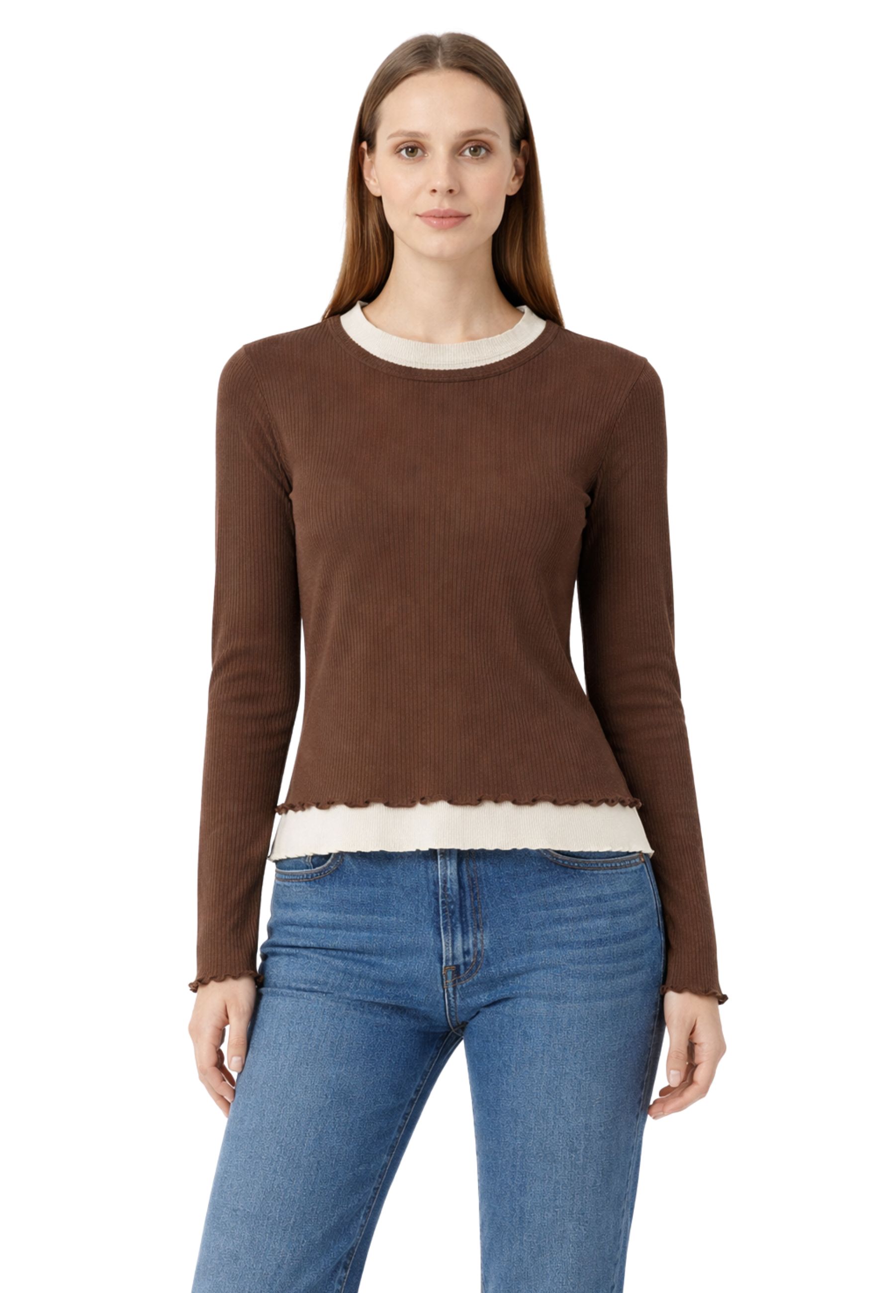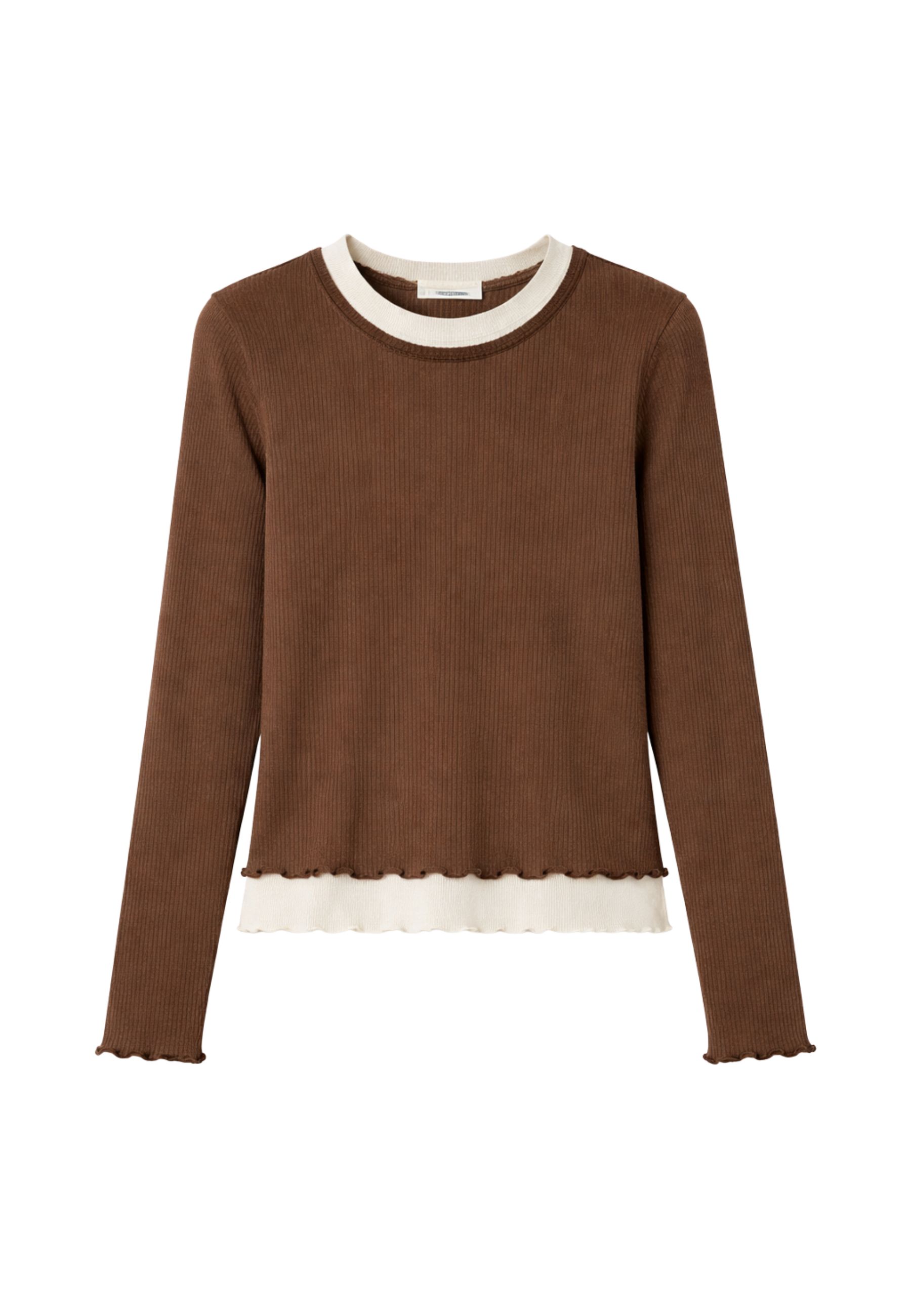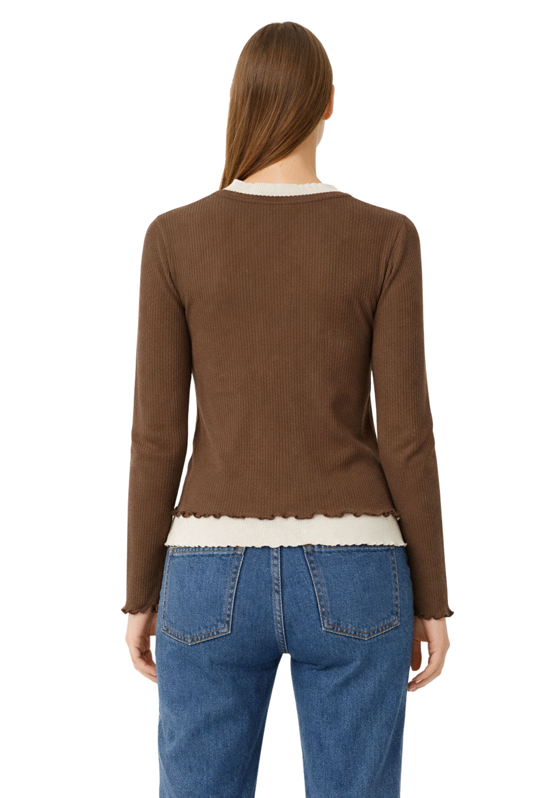 La linea semiaderente valorizza la silhouette mantenendo comfort e libertà di movimento. Il design è completato da scollo tondo, maniche lunghe e bordi con rifiniture ondulate che aggiungono un dettaglio femminile e contemporaneo.