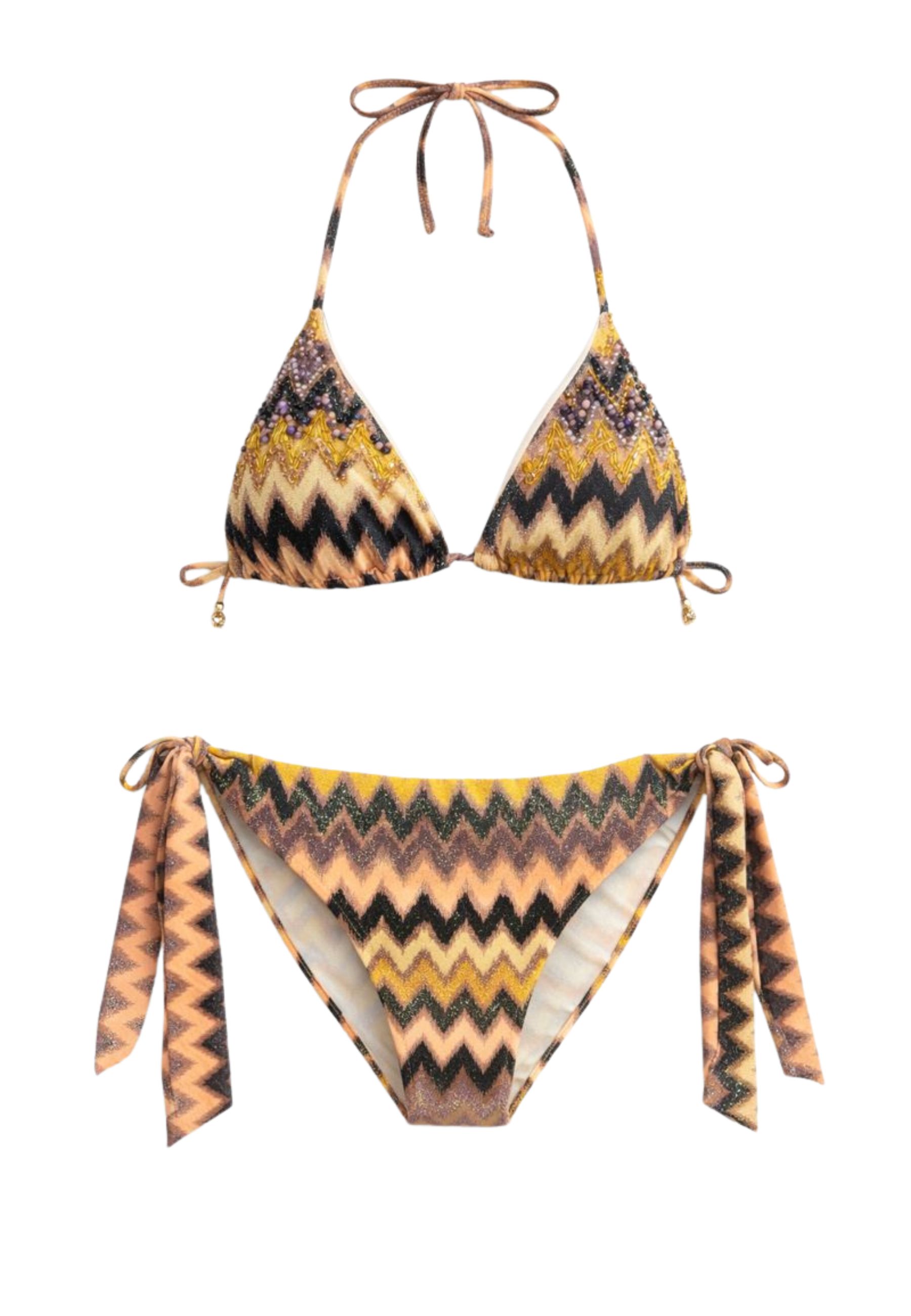 Bikini due pezzi firmato Ilaria Vitagliano, caratterizzato da una decisa personalità fashion e da una lavorazione ricercata. Il top a triangolo presenta una fantasia zig zag multicolor nei toni caldi del giallo, ocra, marrone e nero, arricchita da applicazioni decorative effetto gioiello sul décolleté che donano luminosità e un tocco luxury al capo. Le spalline sottili e lallacciatura regolabile assicurano una vestibilità personalizzabile e confortevole.