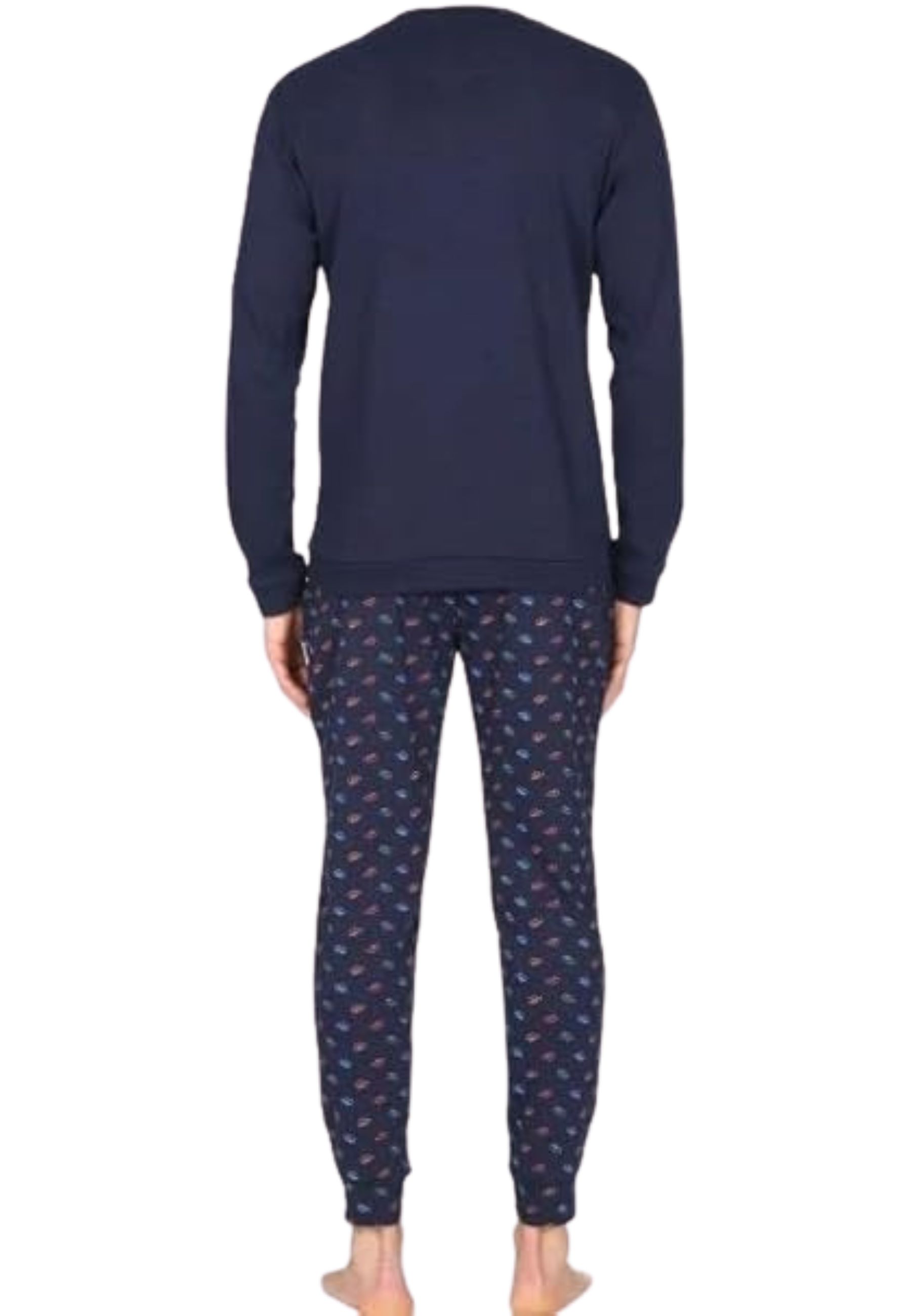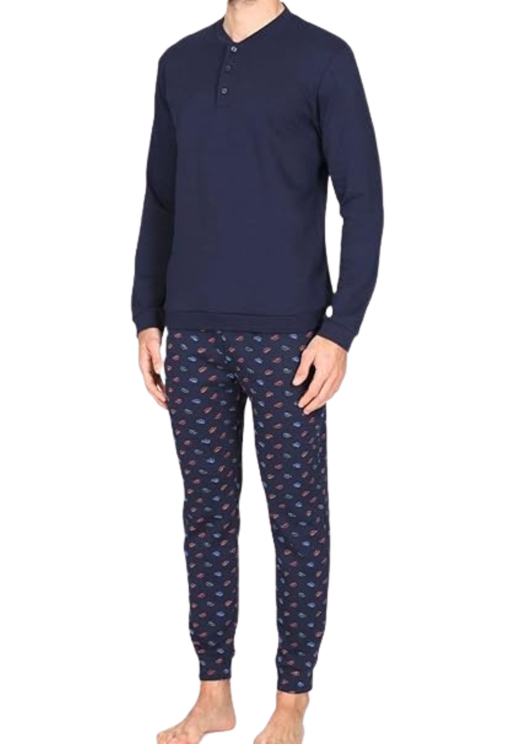 La maglia tinta unita blu è caratterizzata da collo serafino con bottoncini, mentre i pantaloni lunghi presentano una vivace fantasia slittini (colore 524) con fondo elasticizzato per una vestibilità perfetta.