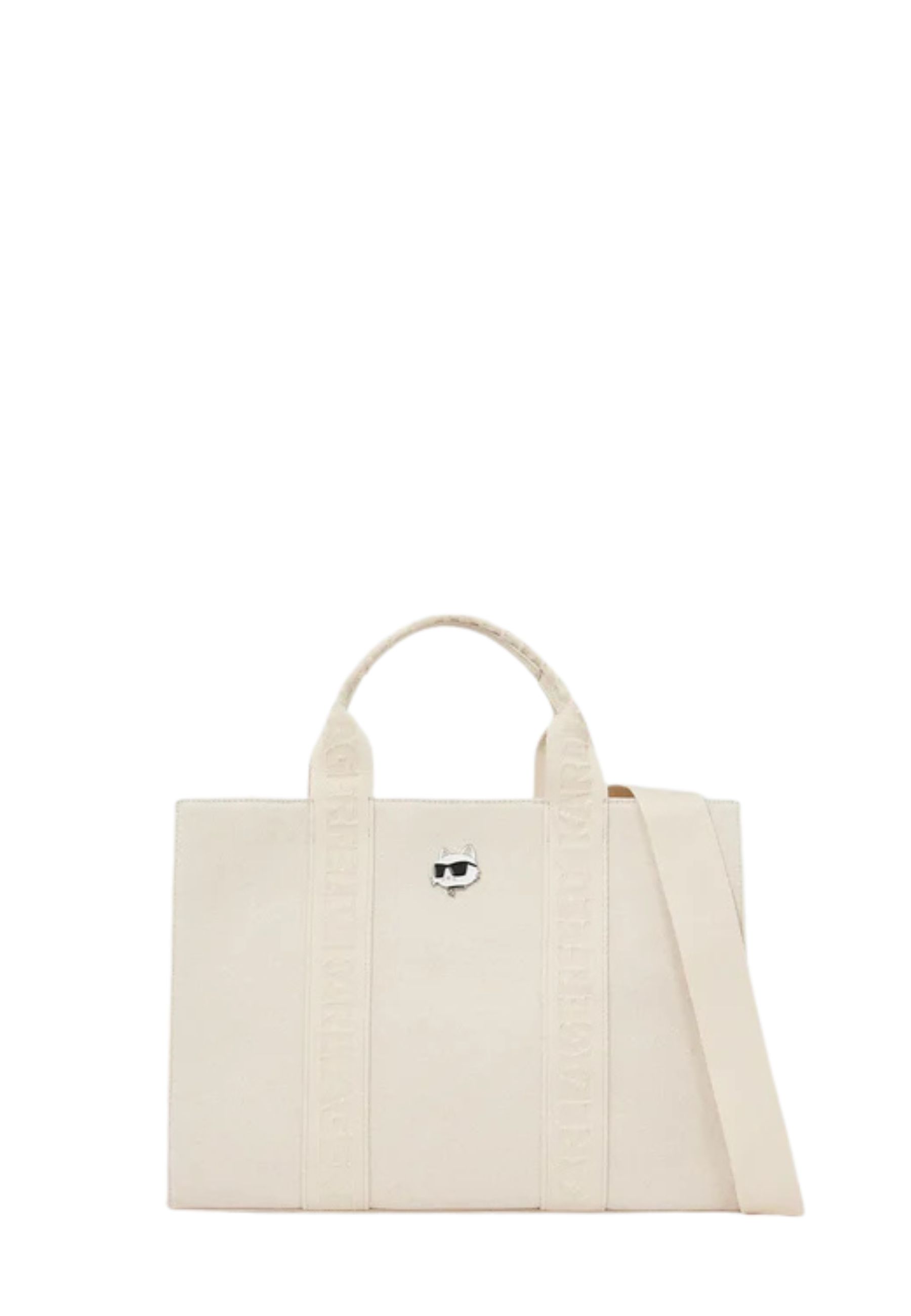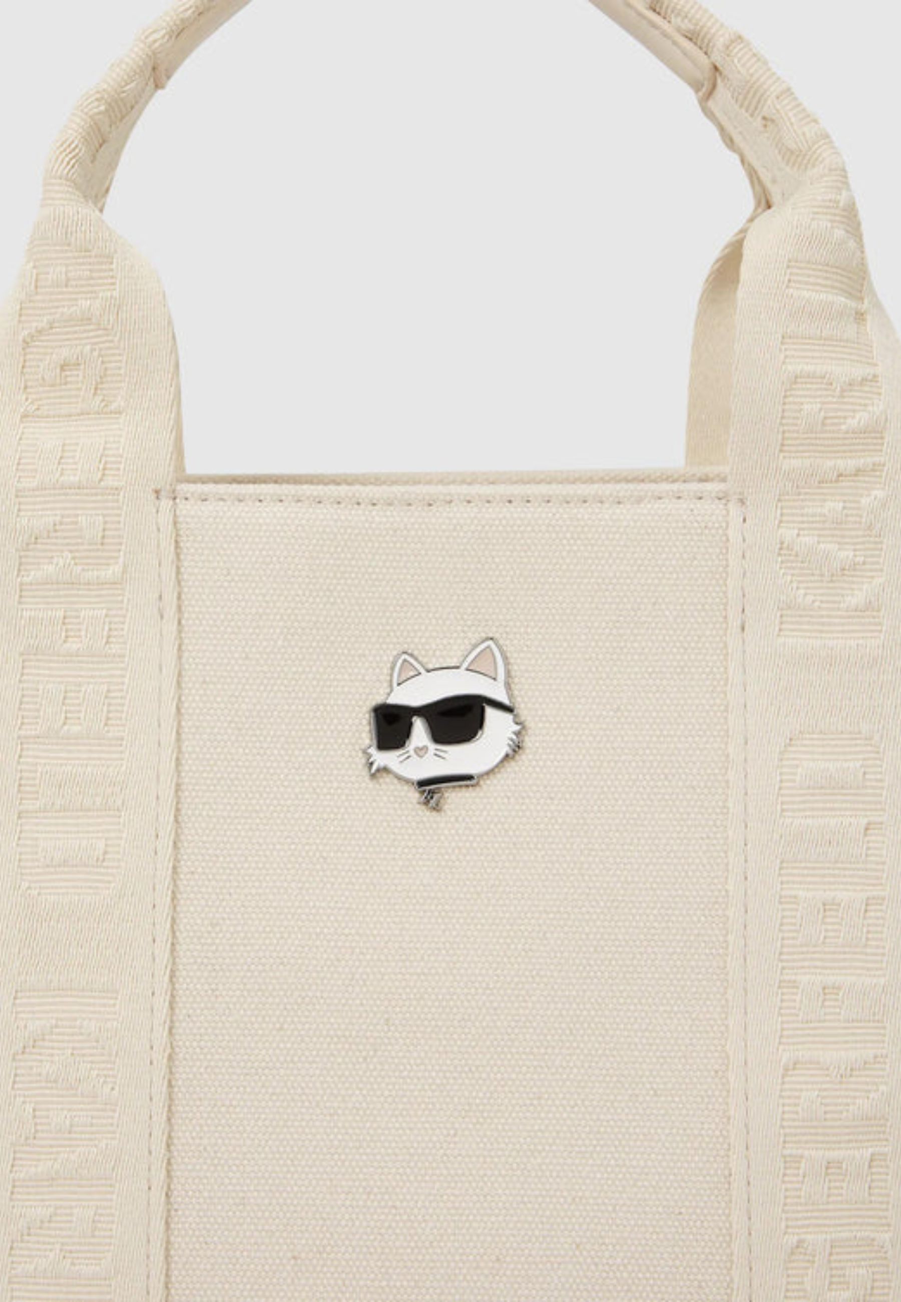 Il modello è dotato di due manici superiori per il trasporto a mano e di tracolla rimovibile che consente un utilizzo a spalla o crossbody. La spilla in metallo Ikon Choupette applicata sul pannello frontale aggiunge un elemento iconico e riconoscibile, mentre il logo KARL LAGERFELD tono su tono sui manici completa il design con discrezione.