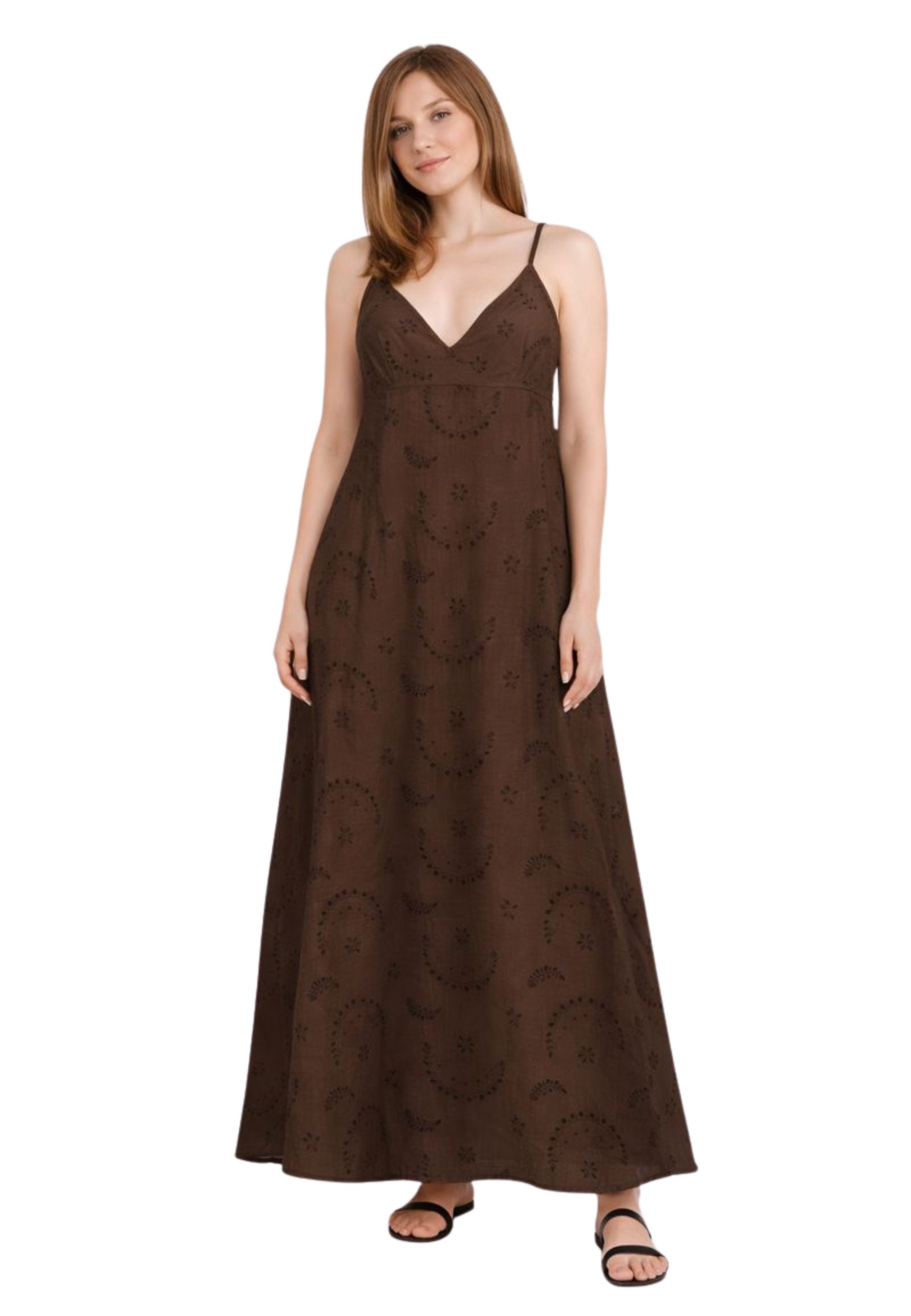 Il tessuto è impreziosito da un raffinato ricamo traforato all-over in stile sangallo, che dona leggerezza e unestetica ricercata al capo. La lunghezza maxi conferisce uneleganza rilassata, perfetta sia per il giorno che per occasioni serali informali. Un abito versatile, da indossare con sandali flat per il giorno o con accessori più sofisticati per la sera.