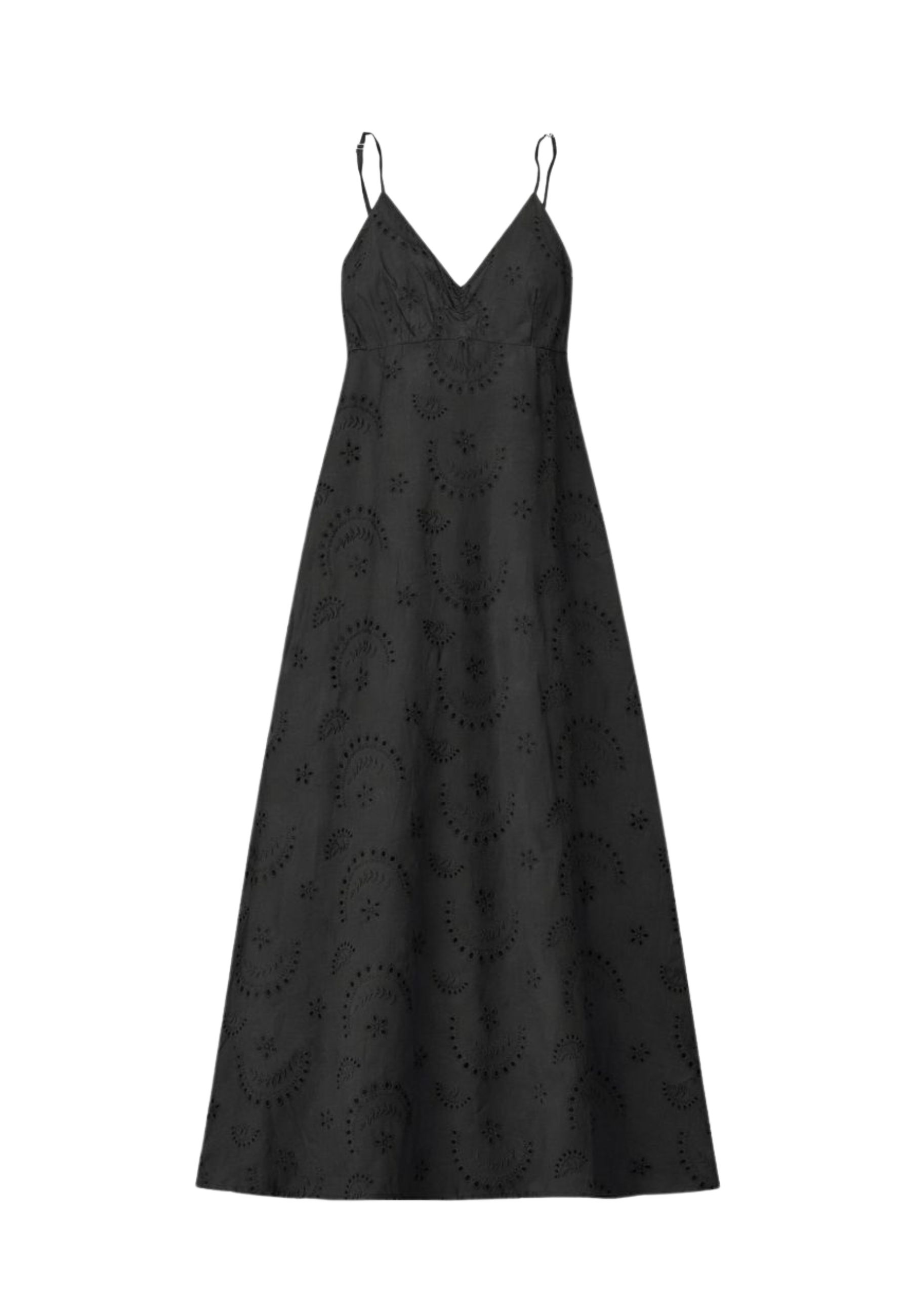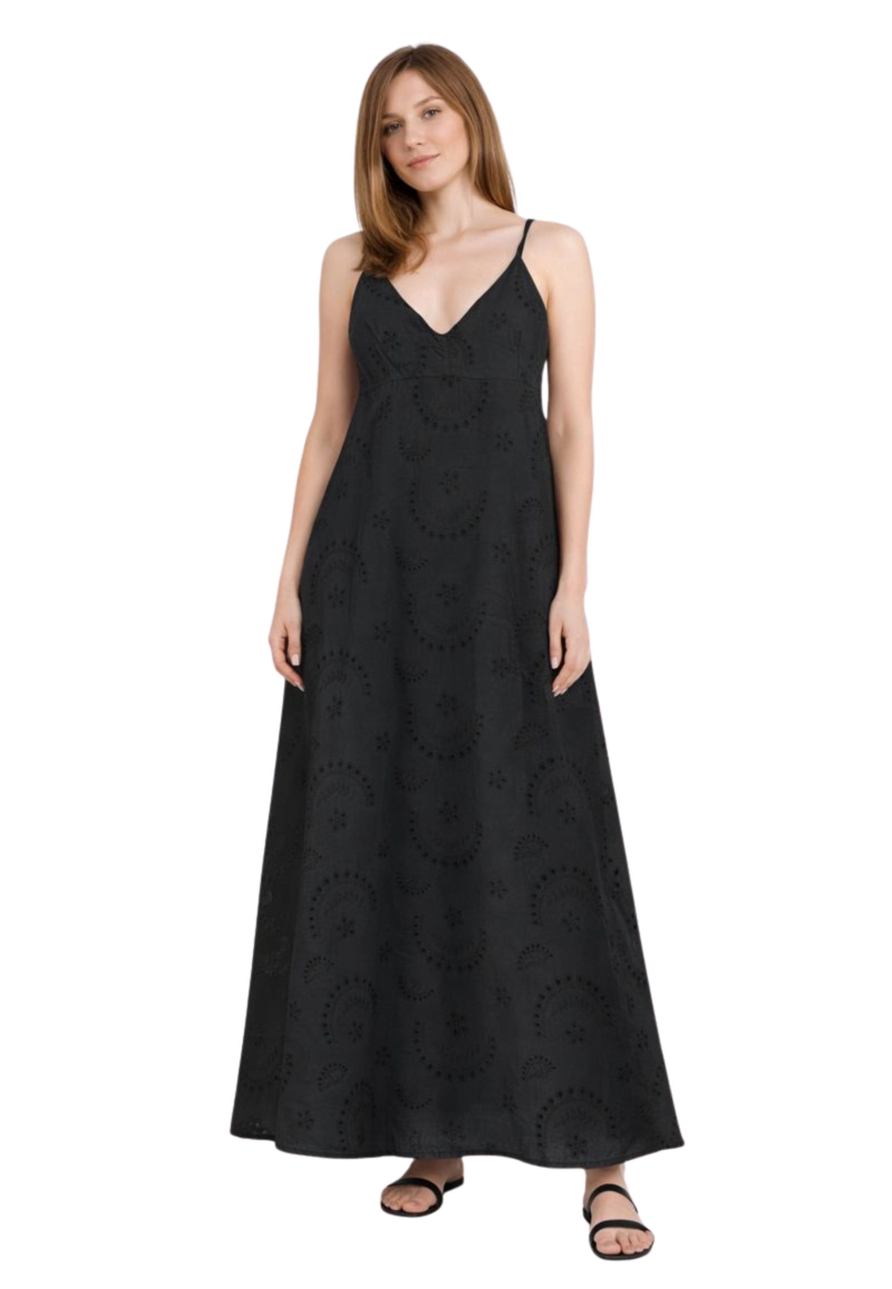 Il tessuto è impreziosito da un raffinato ricamo traforato all-over in stile sangallo, che dona leggerezza e unestetica ricercata al capo. La lunghezza maxi conferisce uneleganza rilassata, perfetta sia per il giorno che per occasioni serali informali. Un abito versatile, da indossare con sandali flat per il giorno o con accessori più sofisticati per la sera.