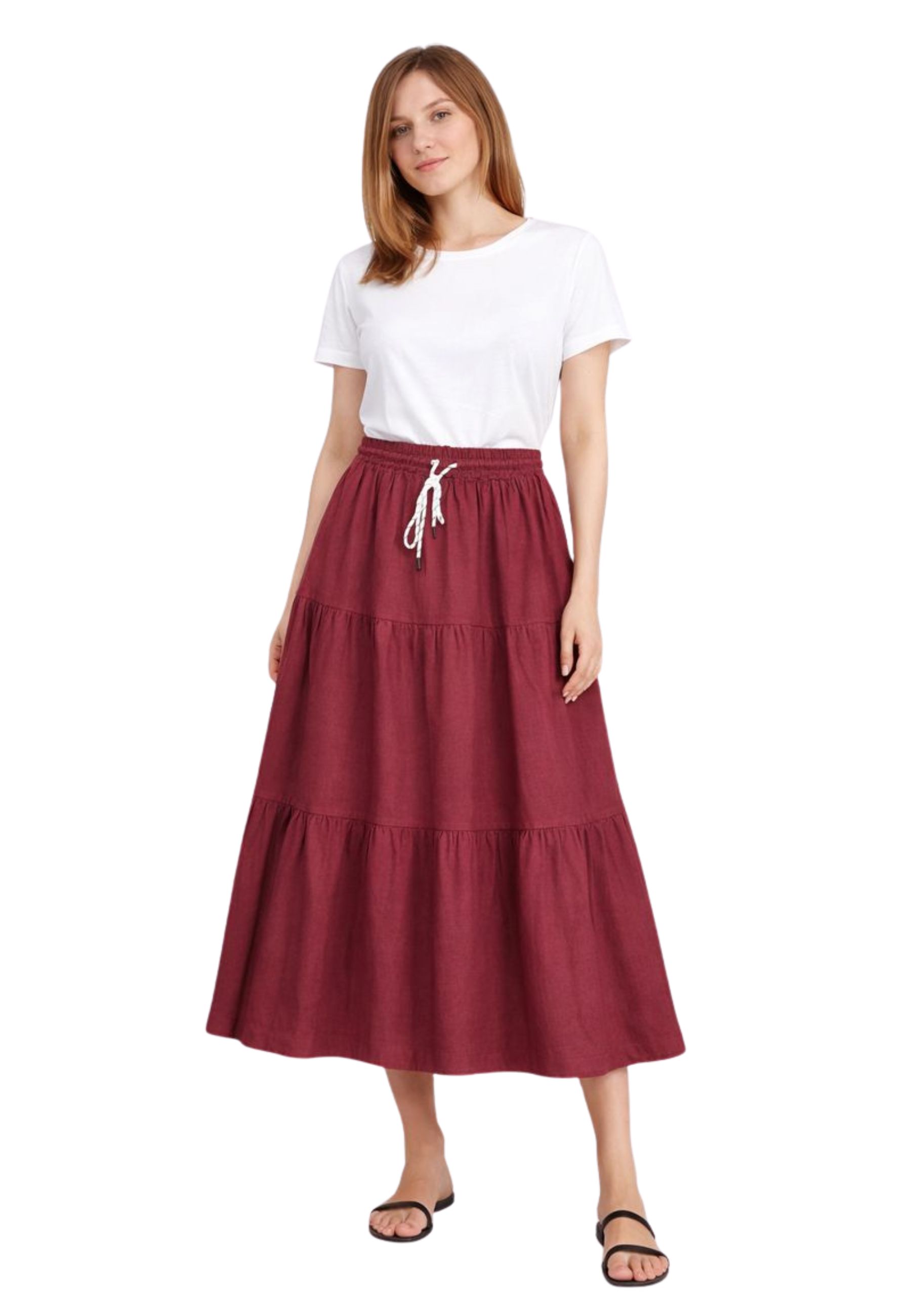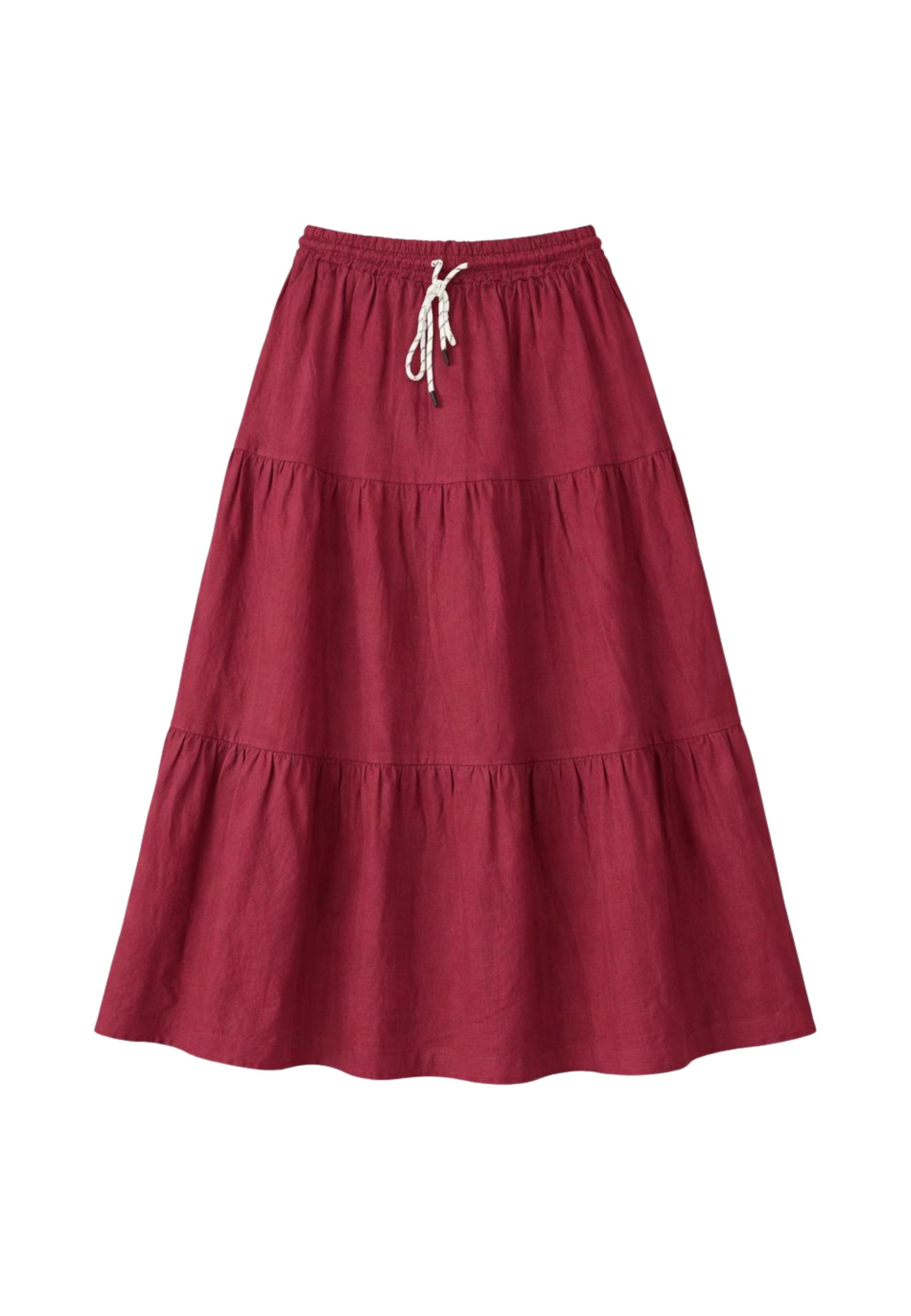 La linea fluida con balze dona movimento e un effetto femminile, rendendo la gonna perfetta per la stagione primavera-estate. Il tessuto in lino e viscosa assicura traspirabilità e una piacevole sensazione sulla pelle, mentre la tonalità bordeaux aggiunge carattere ed eleganza al capo.