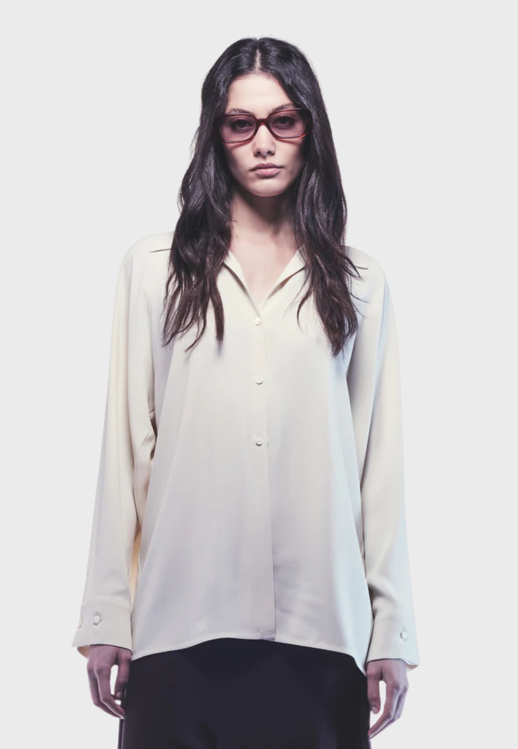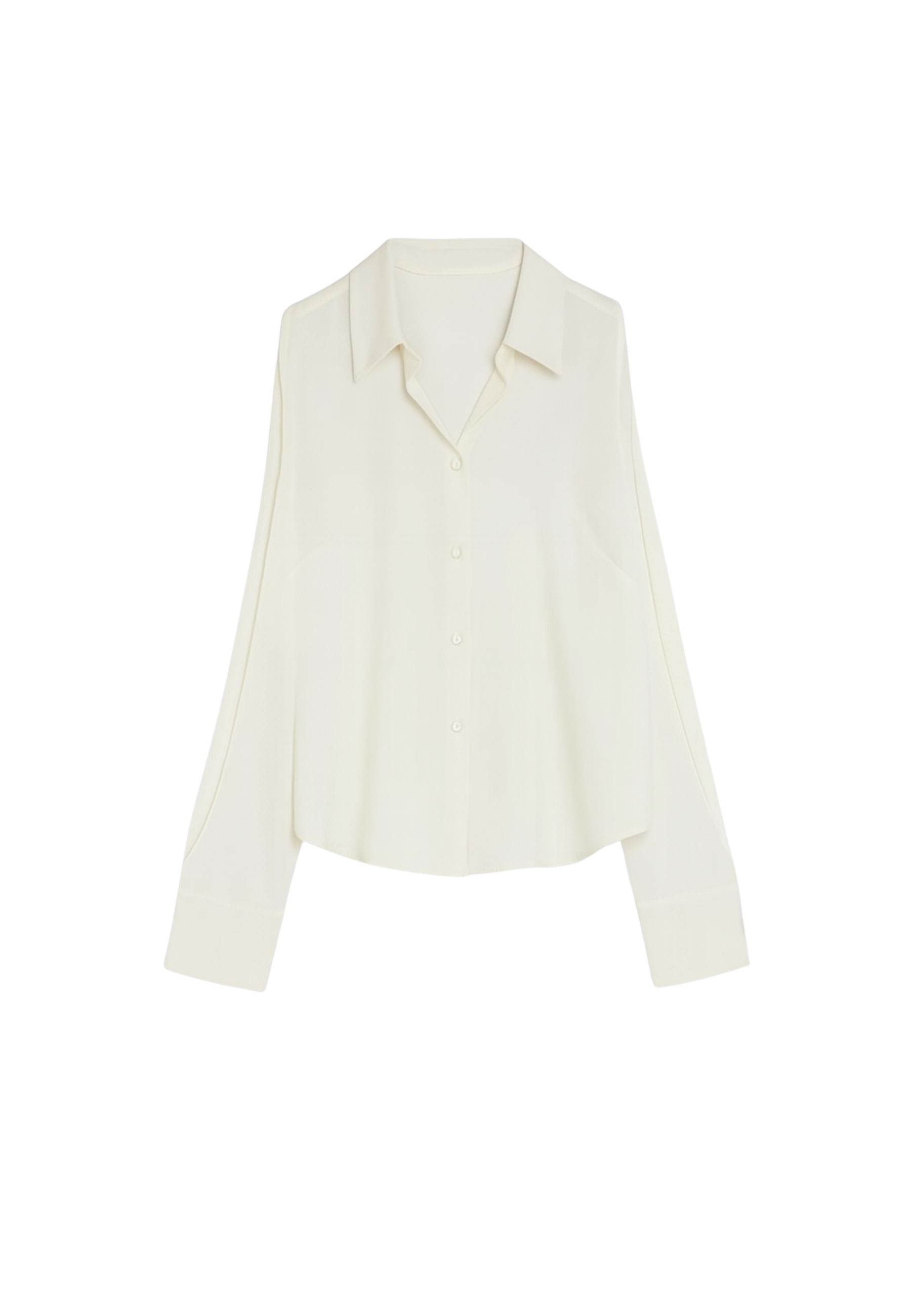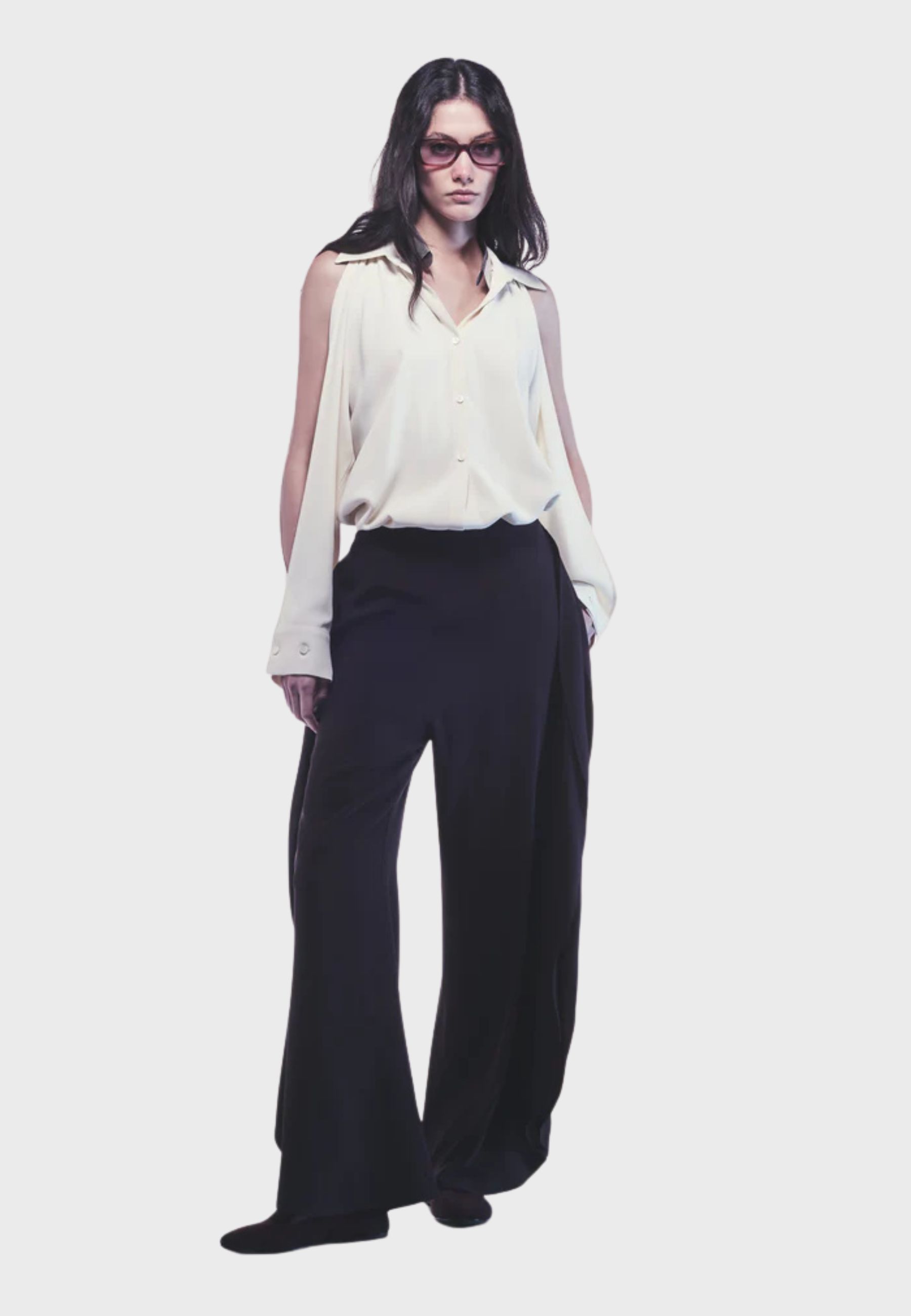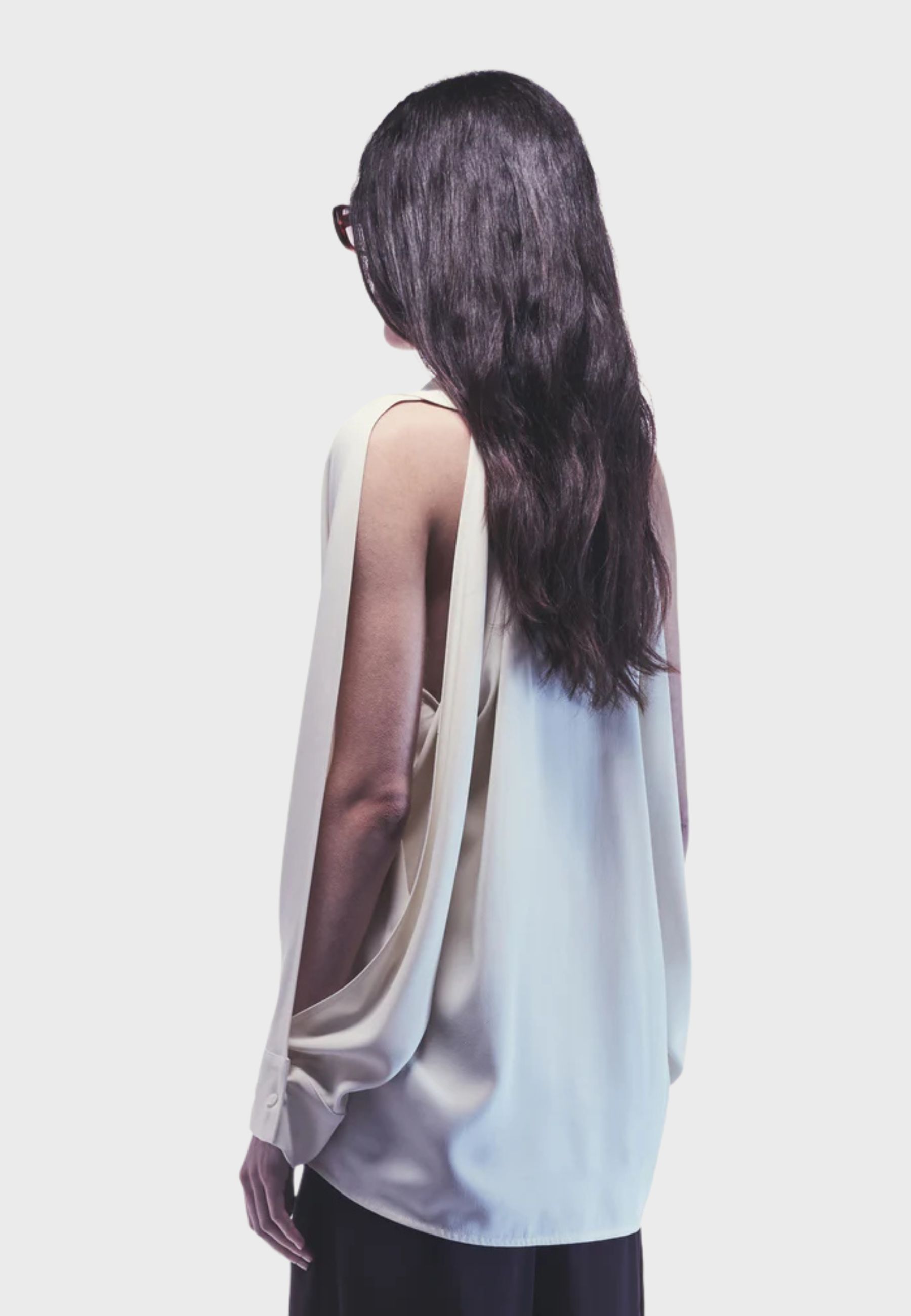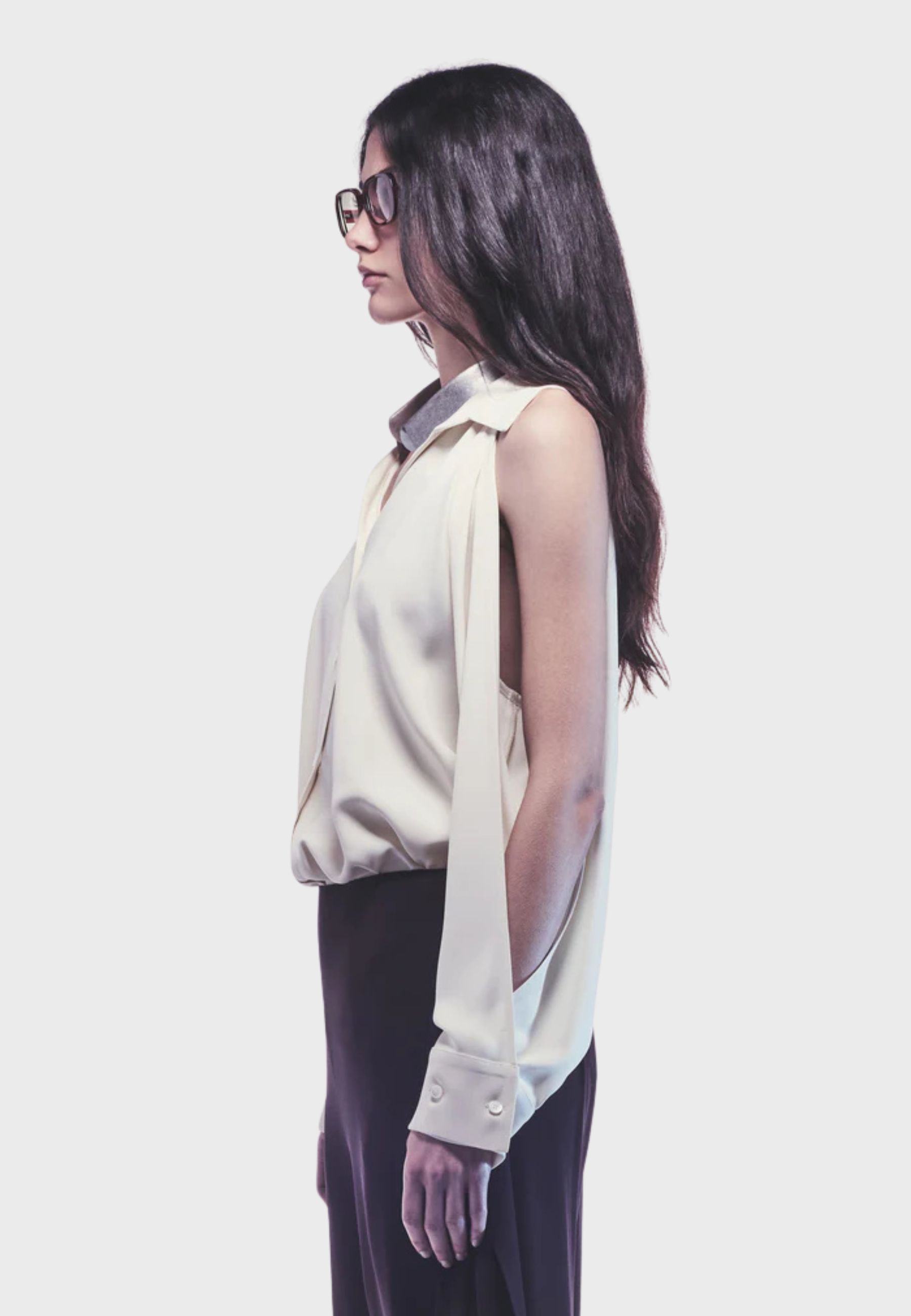 Blusa in tessuto drap fluido, caratterizzata da un design elegante e contemporaneo. Il colletto a punta e la chiusura frontale la rendono versatile, mentre i dettagli cut-out sulle maniche creano un raffinato effetto drappeggiato. I polsini con bottoni completano il capo con una finitura sofisticata.