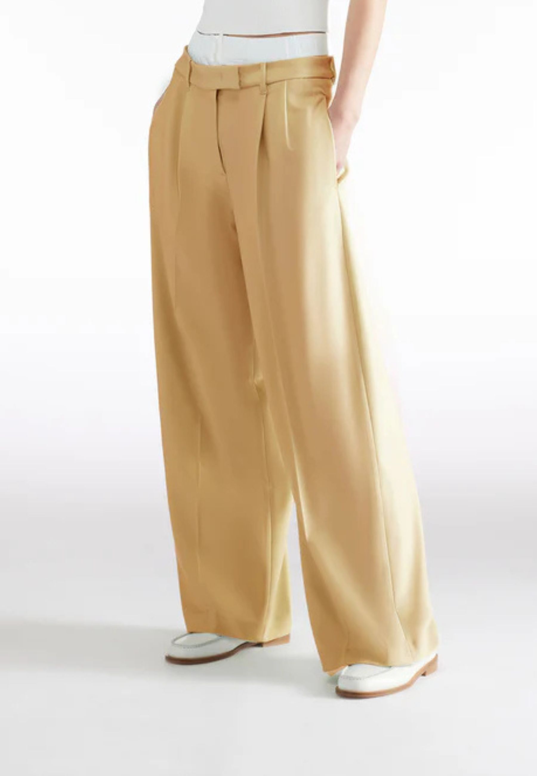 Eleganza contemporanea e taglio sartoriale si fondono in questo pantalone in gabardina di lana. Caratterizzato da una gamba ampia e fluida, presenta un raffinato doppio strato in vita in tela di cotone che aggiunge un tocco strutturato e moderno. Il fascione con passanti assicura una perfetta vestibilità e consente di abbinare cinture per personalizzare il look.