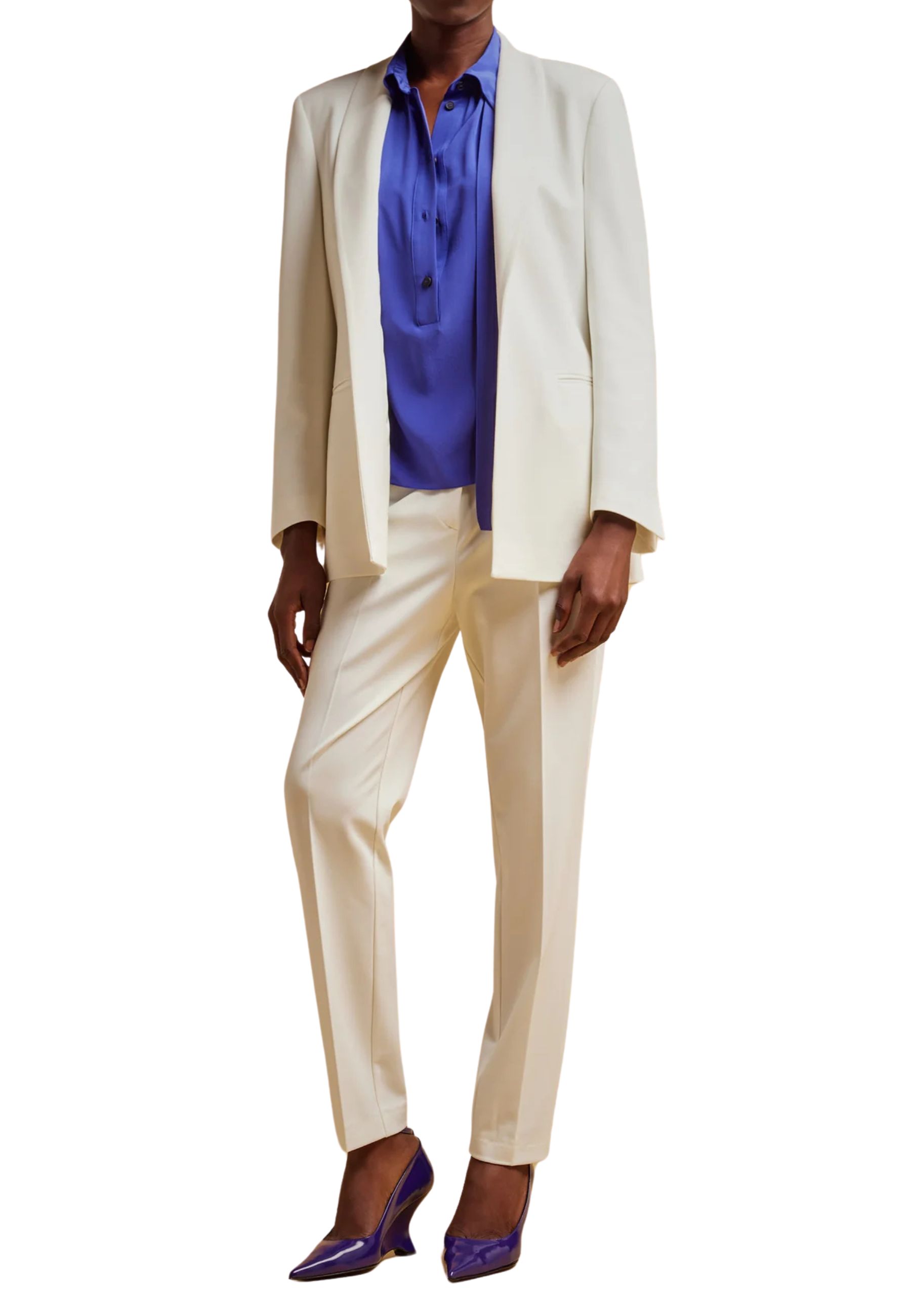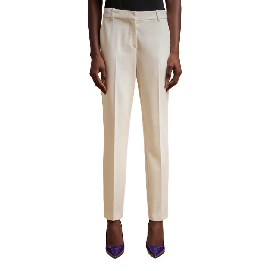 Pantaloni sartoriali in punto milano lucido, chiusura frontale con bottoni e zip, due tasche laterali oblique, due tasche posteriori a filetto, taglio slim e taglio crop. Vestibilità regular