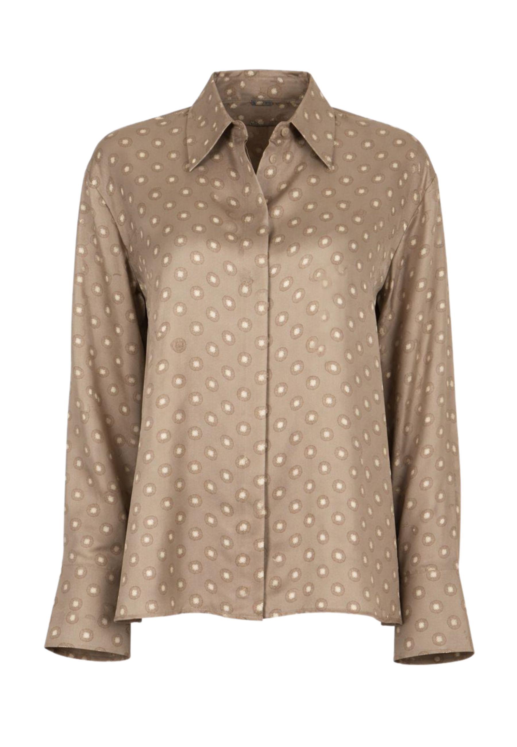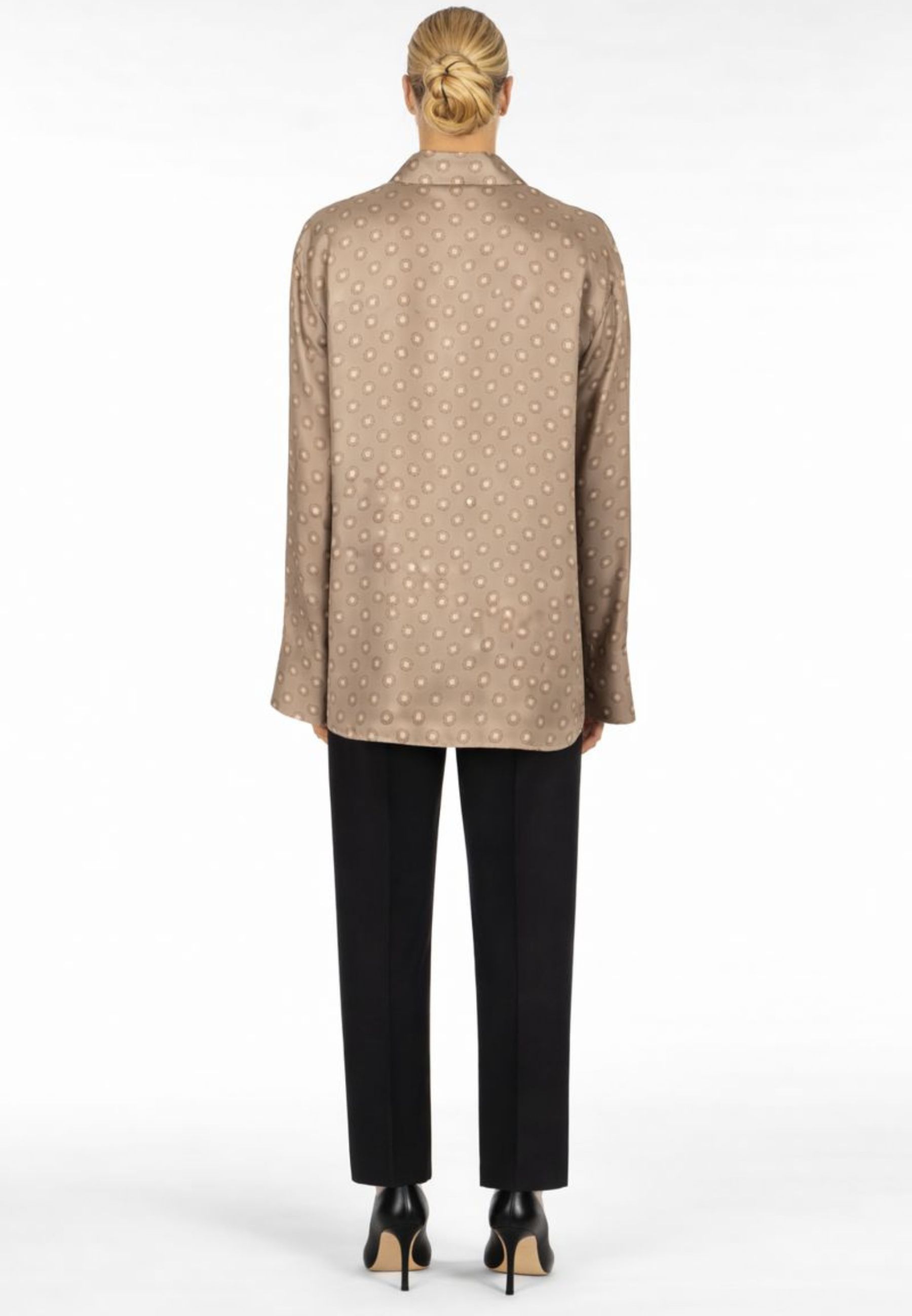 La chiusura frontale con bottoni nascosti mantiene unestetica pulita ed essenziale, valorizzando la leggerezza del tessuto e la qualità della stampa. Un capo ideale da indossare sia in contesti formali, abbinato a pantaloni sartoriali o gonne eleganti, sia per look più contemporanei e raffinati.