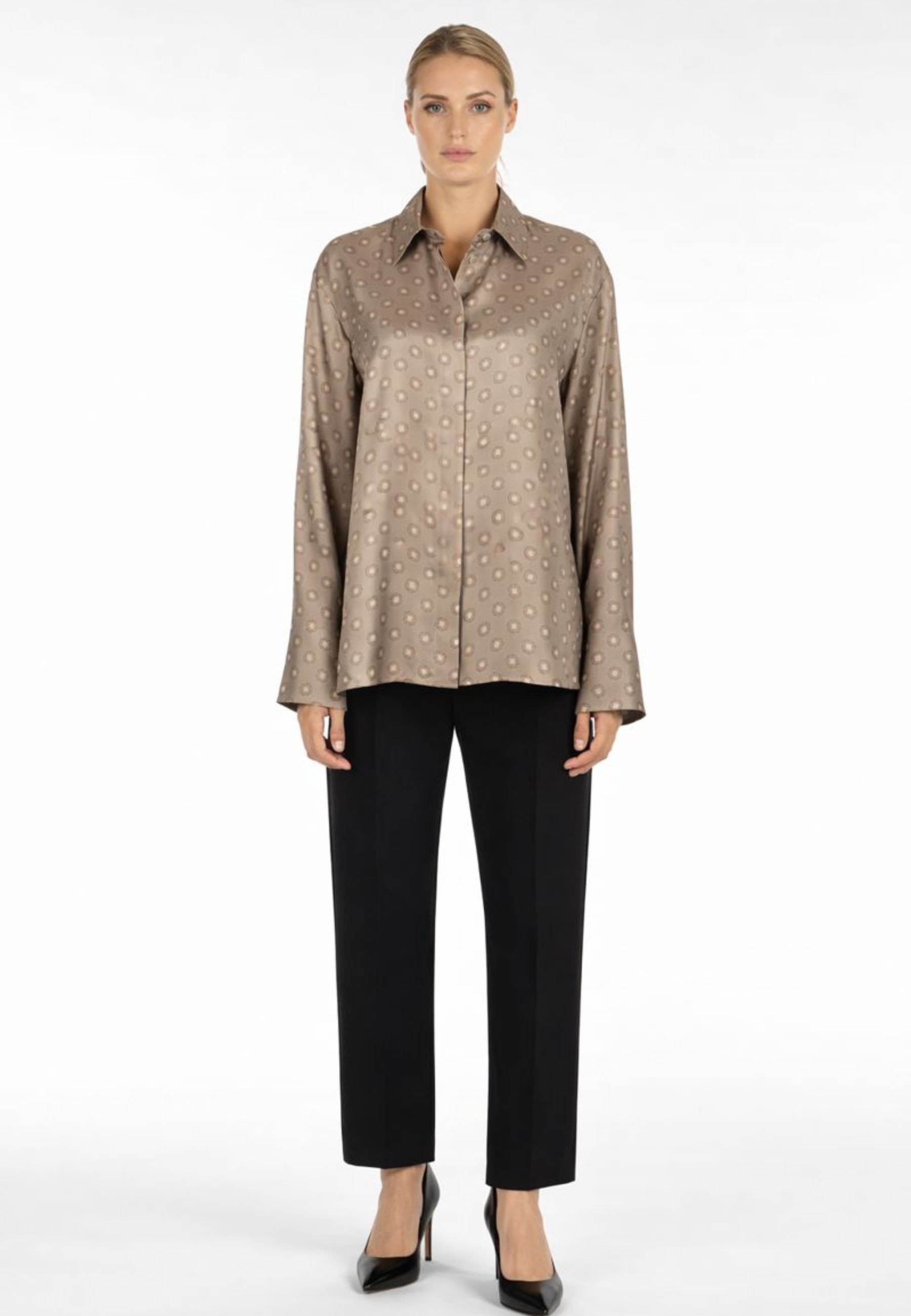 Camicia Urna realizzata in preziosa seta fluida, caratterizzata da un raffinato motivo all-over a micro disegni che conferisce al capo uneleganza discreta e sofisticata. Il modello presenta una linea morbida e femminile, con classico colletto a camicia e maniche lunghe con polsino, per una vestibilità confortevole e versatile.