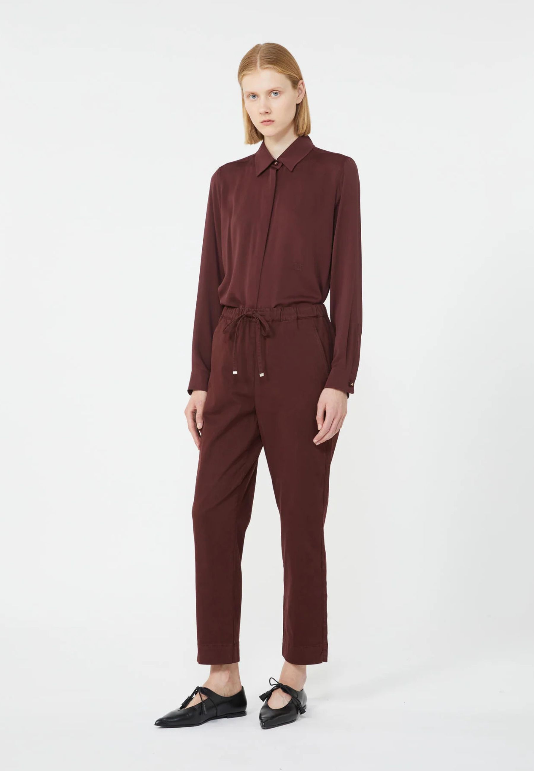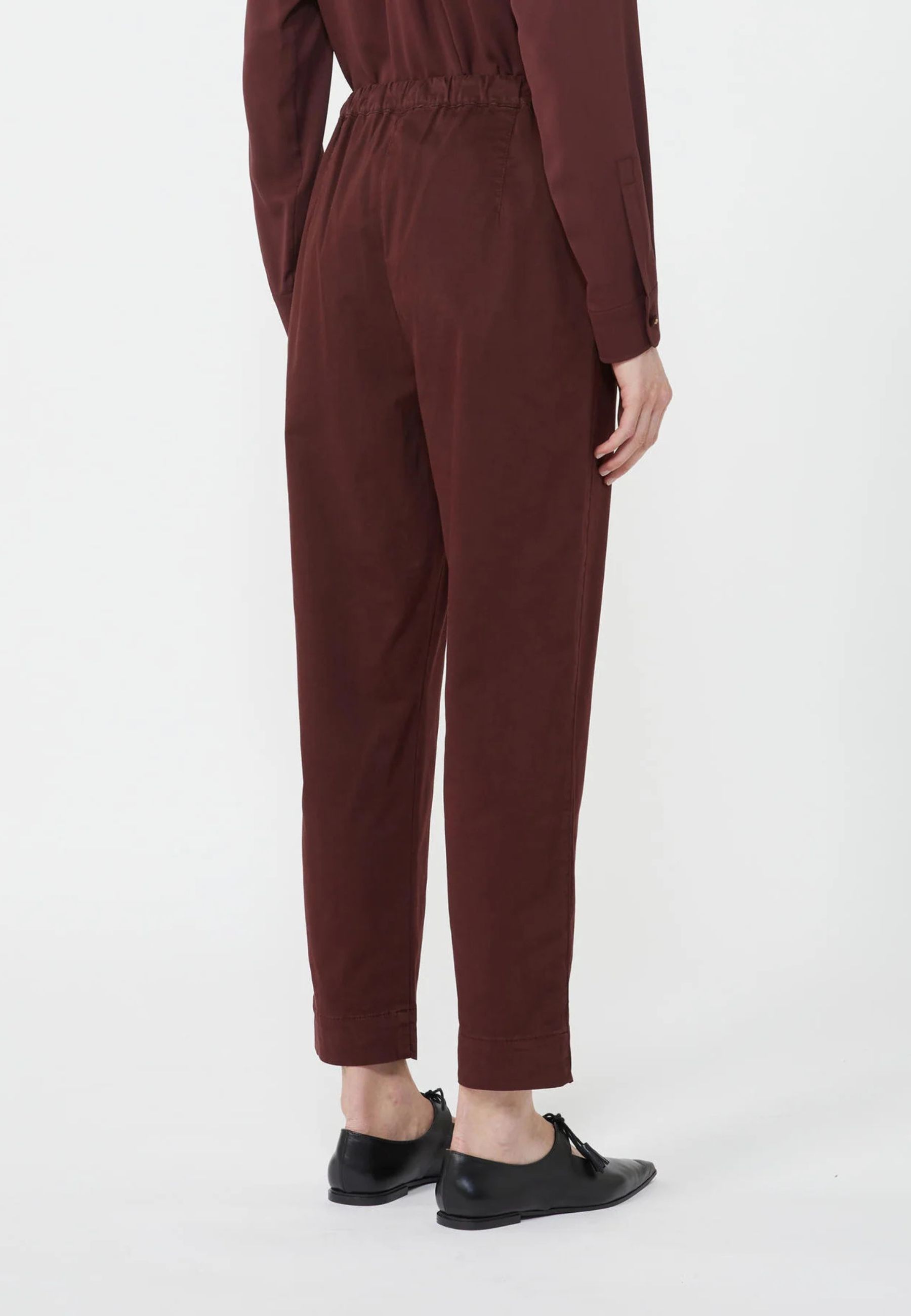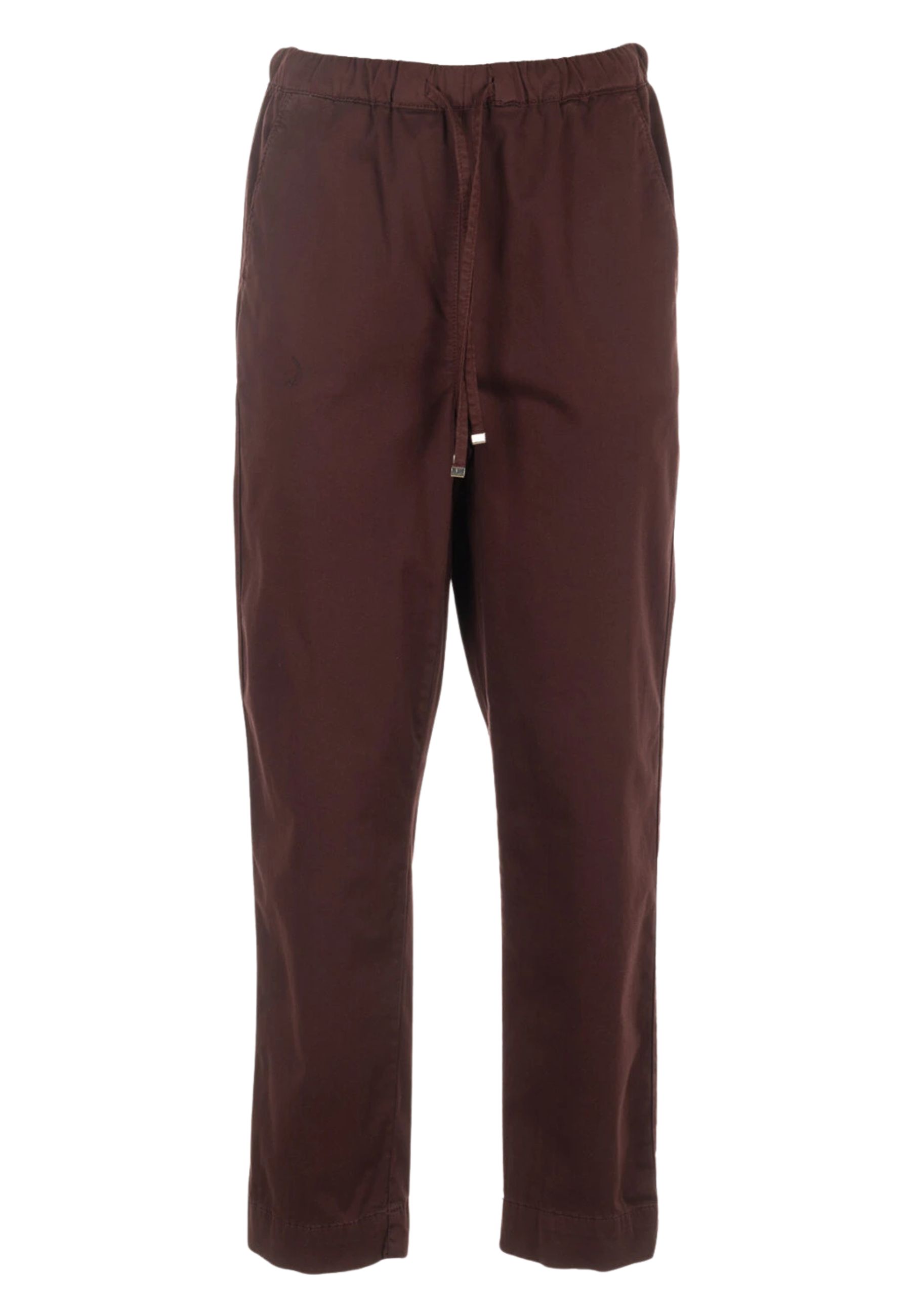 Il modello presenta vita elasticizzata con coulisse regolabile, dettaglio che assicura una vestibilità pratica e confortevole. La linea è morbida e leggermente affusolata, con lunghezza alla caviglia, ideale per un look casual raffinato e versatile.