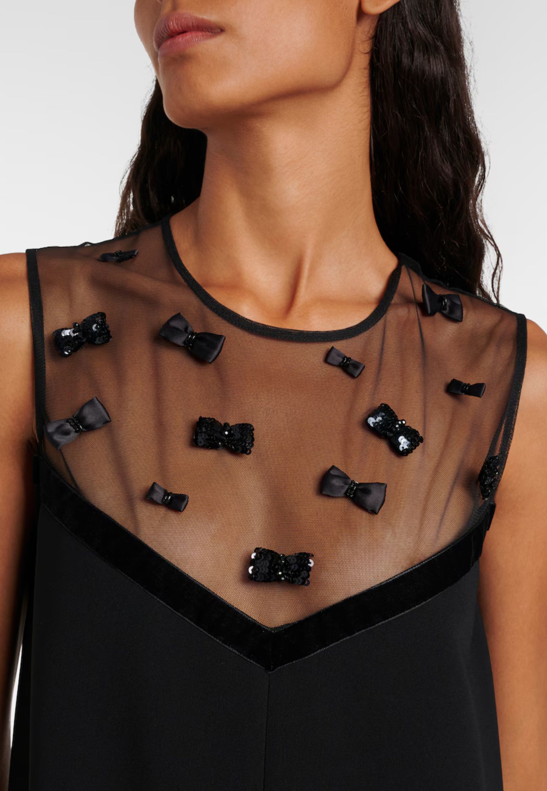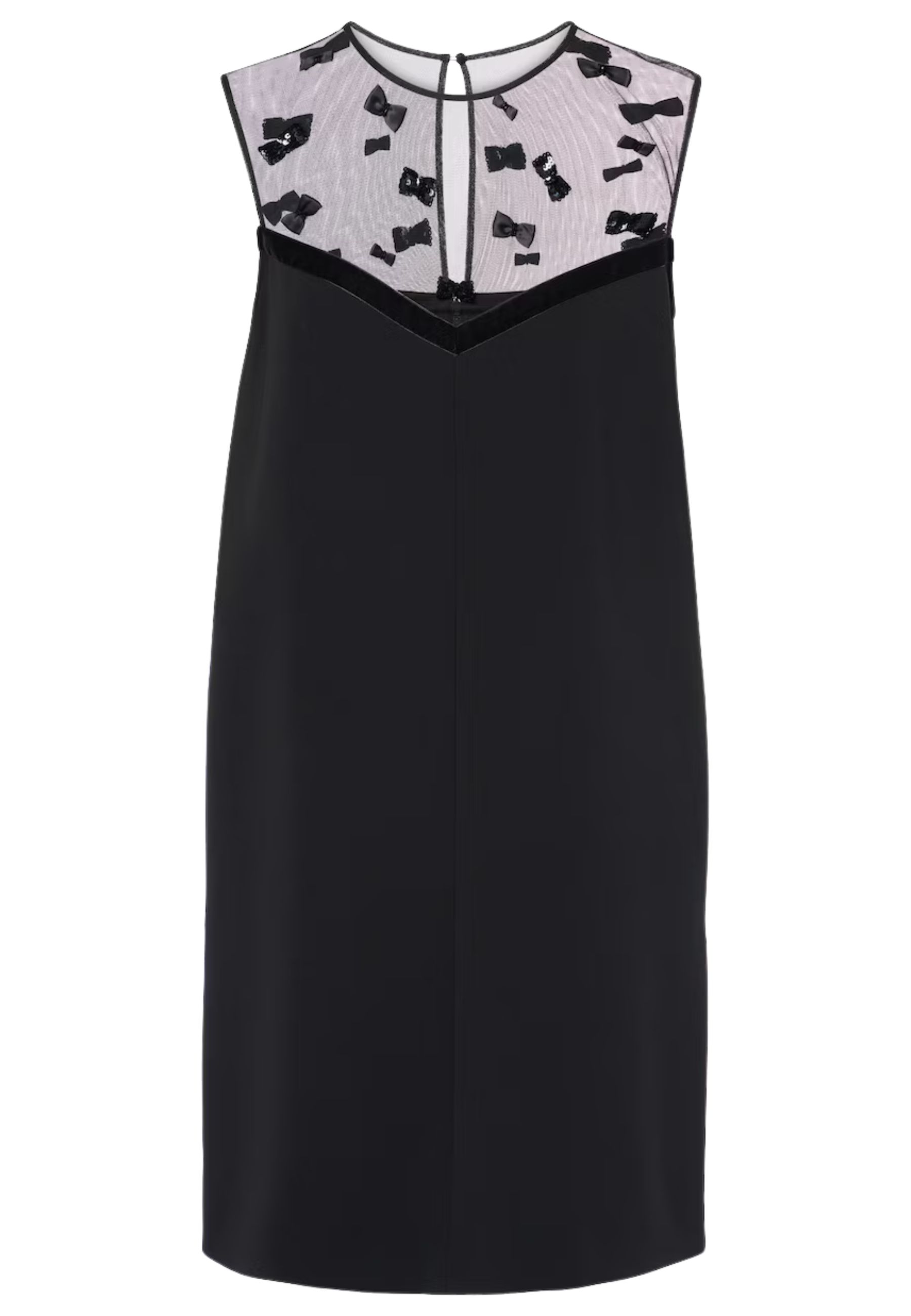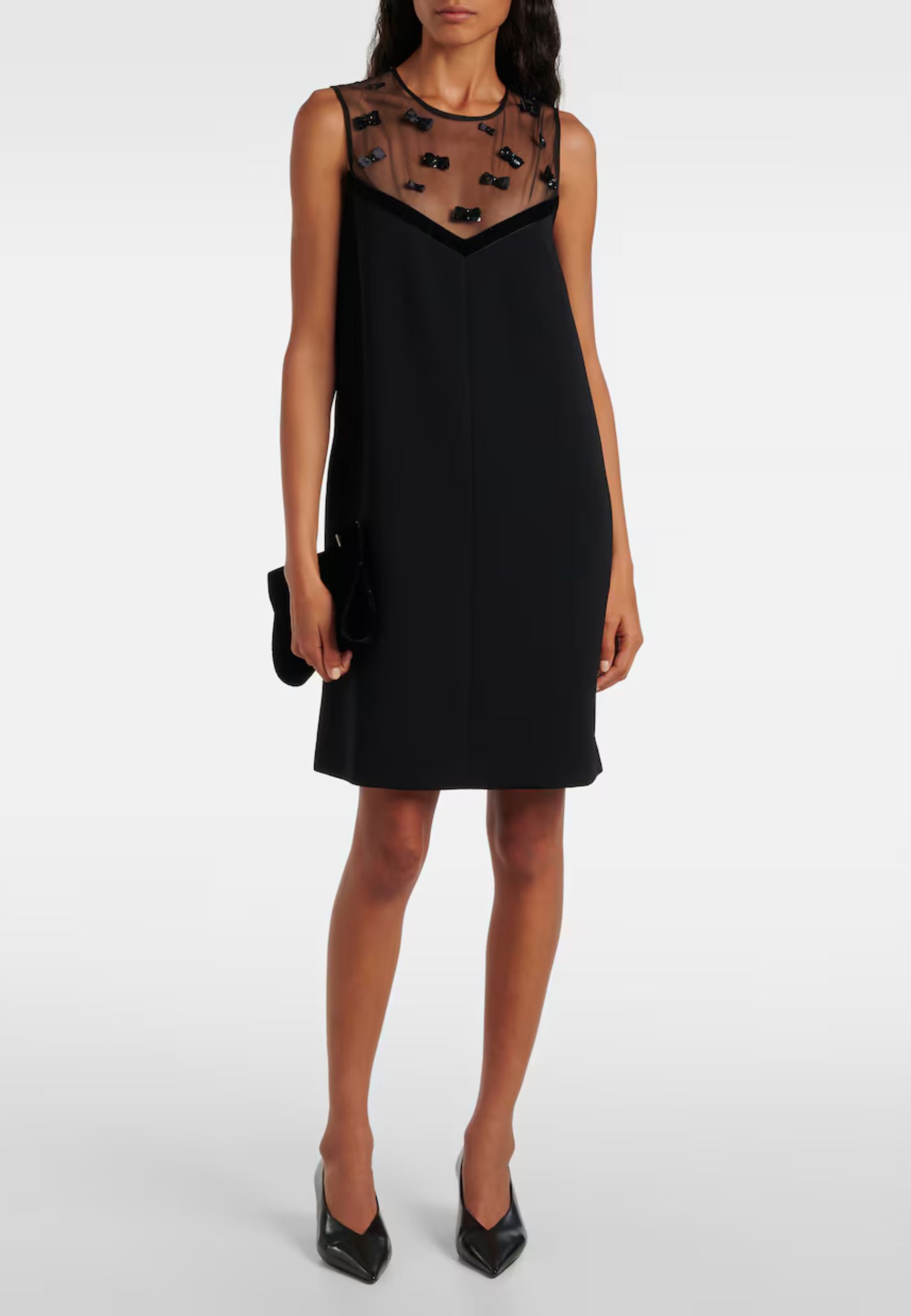 Il taglio dritto valorizza la silhouette con eleganza, mentre lo scollo arrotondato con inserto trasparente aggiunge un tocco sensuale ma misurato. La chiusura con cerniera invisibile e bottone sul retro garantisce una vestibilità impeccabile e una finitura pulita.