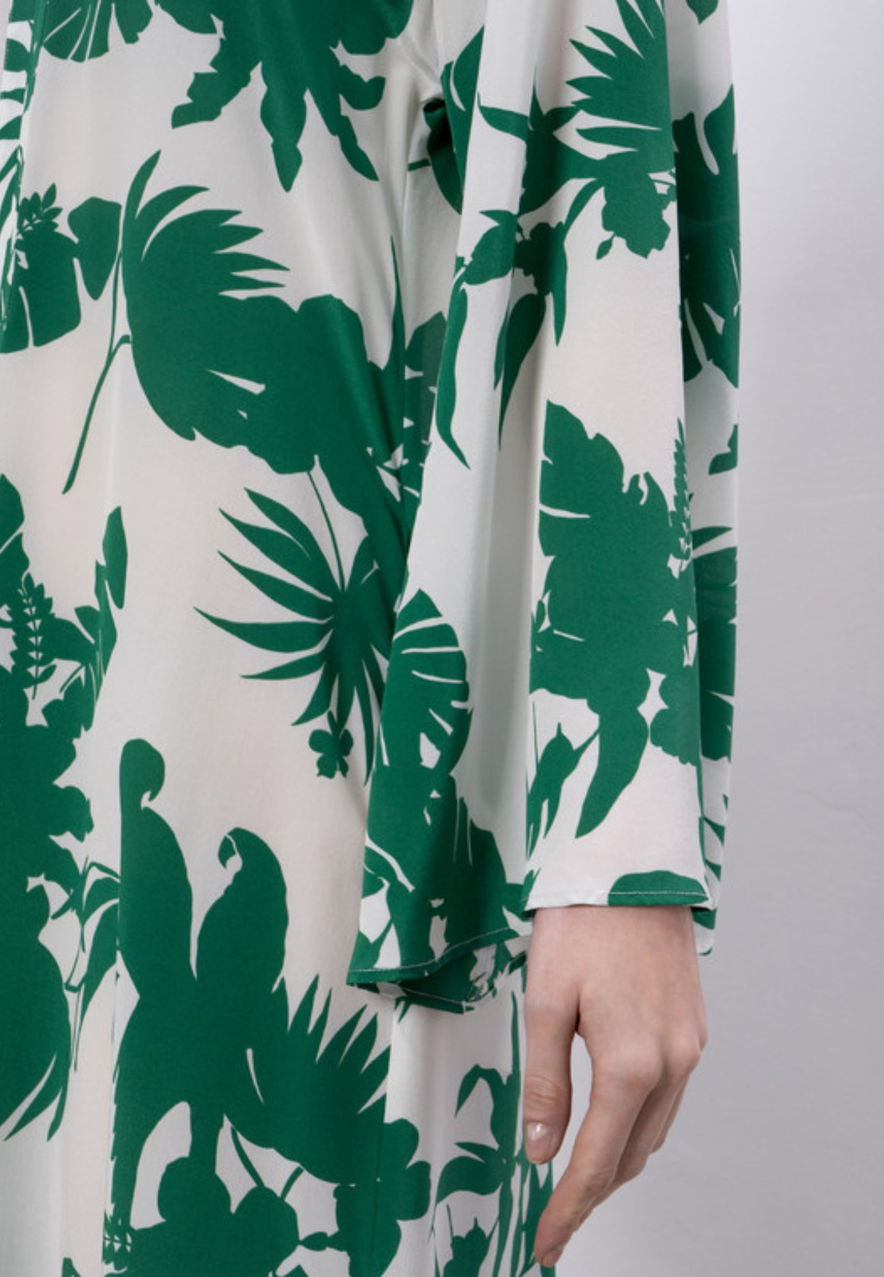Il colletto stile camicia e lapertura frontale conferiscono un tocco sartoriale e contemporaneo, bilanciando perfettamente la morbidezza del tessuto. Le maniche lunghe dalla linea ampia completano il design, garantendo comfort e una vestibilità ariosa.