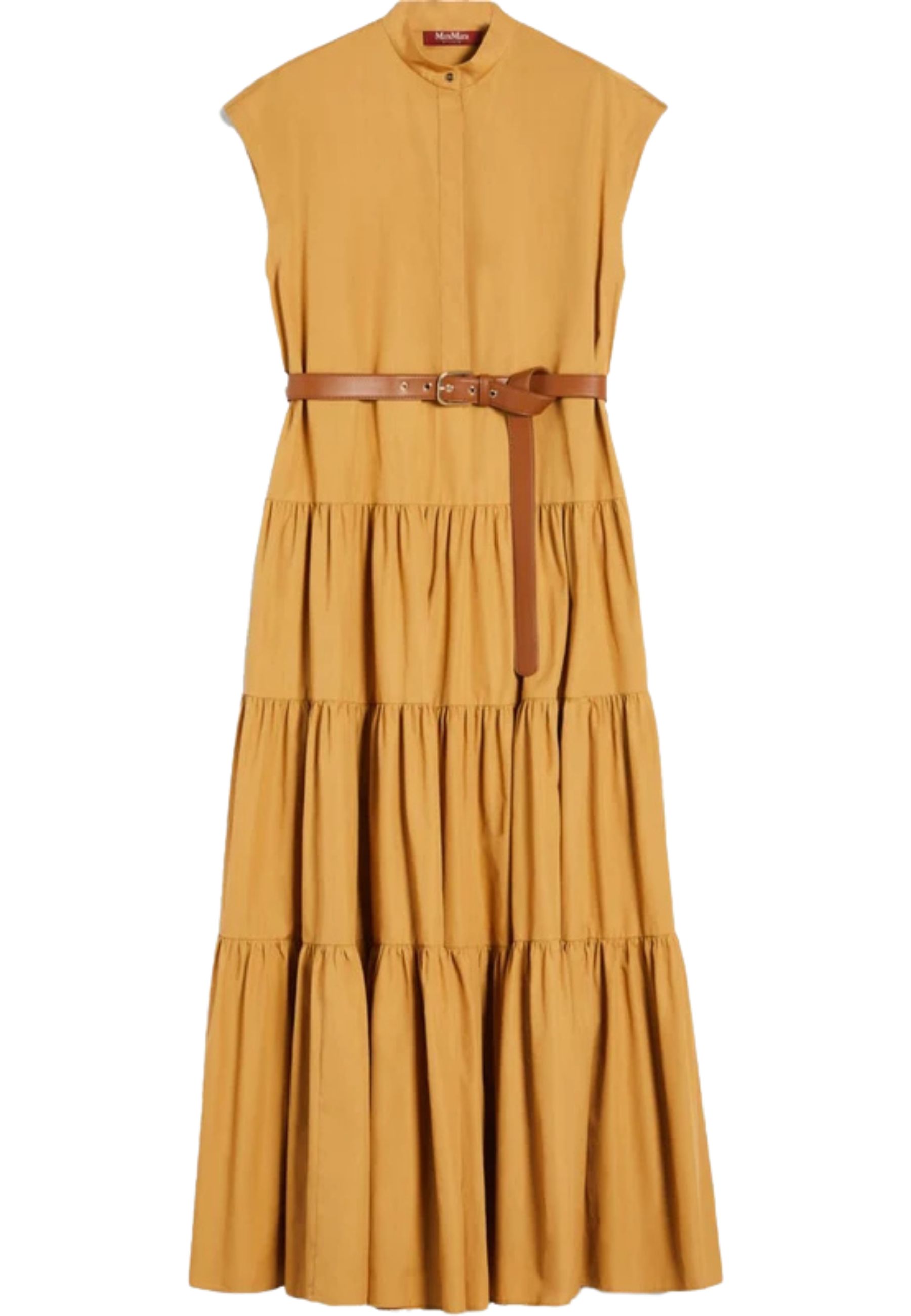 Labito lungo firmato Max Mara Studio esprime uneleganza essenziale e contemporanea, perfettamente in linea con lo stile raffinato del brand. Realizzato in tessuto fluido e leggero, si distingue per la linea pulita e la costruzione a balze che dona movimento e femminilità alla silhouette.