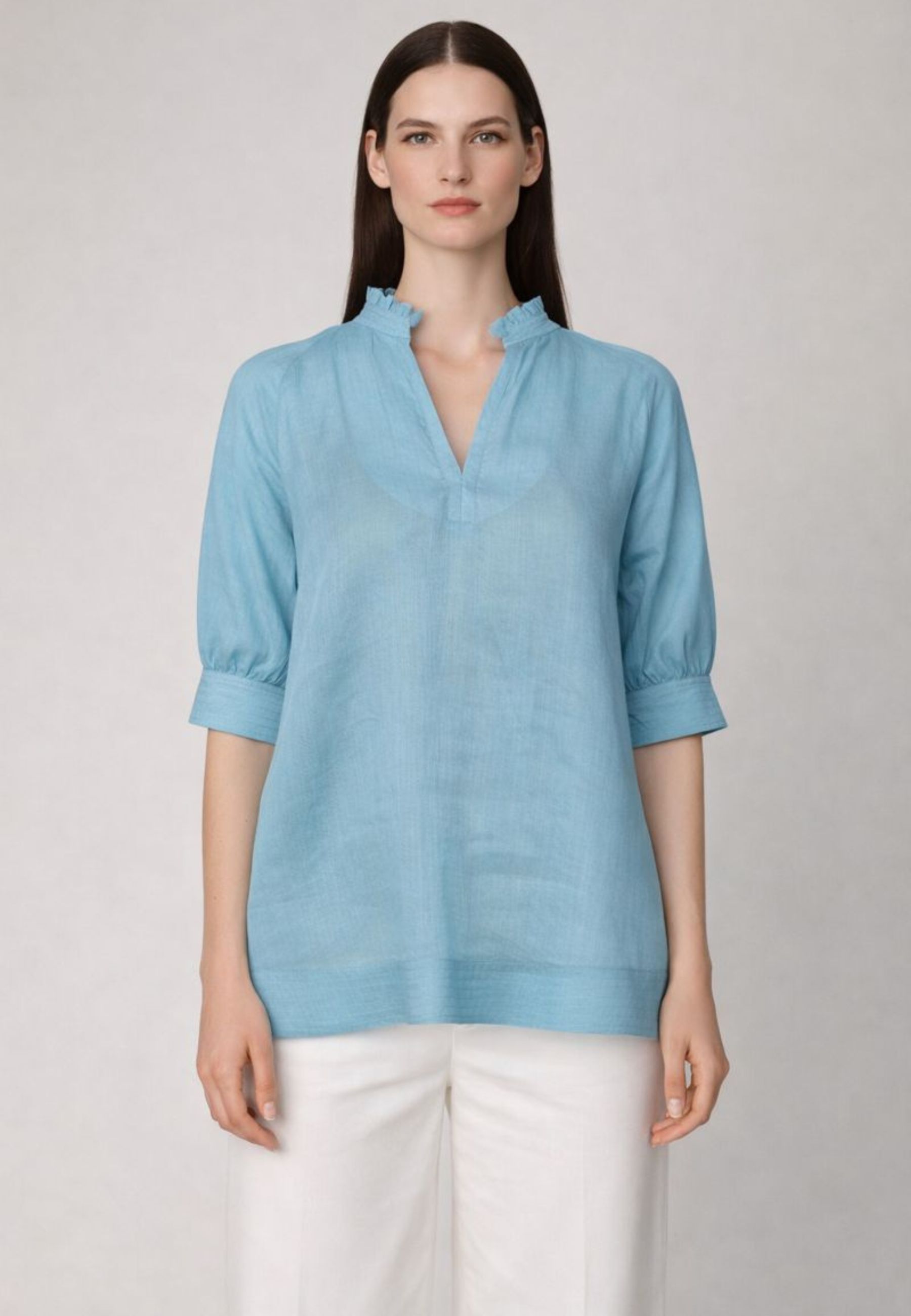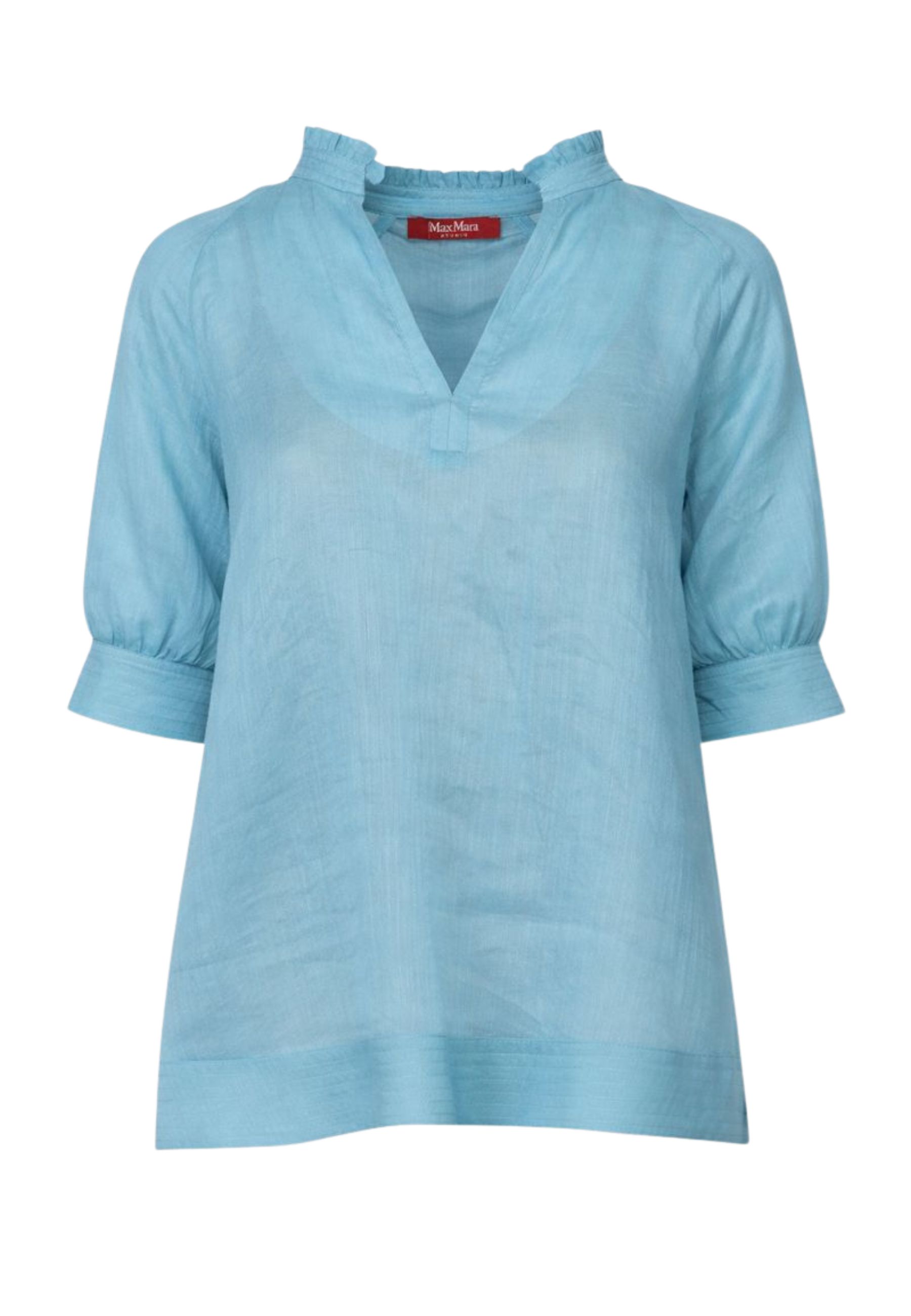 Blusa con maniche corte raglan, realizzata in leggera garza ramiè. Il modello è caratterizzato da collo in piedi con rouches, scollo a V sul davanti e polsini alti a fondo manica con doppio bottone in metallo. Rifinita con motivo di impunture sui bordi e top sottoveste abbinato in jersey.