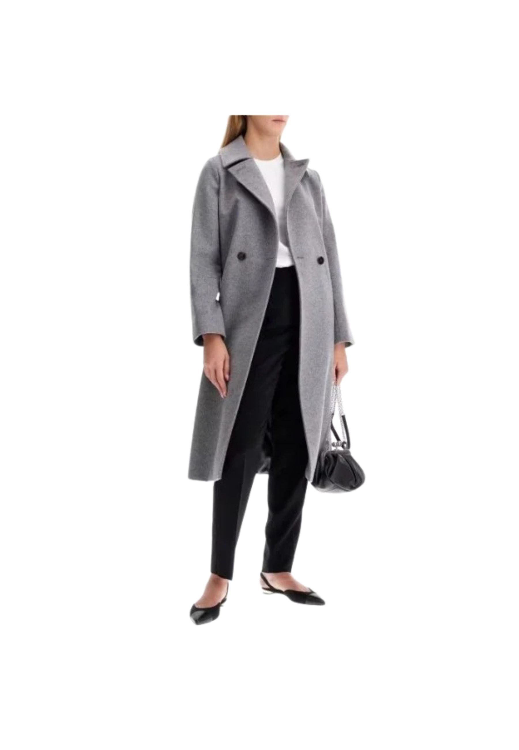 Il modello presenta una lunghezza midi con silhouette pulita e collo a camicia, elemento che conferisce al capo uno stile classico e sofisticato. La chiusura doppiopetto con bottoni nascosti mantiene il design essenziale, mentre la cintura coordinata in vita permette di valorizzare la figura e modulare la vestibilità.