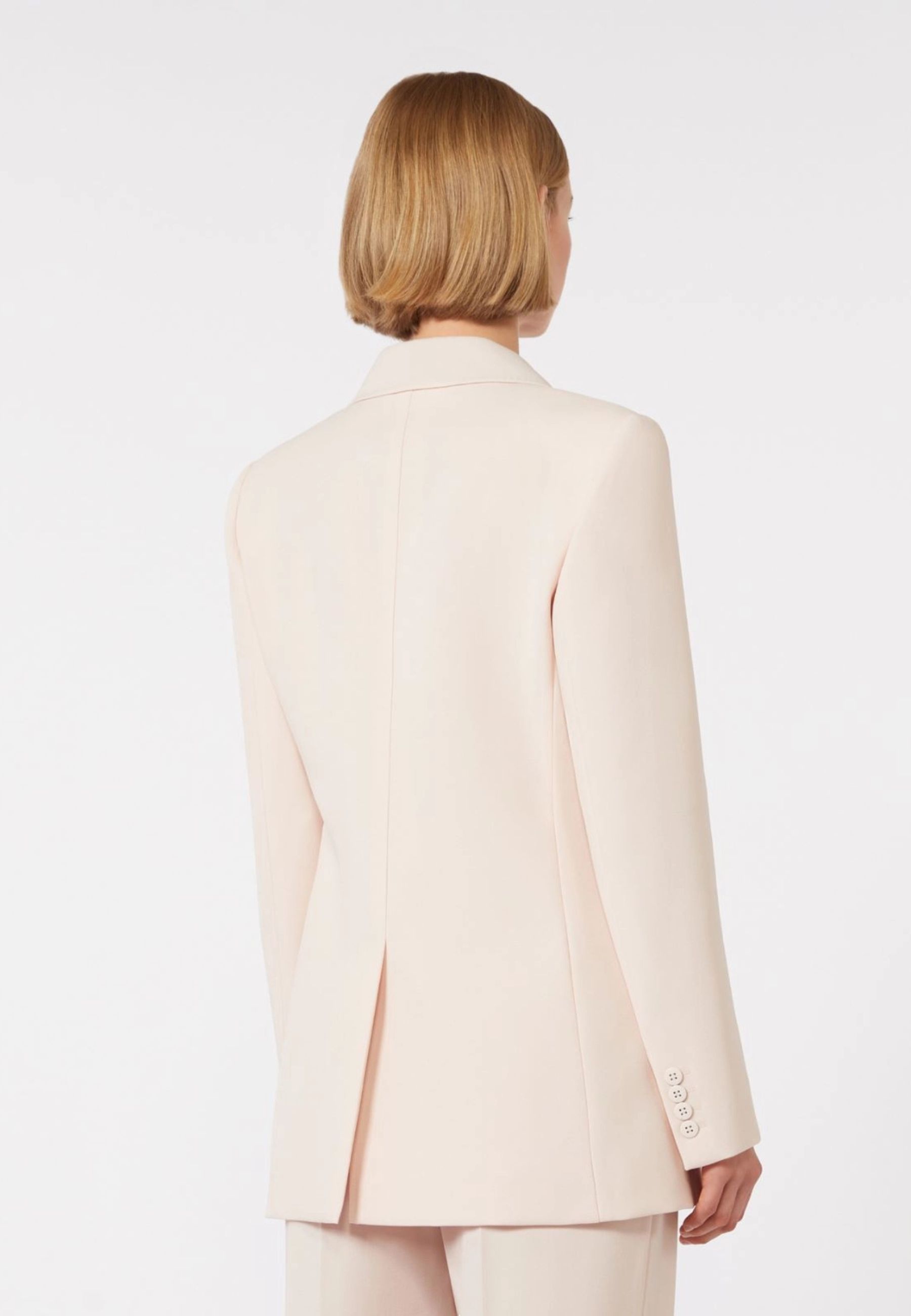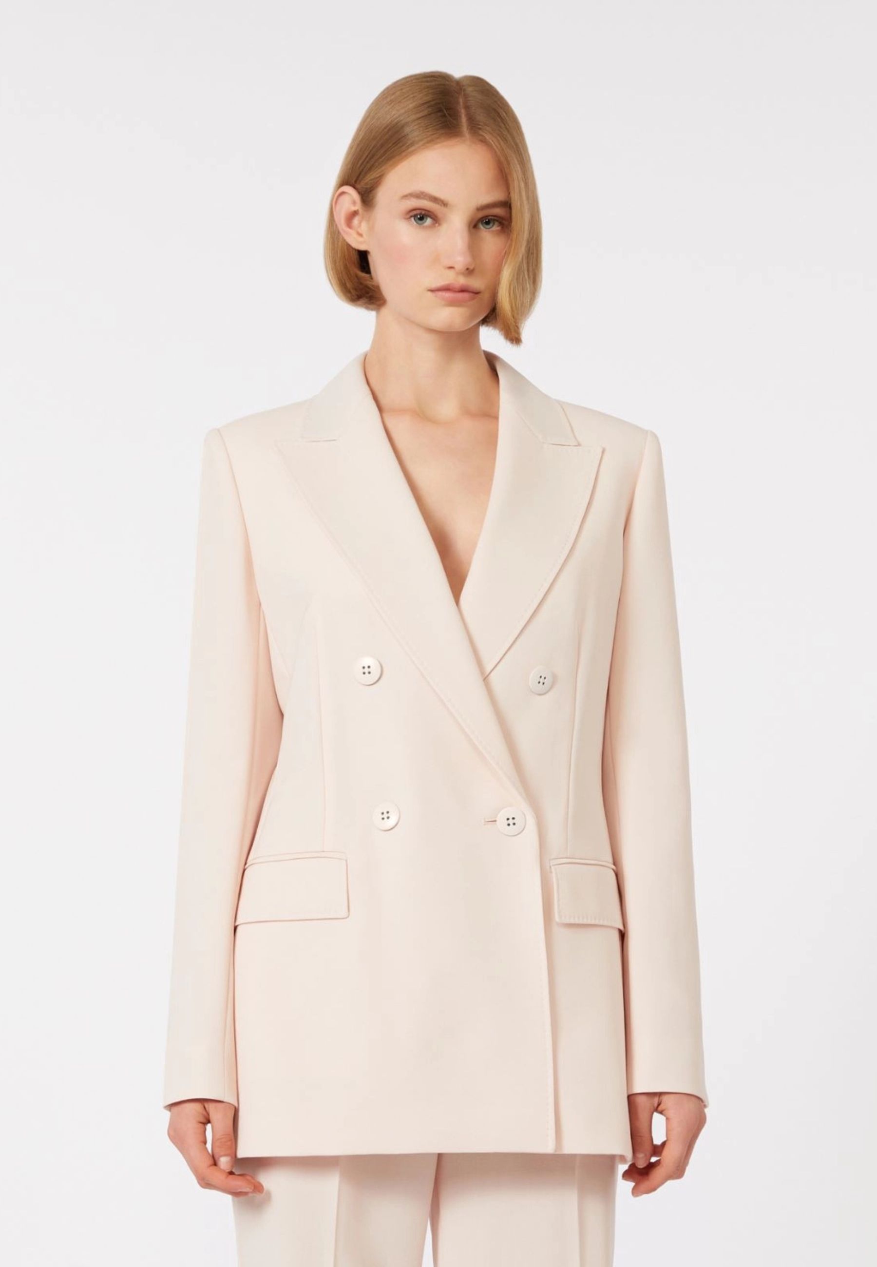 Il design presenta un raffinato collo a rever a lancia e una linea sfiancata che valorizza la figura. La chiusura frontale doppiopetto con bottoni a vista richiama leleganza del tailoring classico, mentre le tasche a filetto con patta applicata sul davanti completano il modello con un dettaglio funzionale e sofisticato. Sul retro è presente uno spacco centrale che garantisce maggiore libertà di movimento. Il blazer è completamente foderato per assicurare una vestibilità confortevole e una struttura impeccabile.